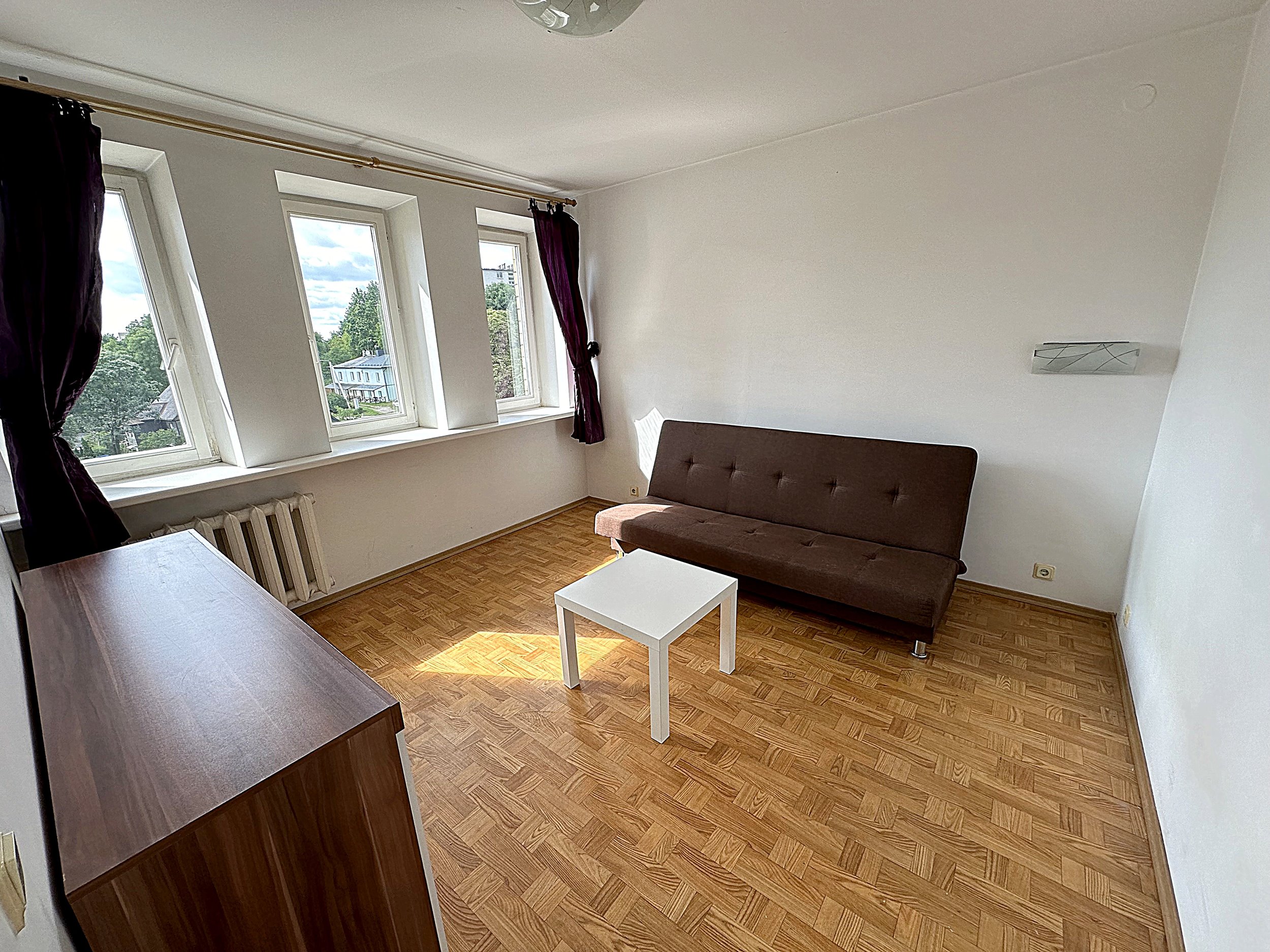 Buto išplanavimas: erdvi svetainė, miegamasis, virtuvė, vonia ir WC kartu, įstiklinta didelė lodžija.