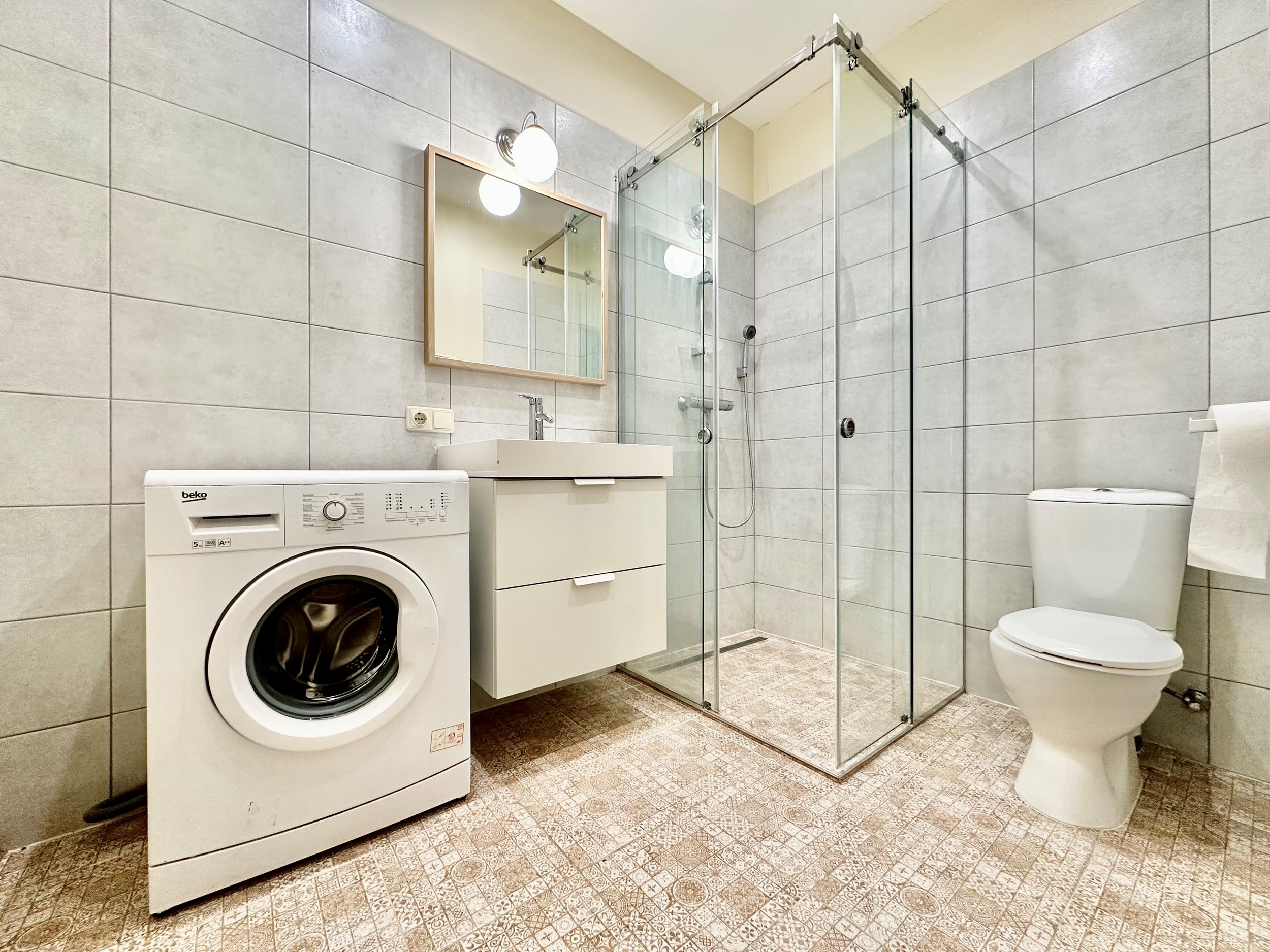 Bute yra visi reikalingiausi baldai: skalbimo mašina, šaldytuvas su šaldikliu, kaitlentė ir t.t.