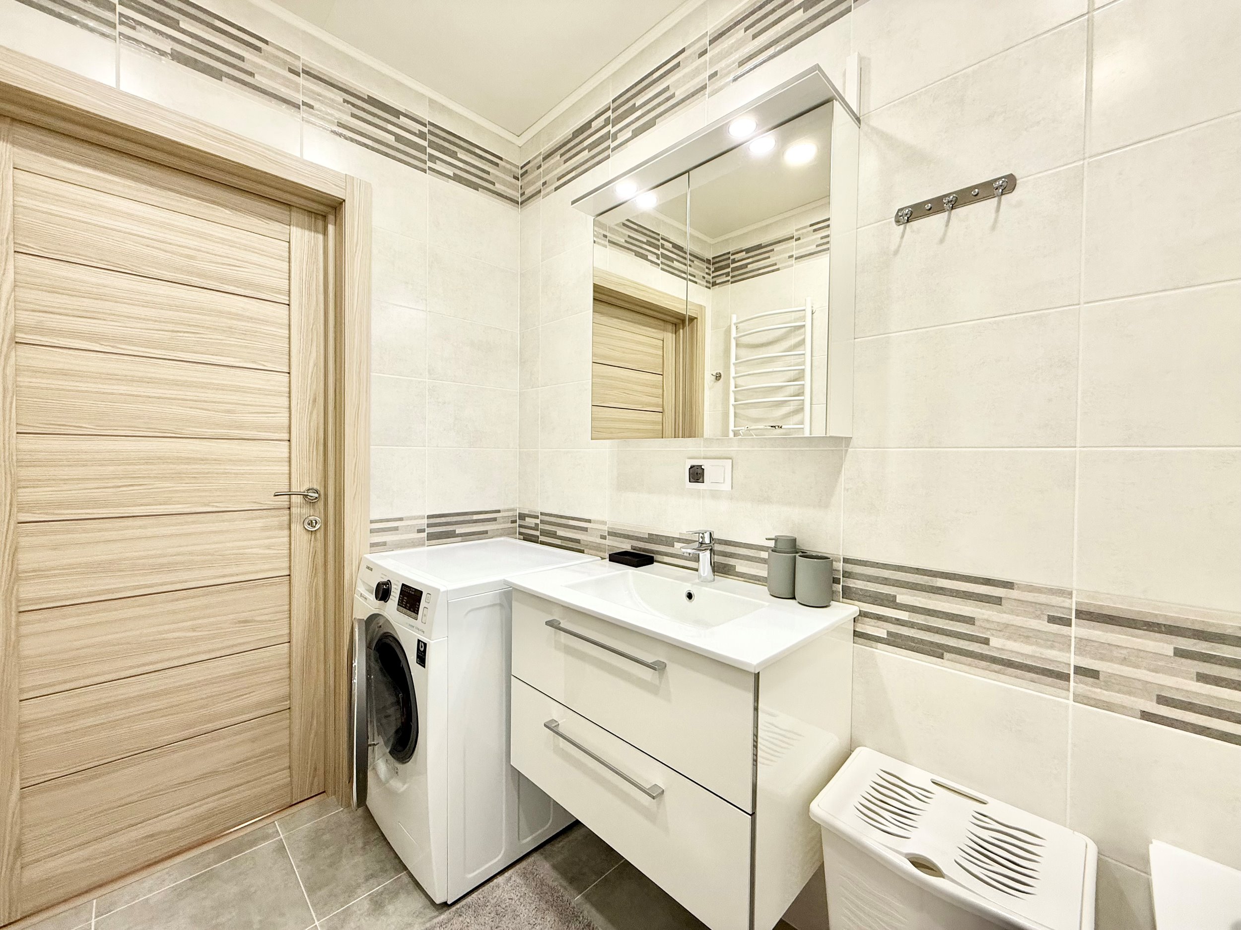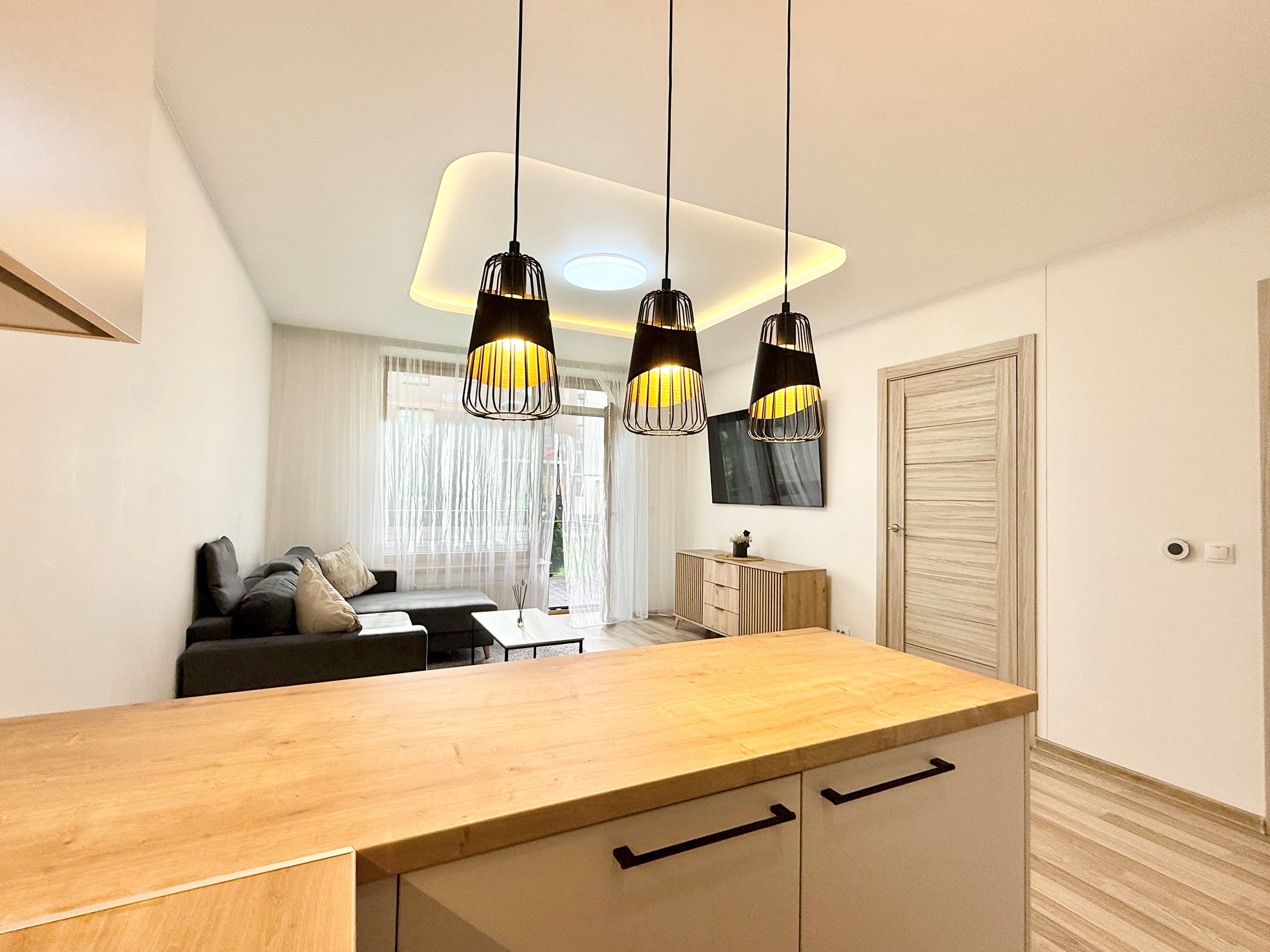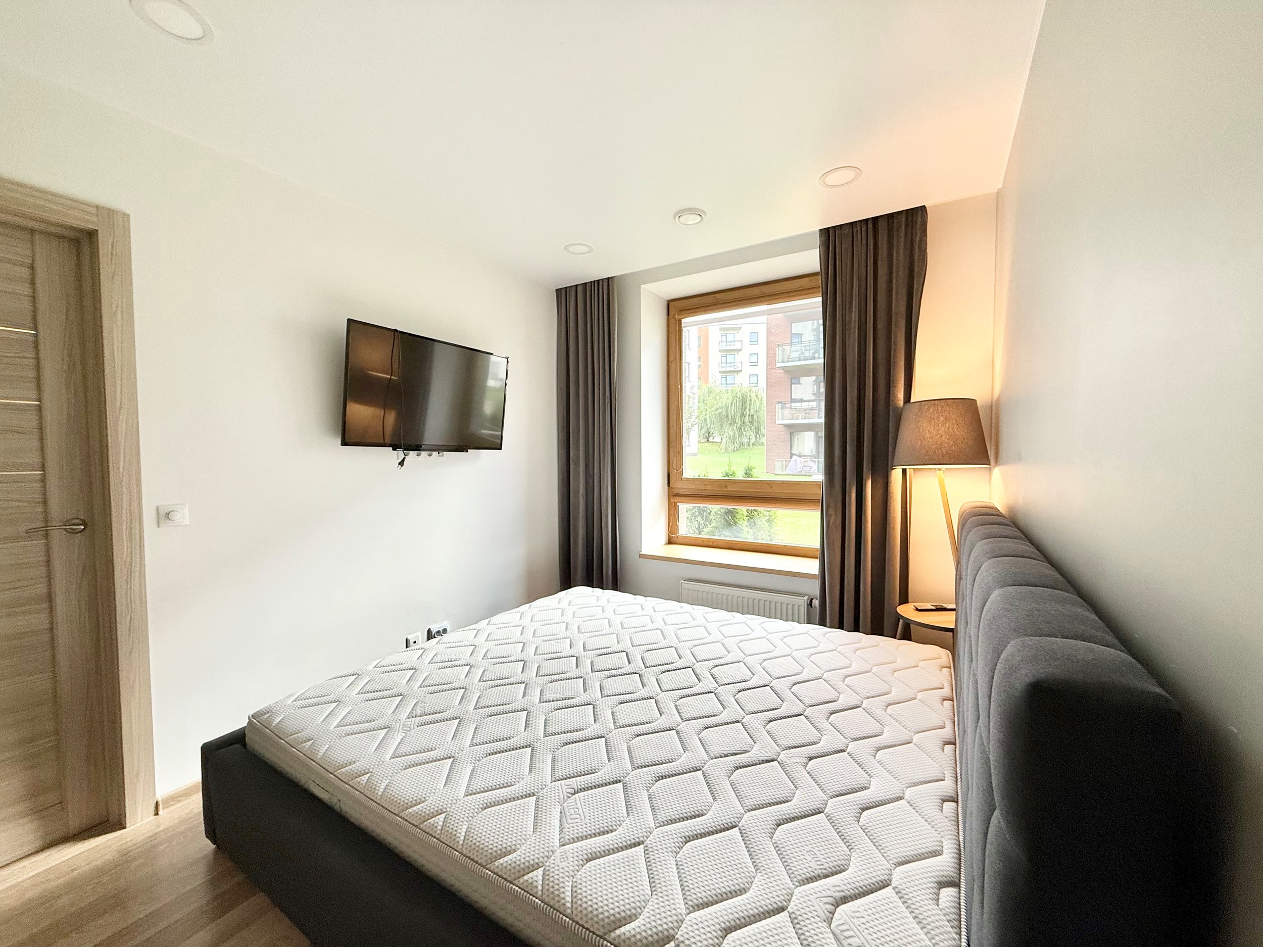 Bute yra visi reikalingiausi baldai, sofa-lova, skalbimo mašina su džiovykle, šaldytuvas su šaldikliu, viryklė, ir t.t.