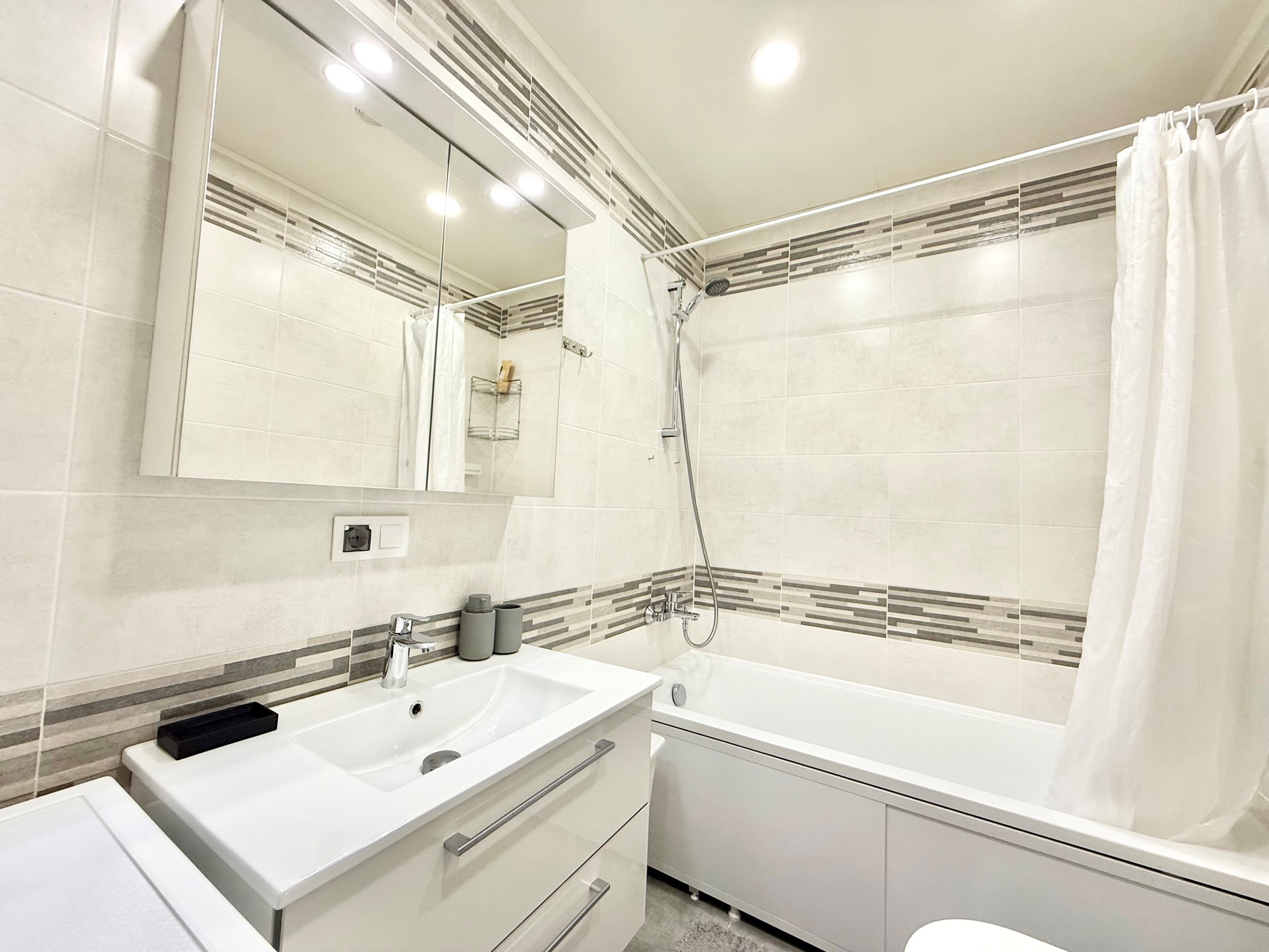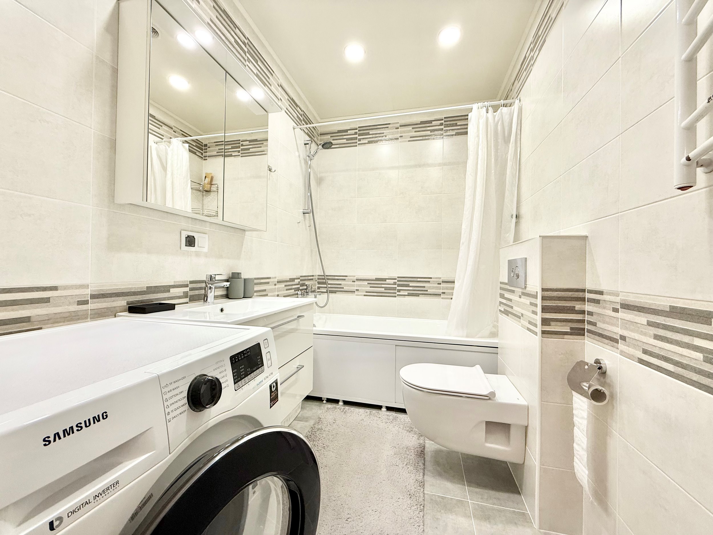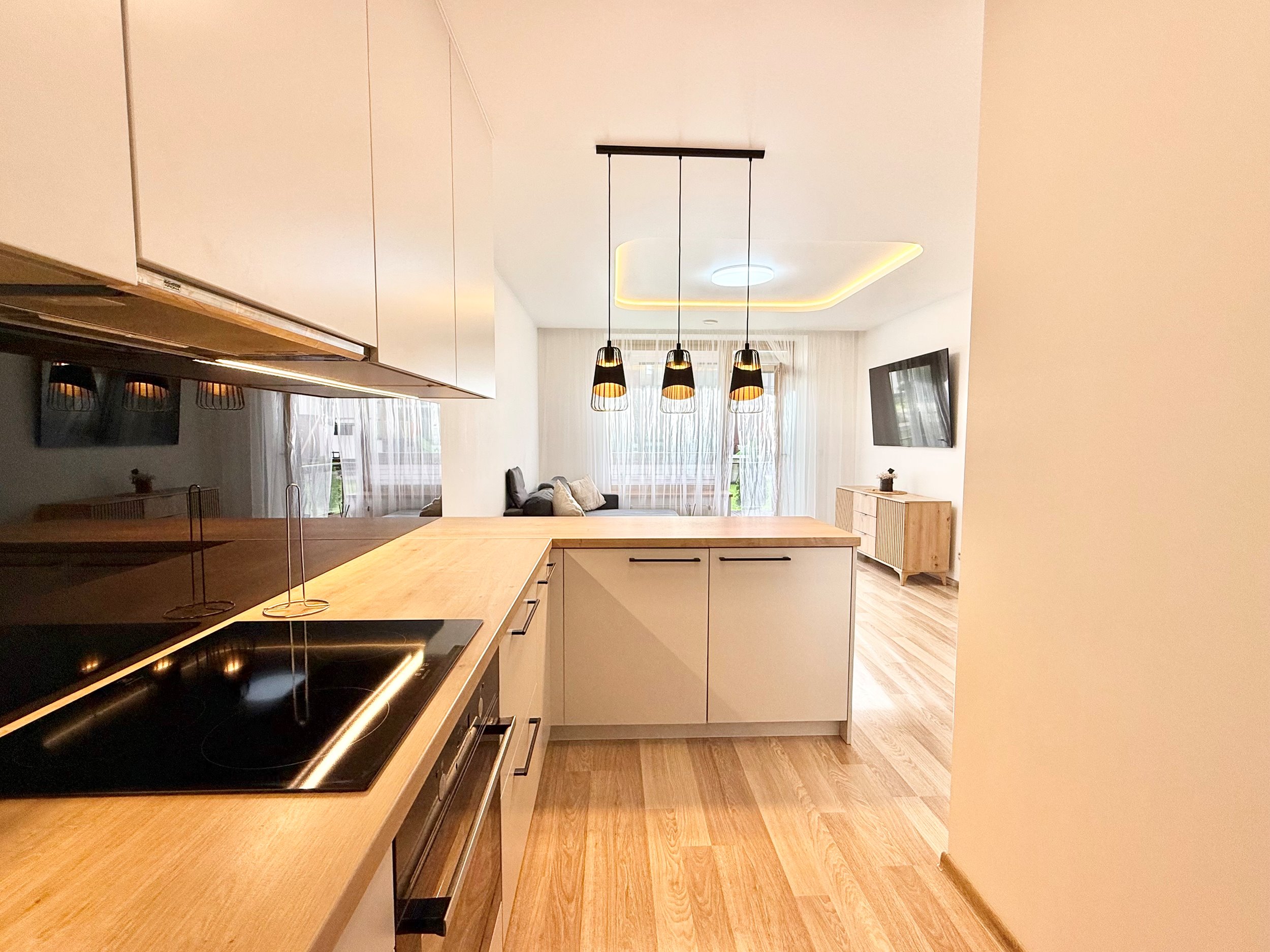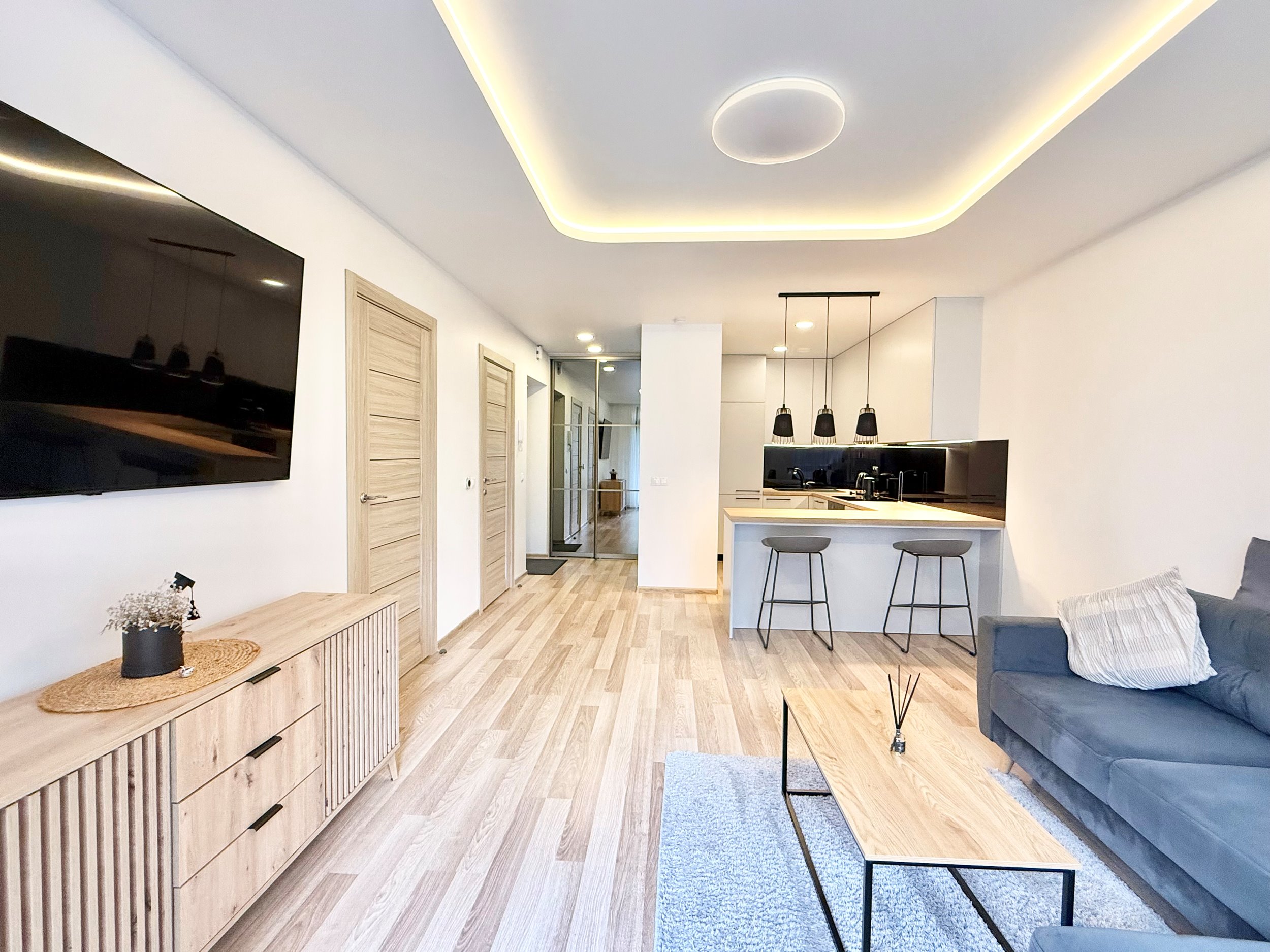 Bute yra visi reikalingiausi baldai, sofa-lova, skalbimo mašina su džiovykle, šaldytuvas su šaldikliu, viryklė, ir t.t.