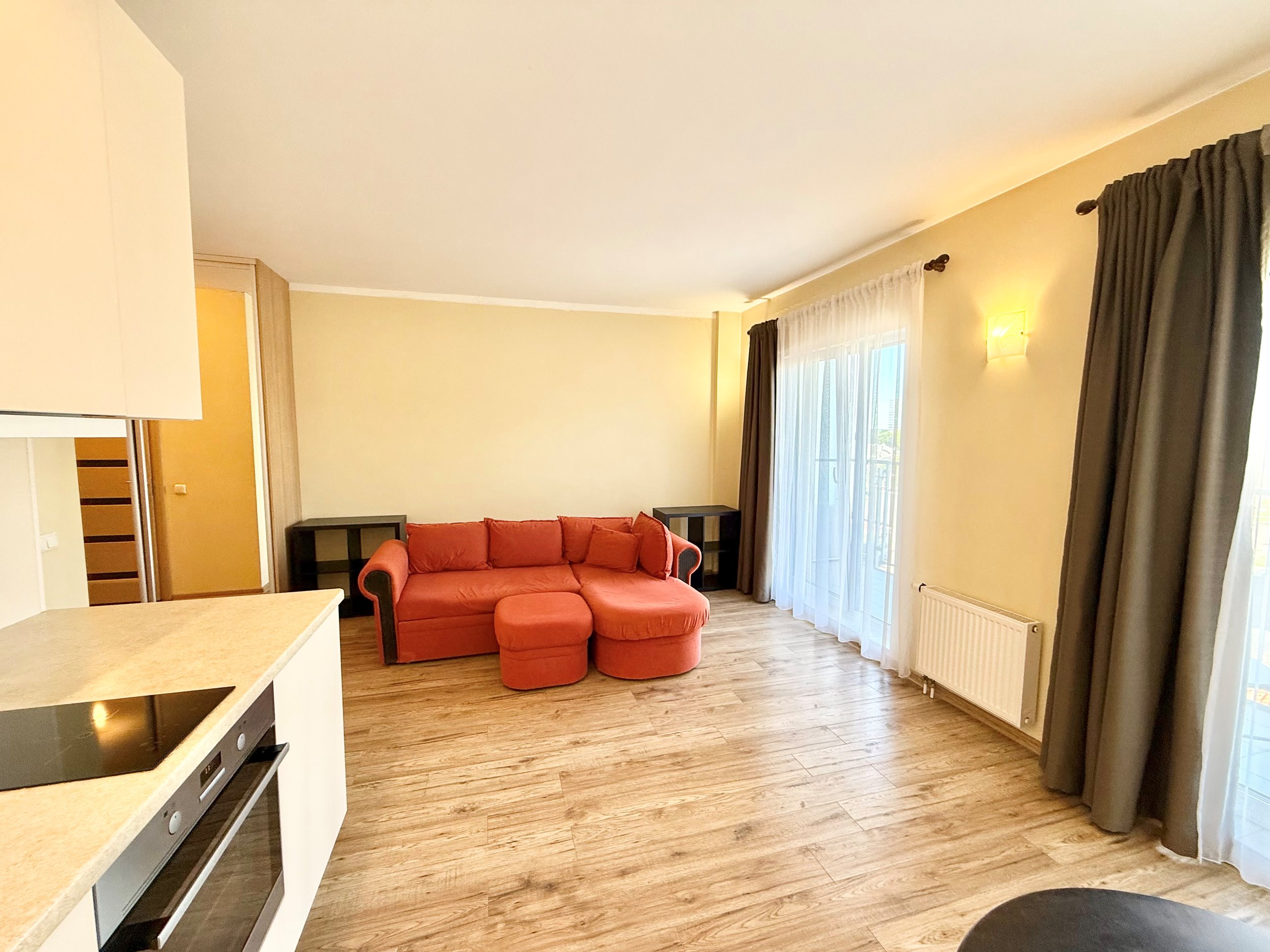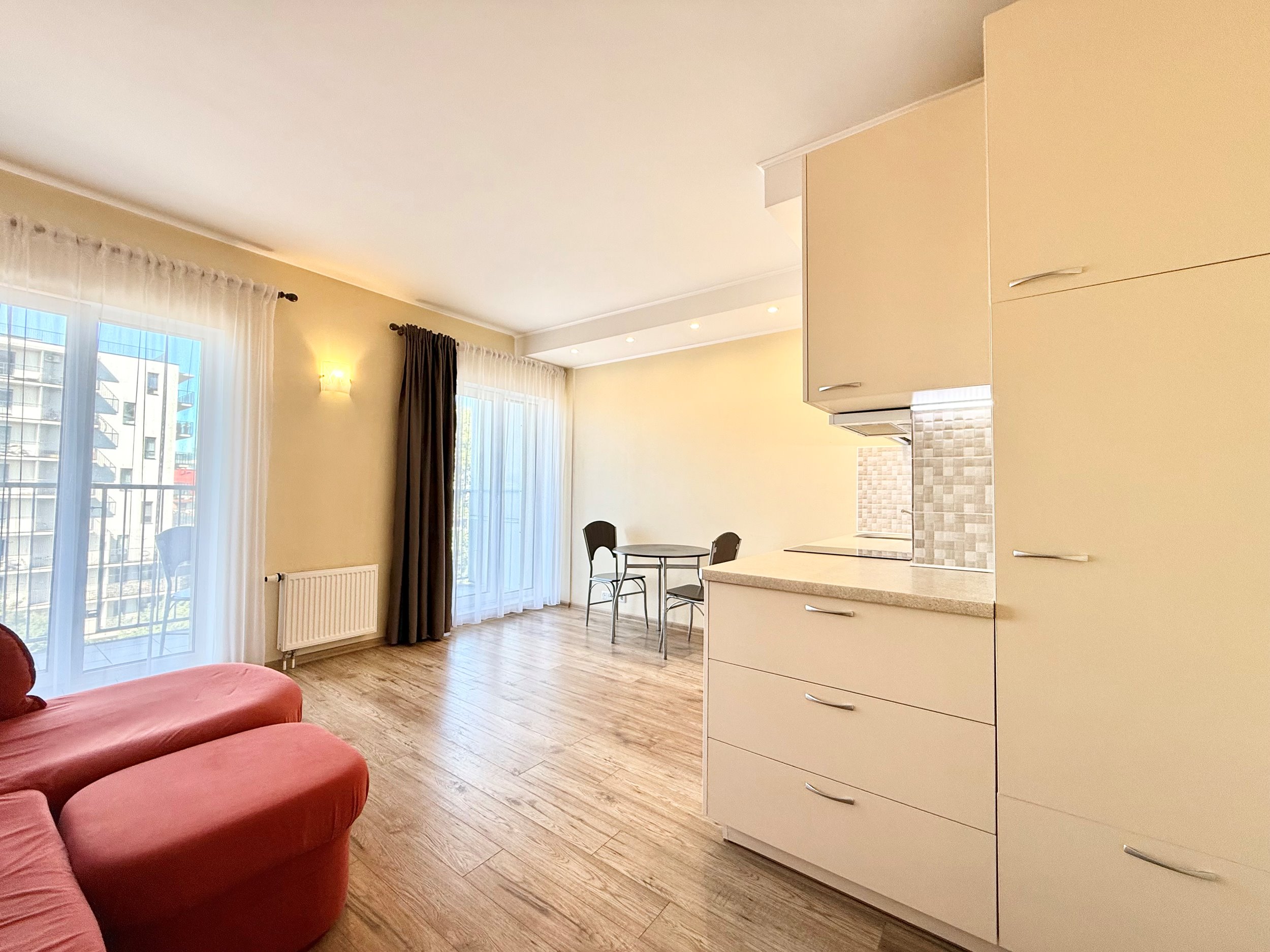 Išplanavimas: virtuvė/svetainė/miegamasis, vonios kambarys su dušu, balkonas. Taip pat yra dviračių saugykla.