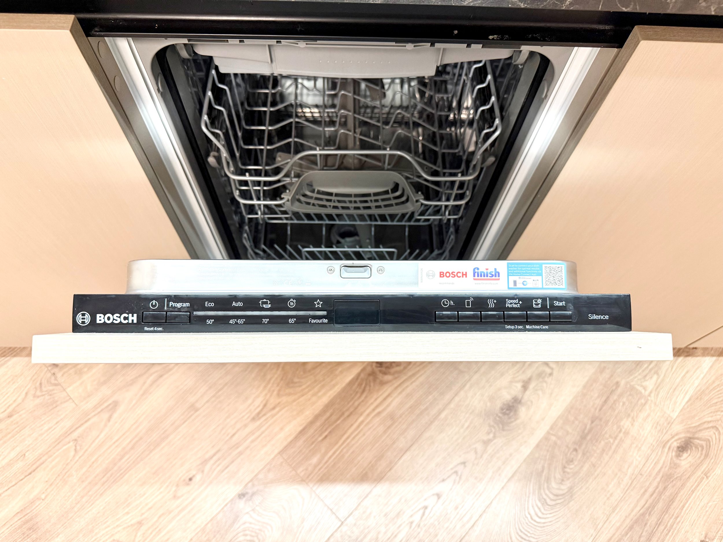 Bute yra visi reikalingiausi baldai, sofa-lova, skalbimo mašina, indaplovė, šaldytuvas su šaldikliu, viryklė ir t.t.