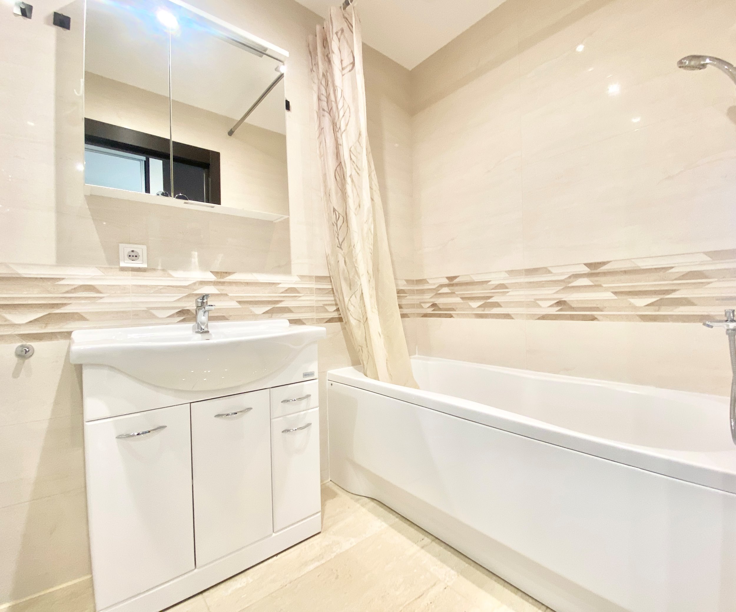 Bute yra visi reikalingiausi baldai, erdvi spinta, skalbimo mašina, šaldytuvas su šaldikliu, viryklė ir t.t.