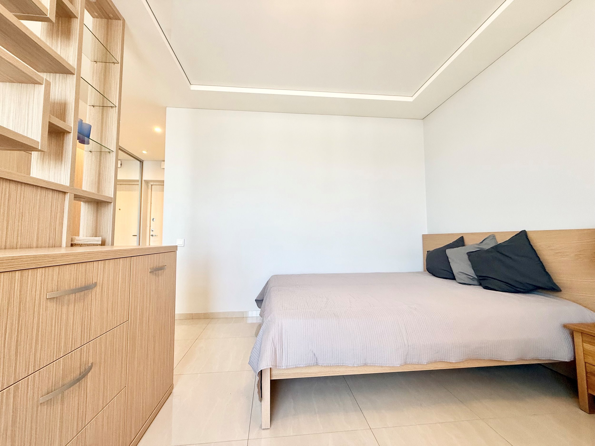 Išplanavimas: svetainė/virtuvė, miegamojo erdvė, vonios kambarys ir dušas kartu.