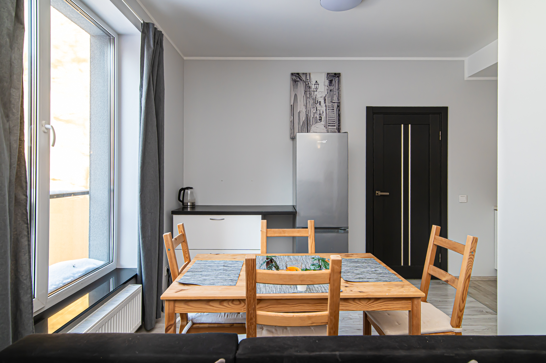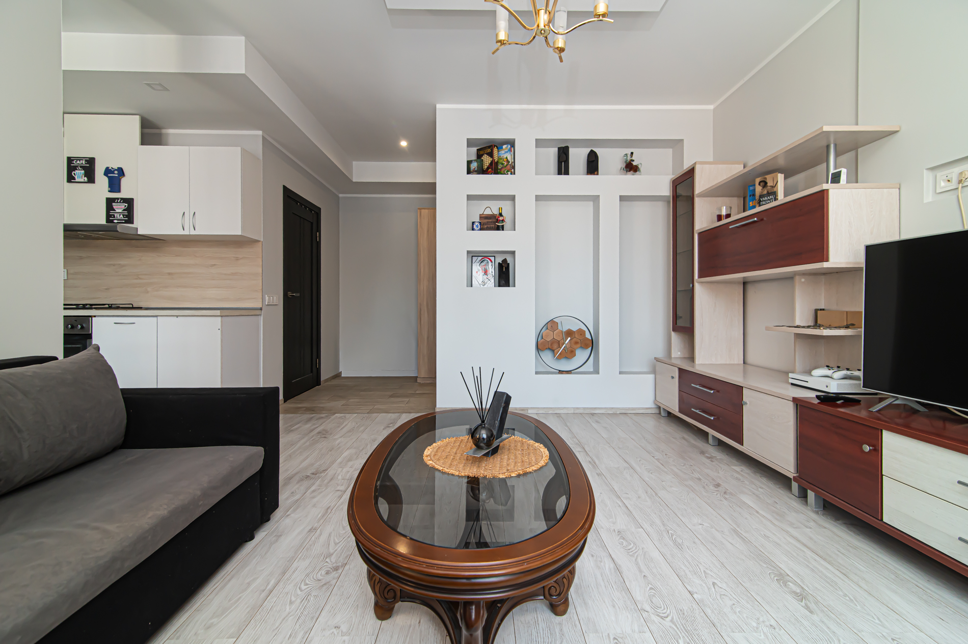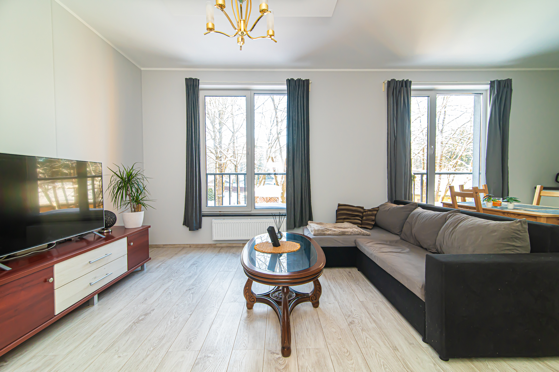 58,45 kv. m išmintingai suplanuotos erdvės – šviesi svetainė kartu su virtuve, kurioje kava rytais kvepia šiek tiek stipriau nei kitur, ir tylus atskiras miegamasis, kur už lango girdisi ne miesto triukšmas, o paukščiai.