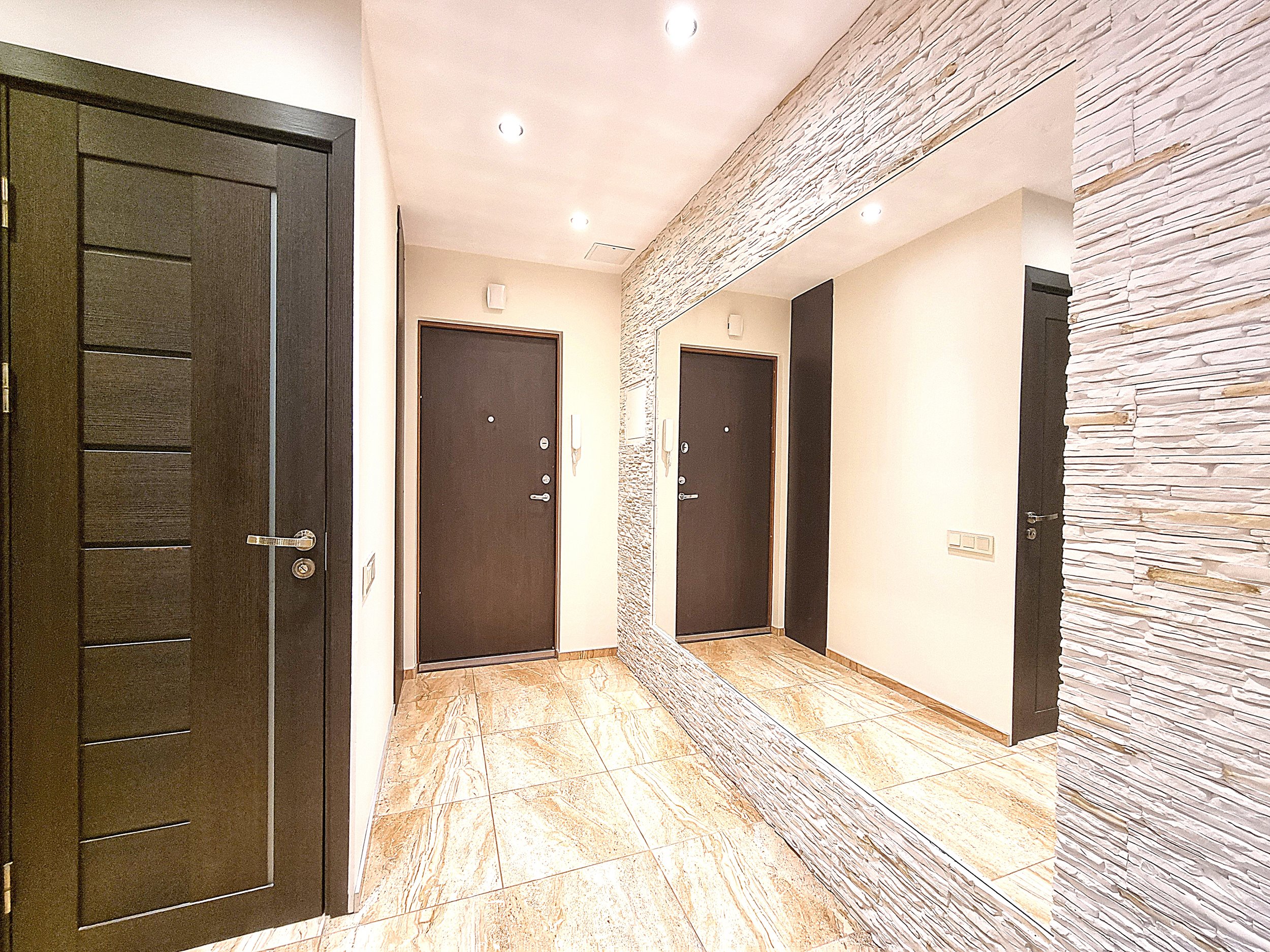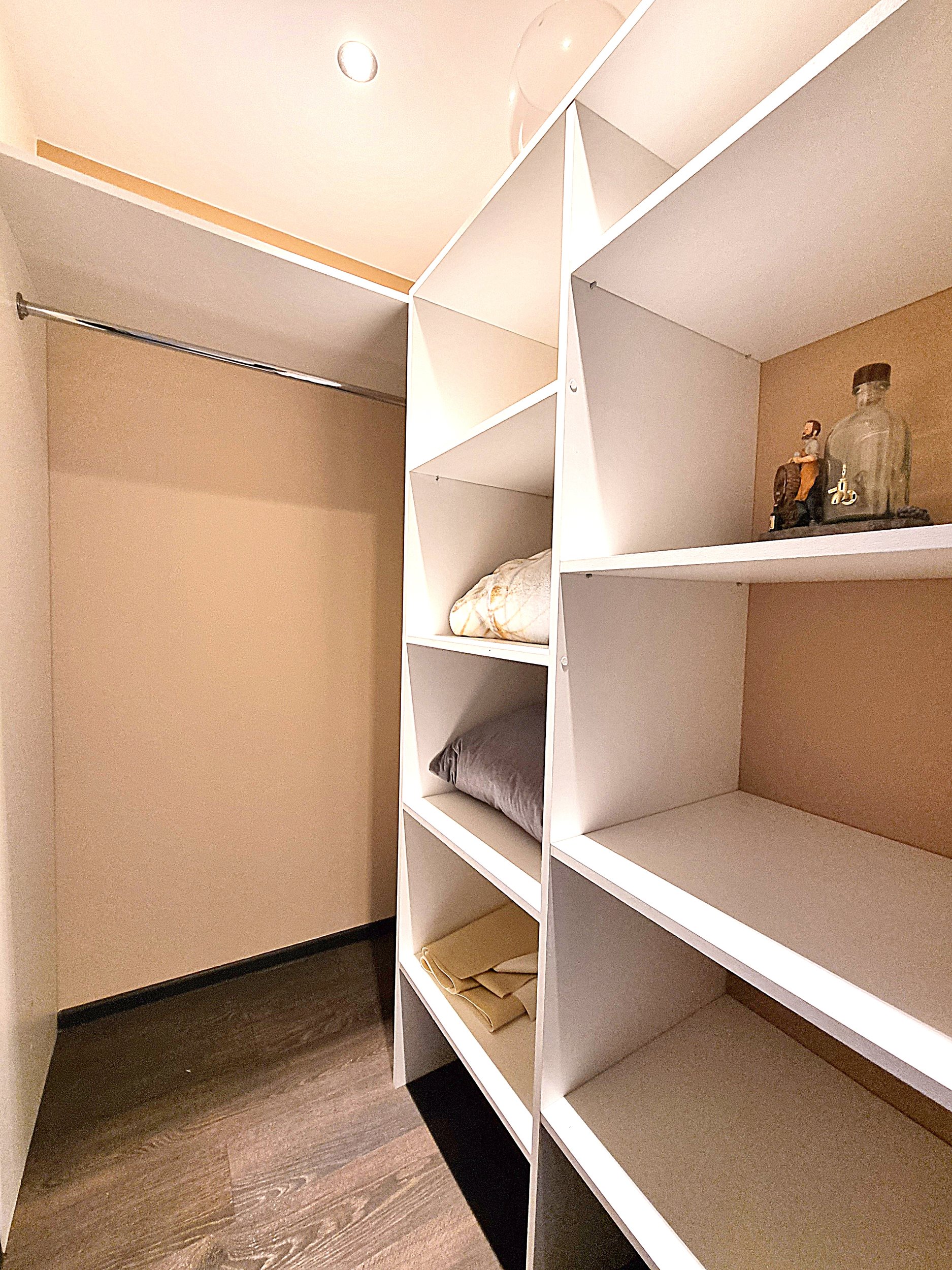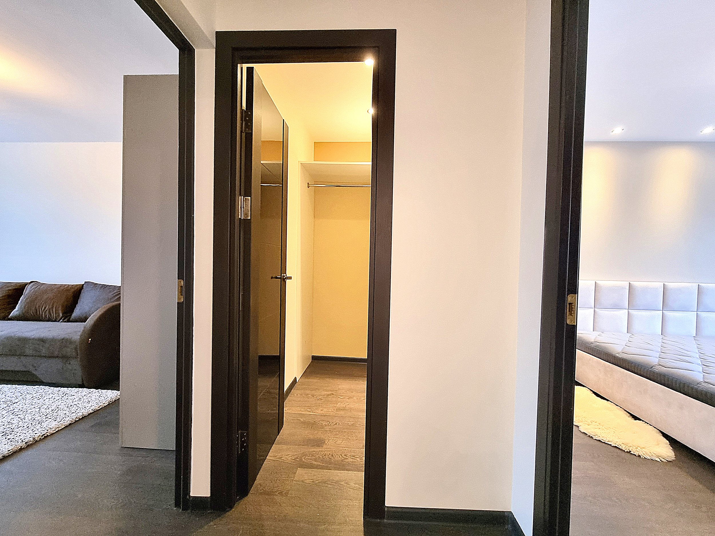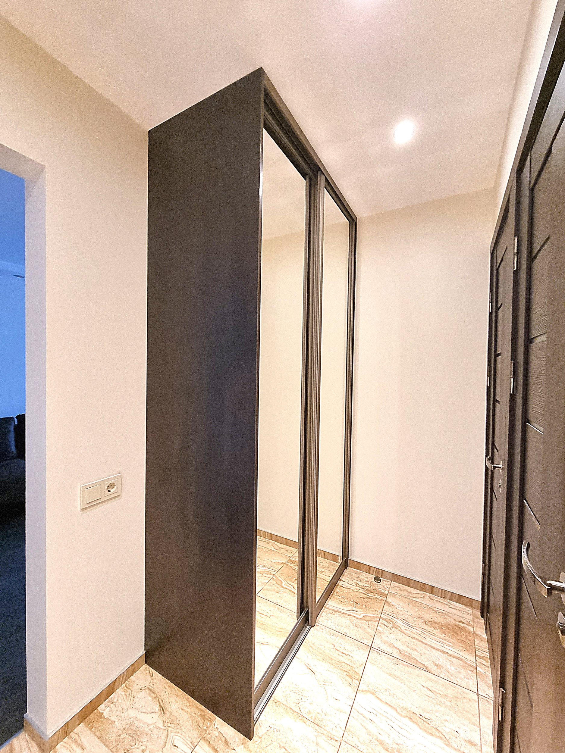 • Prieškambaryje erdvi sieninė spinta iki pat lubų.