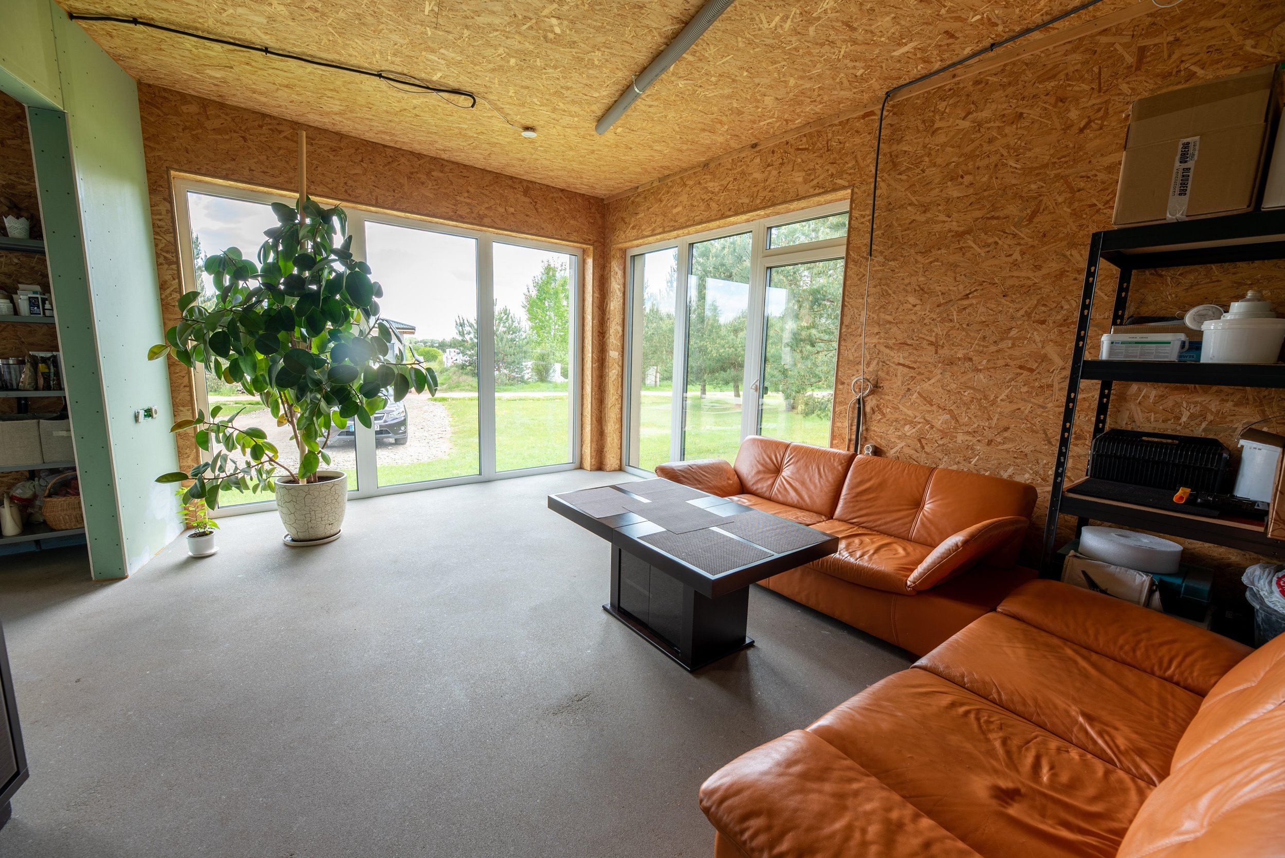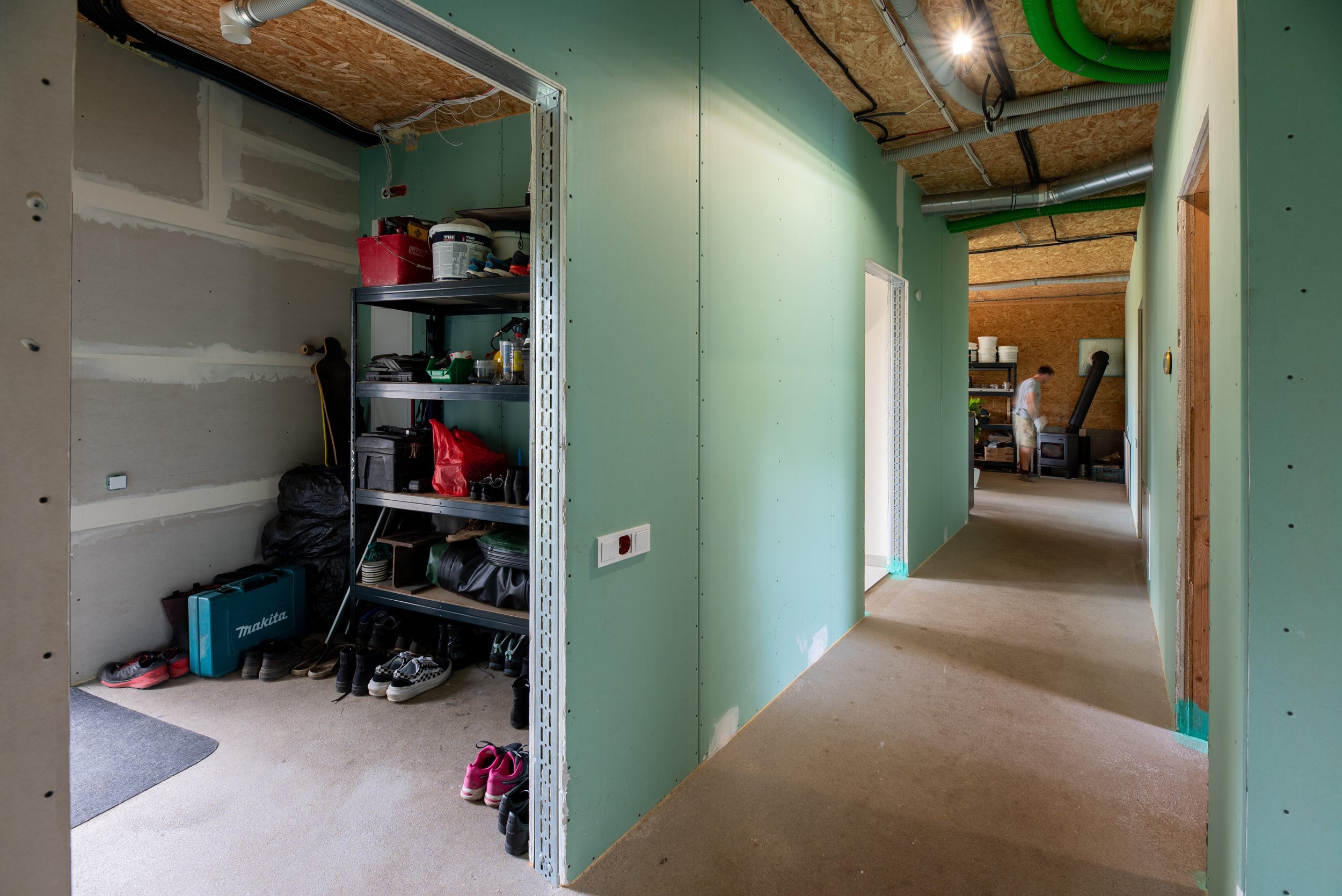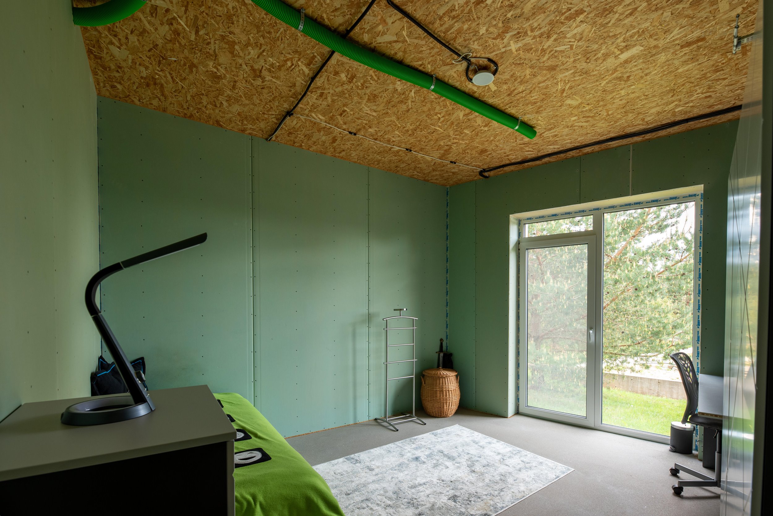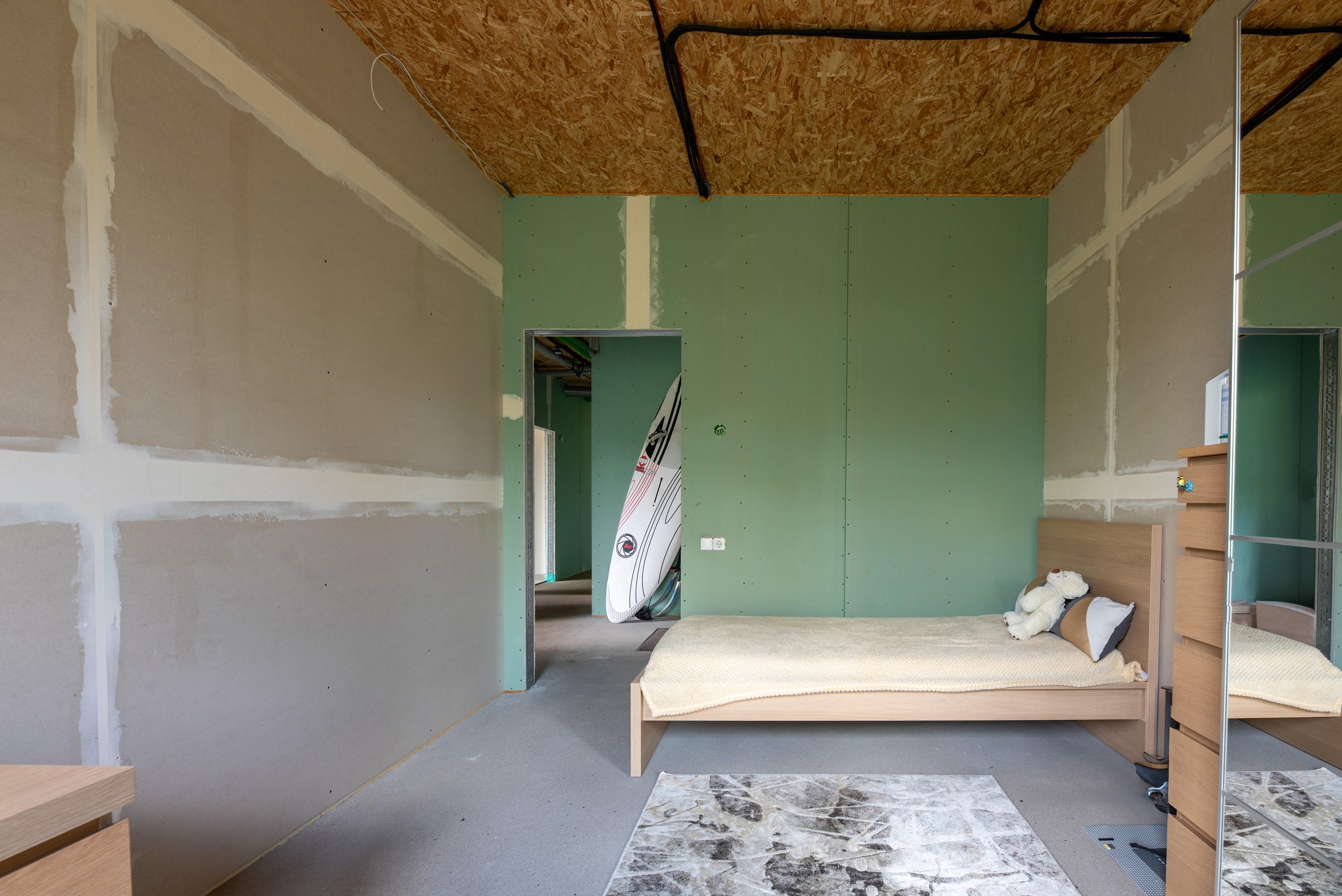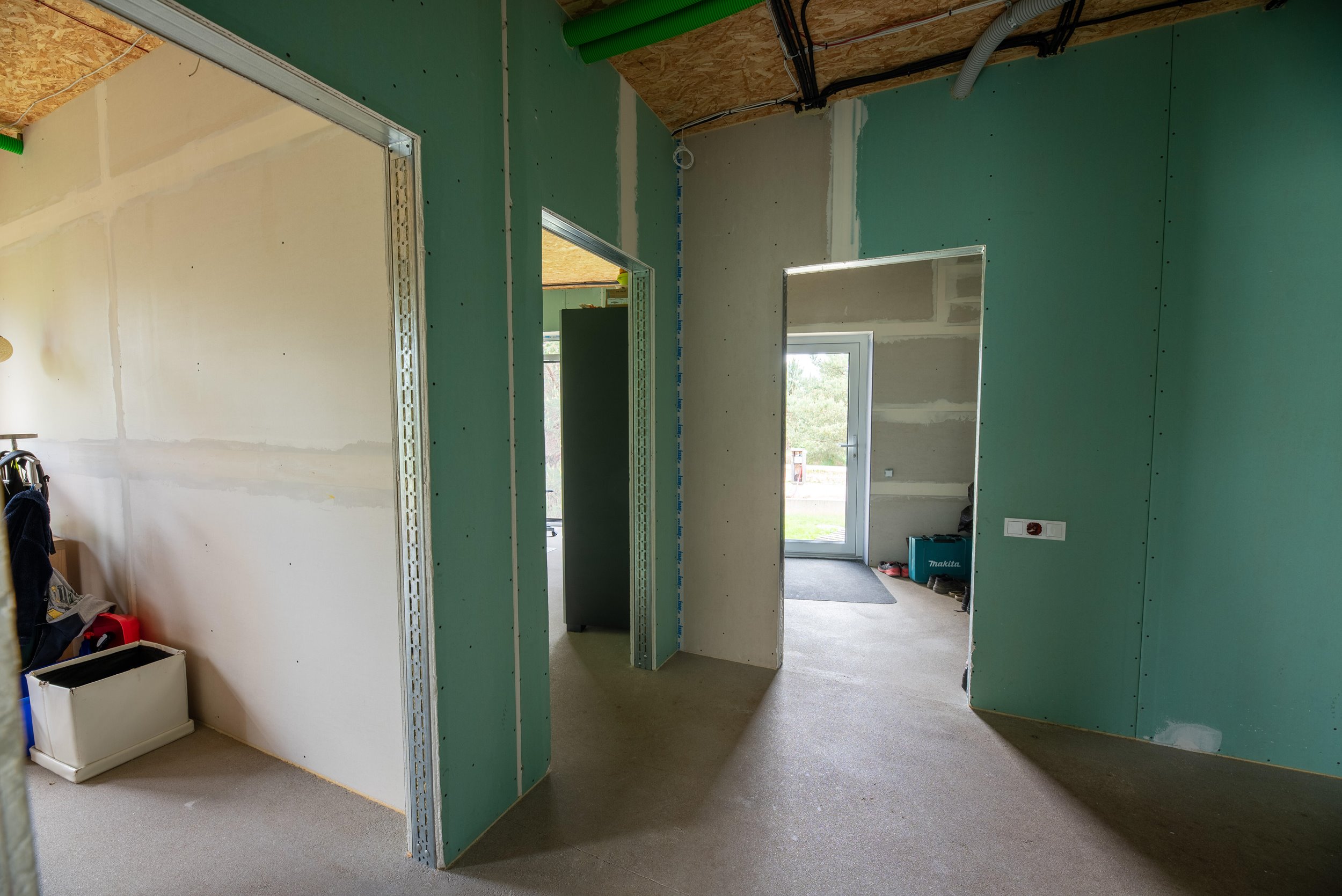 Vidaus apdailos lygis (dvi pilnai užbaigtos patalpos, išvedžiotos visos komunikacijos + silpnos srovės, (JAU DABAR GALIMA GYVENTI IR PALAIPSNIUI KURTIS, ŠEIMININKAI GYVENA)