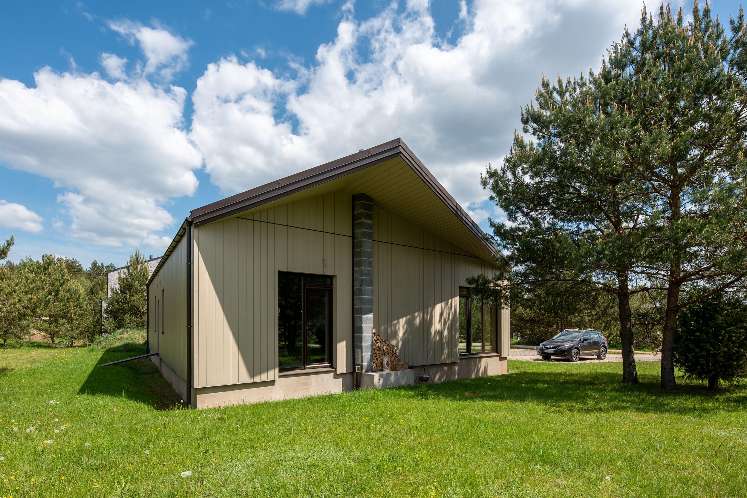 Erdvus kiemas kuriame auga pušelės, gražiai prižiūrėta veja (nereikalaus daug laiko ir pastangų priežiūrai);