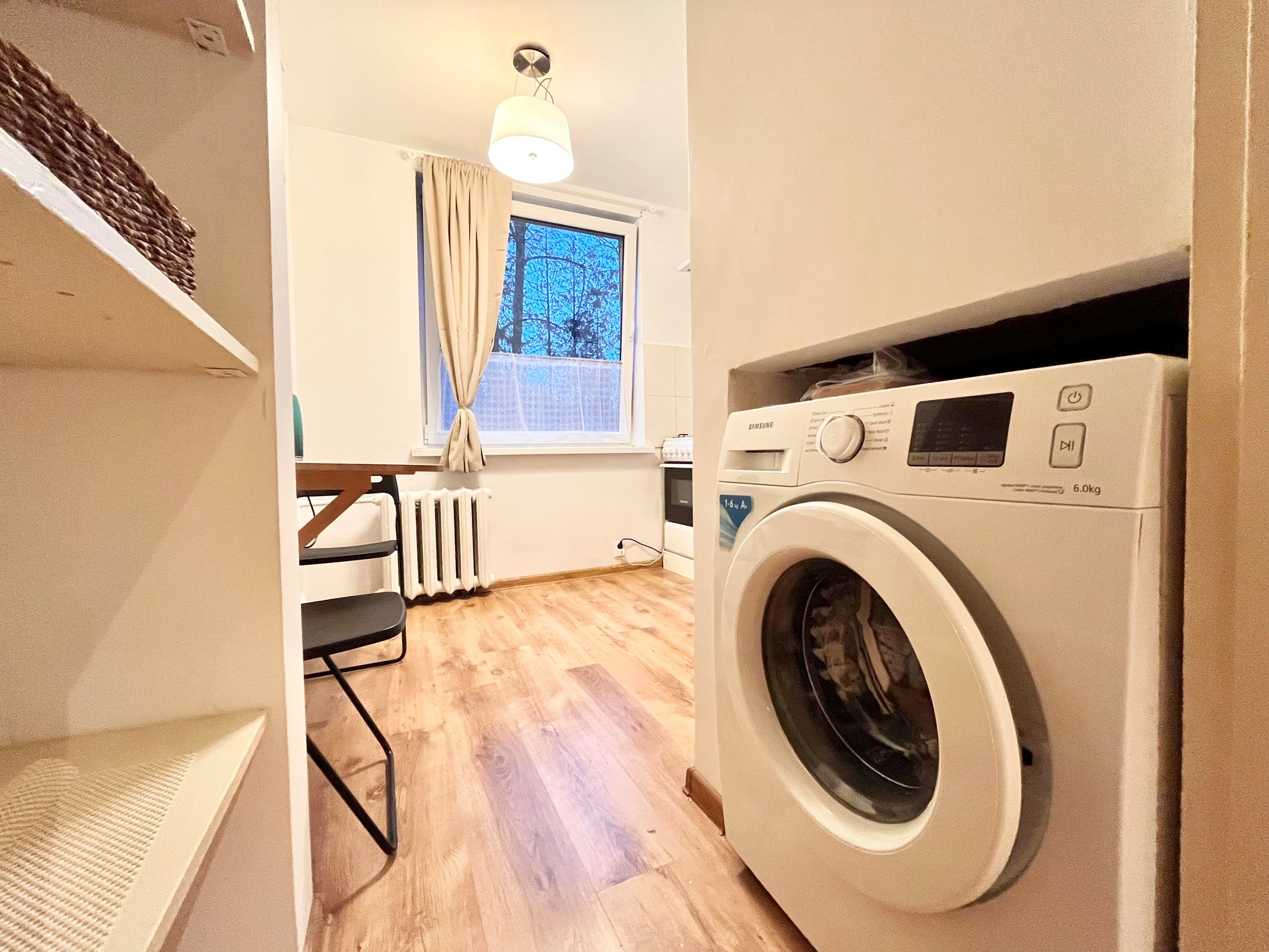 Bute yra visi reikalingi baldai ir buitinė technika, įskaitant skalbimo mašiną.