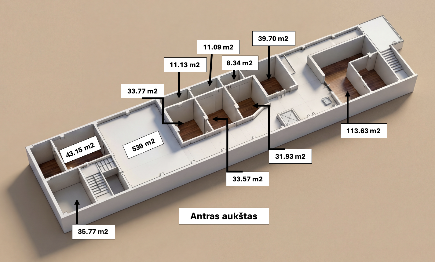 Pastatas – 2 aukštų, įrengti 2 liftai, iš kurių vienas krovininis, užtikrinantis patogų prekių ir įrangos judėjimą tarp aukštų. Objektas pasižymi patogiu susisiekimu su pagrindinėmis miesto transporto arterijomis bei aplinkkeliu, todėl vieta itin palanki verslui.