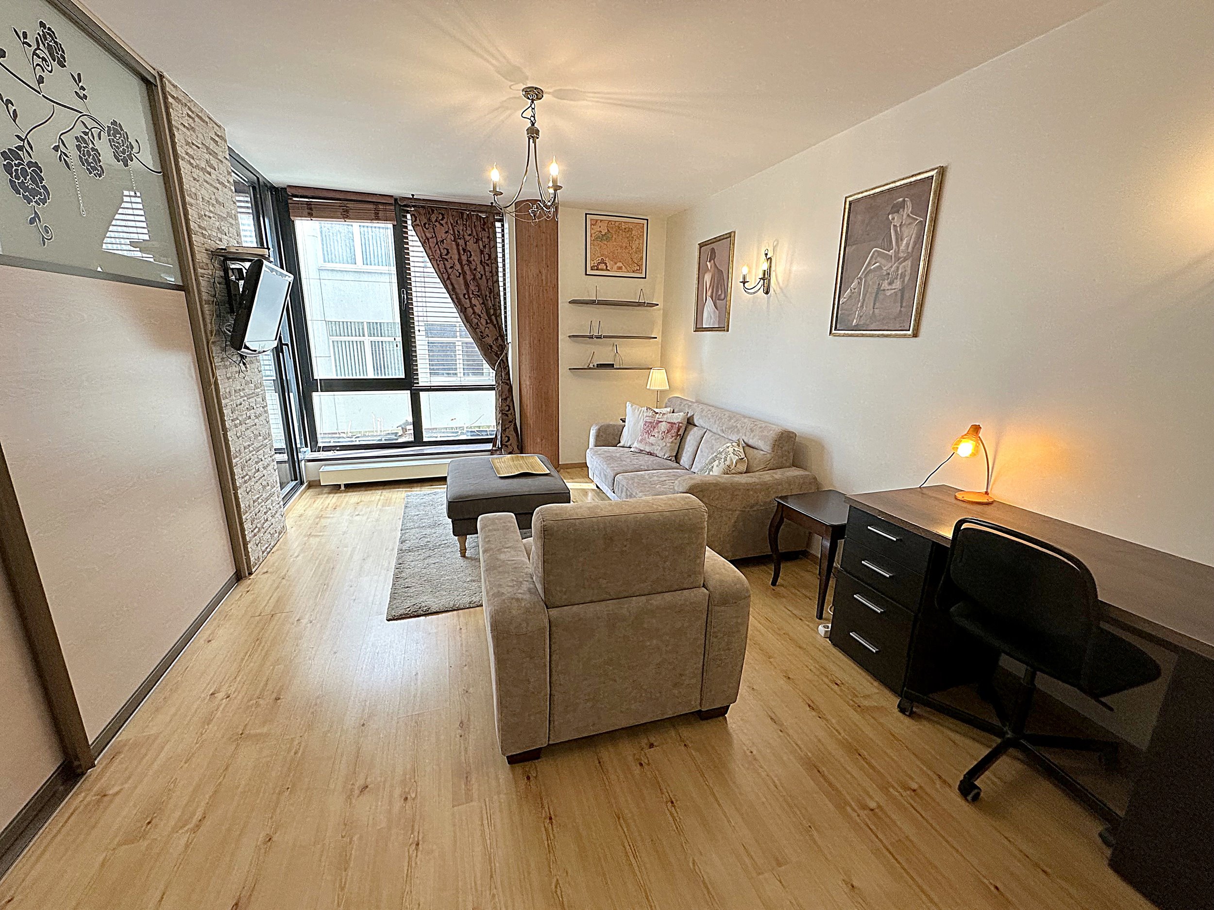 Erdvi bei šviesi svetainė kartu su virtuvės zona, jaukus miegamasis, vonios kambarys. Yra balkonas.