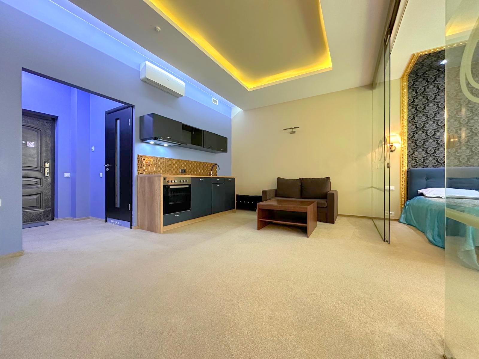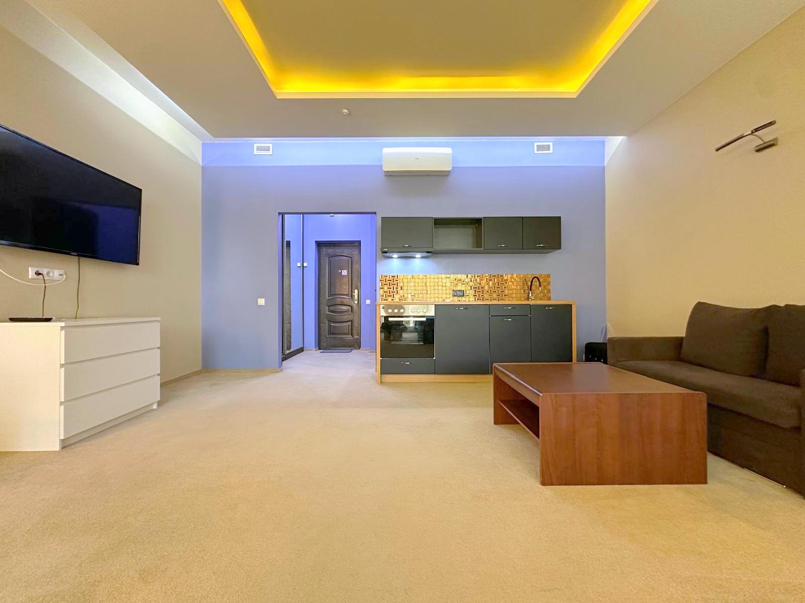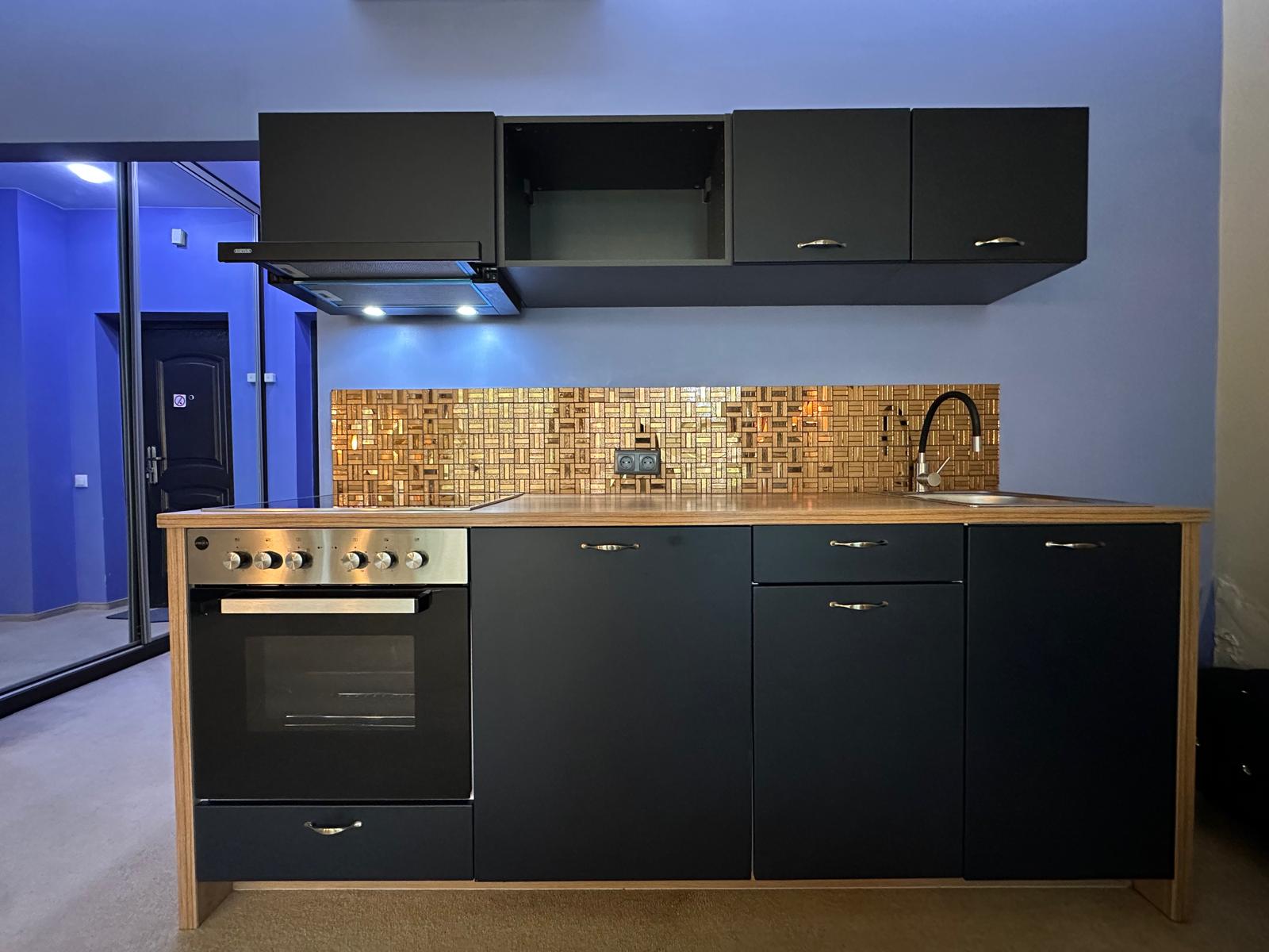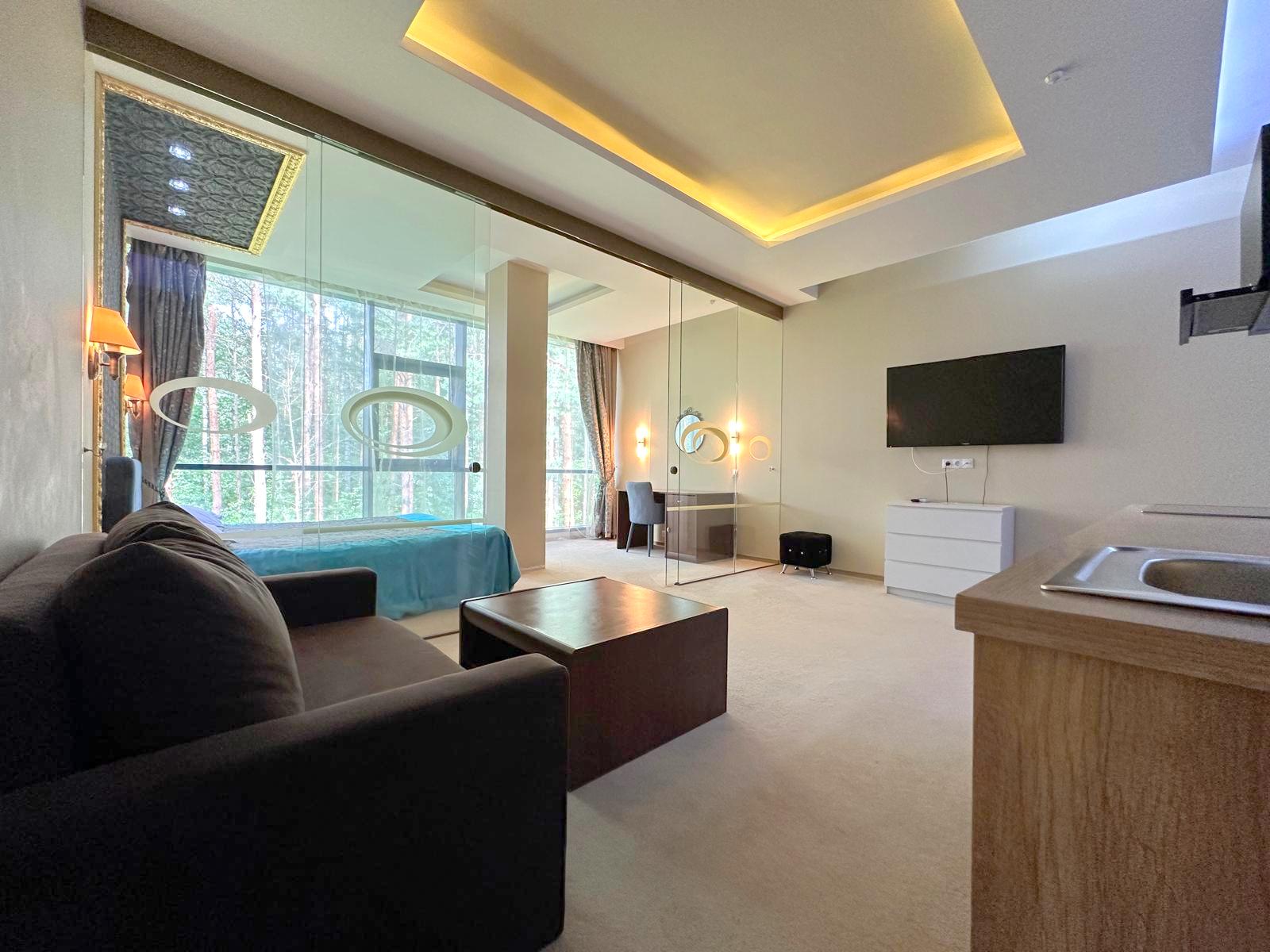 Išplanavimas: 2 kambariai - vienas iš jų miegamasis su darbo zona, kitas - virtuvė su svetaine, tualetas kartu su vonia, prieškabaris.