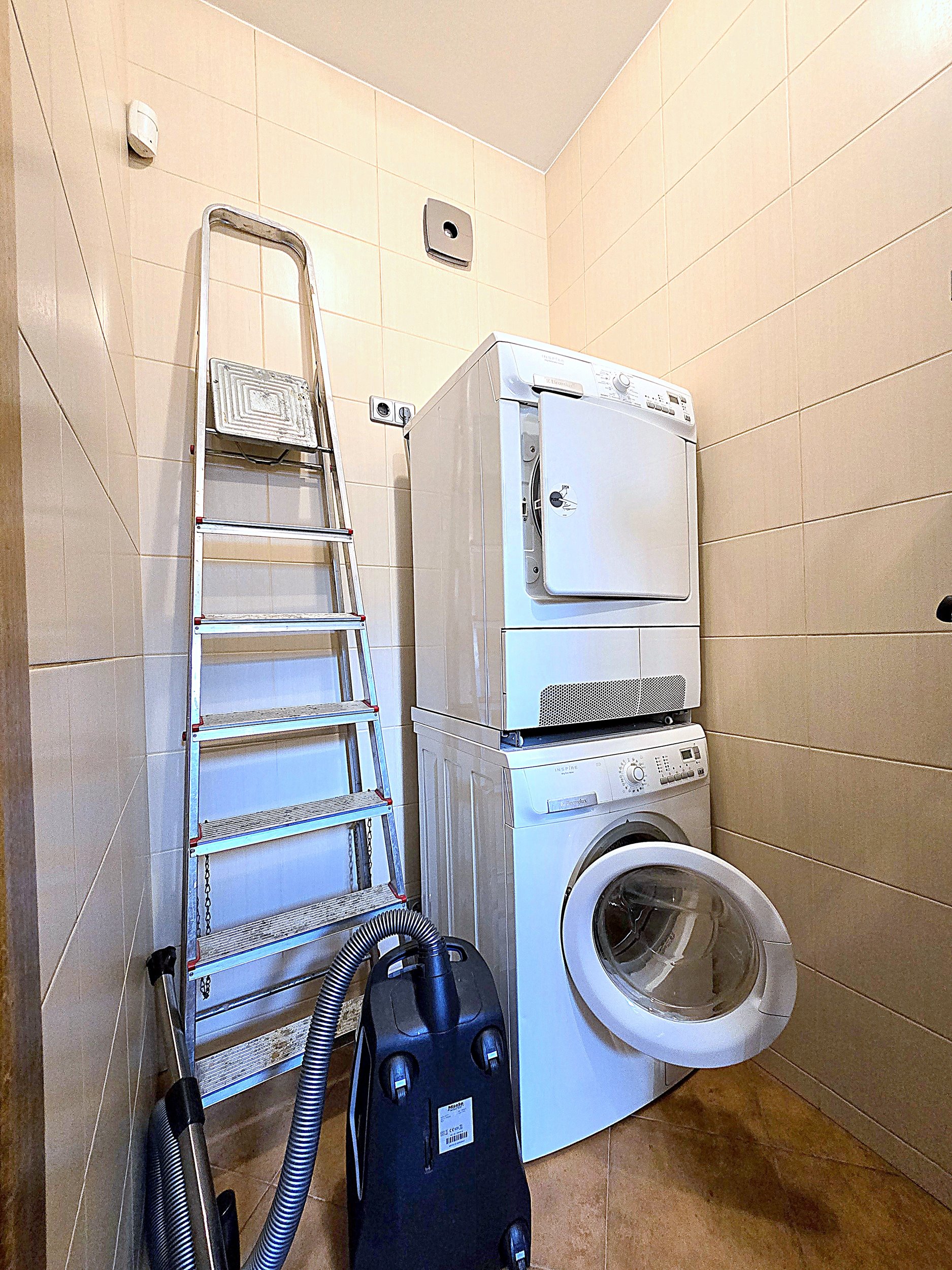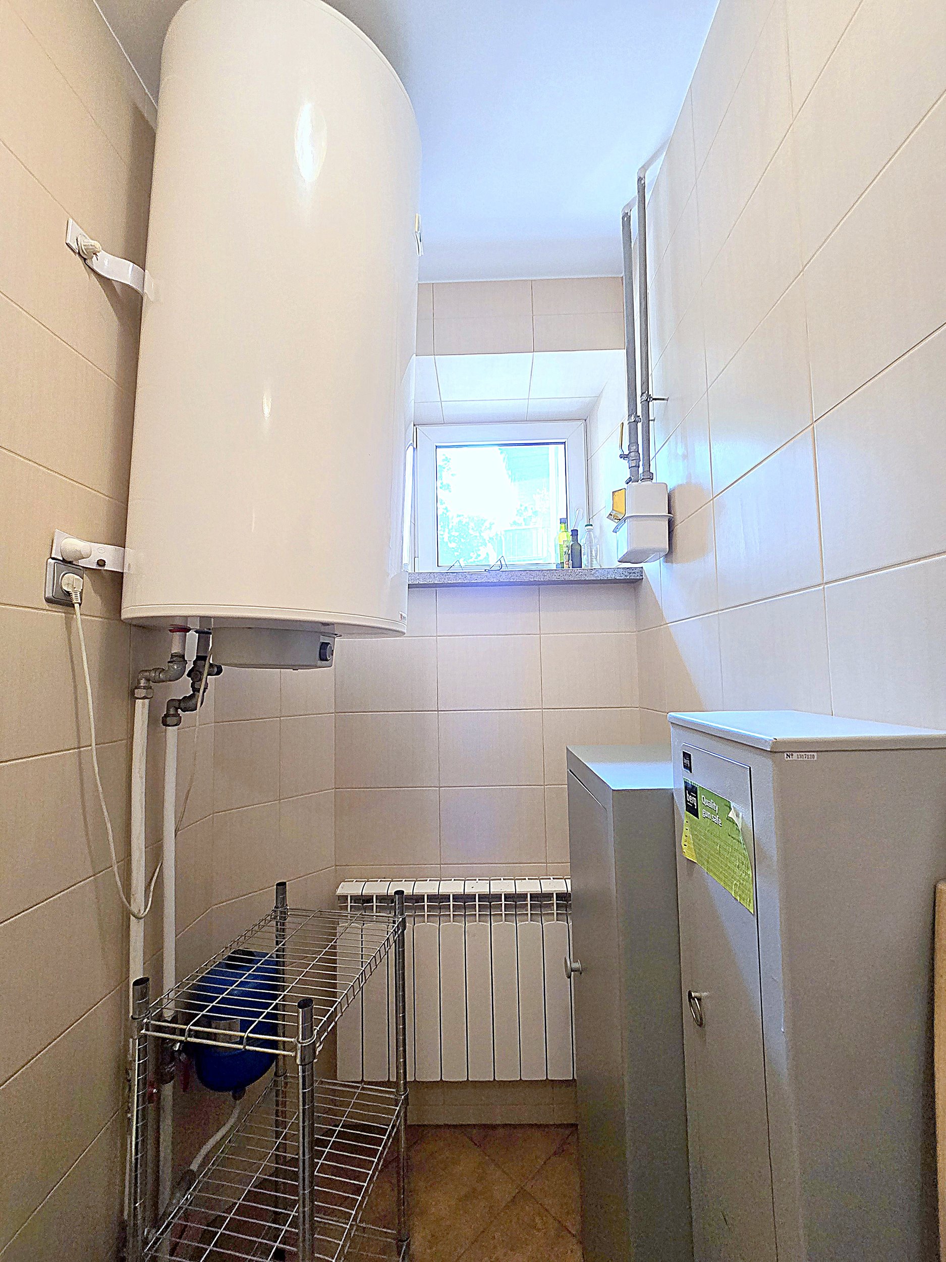 Didelis, tamsus pagalbinis kambarys su skalbimo mašina, džiovykle bei dviem įrengtais seifais;
