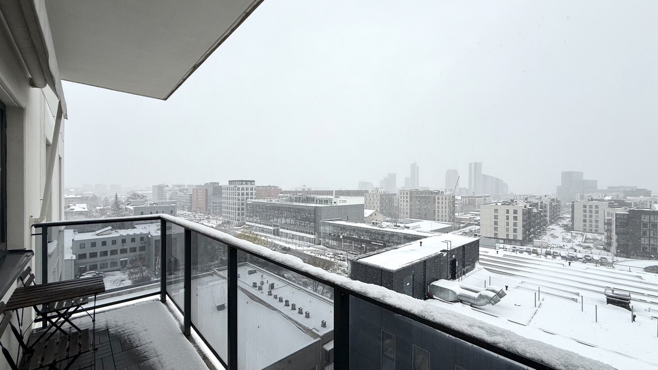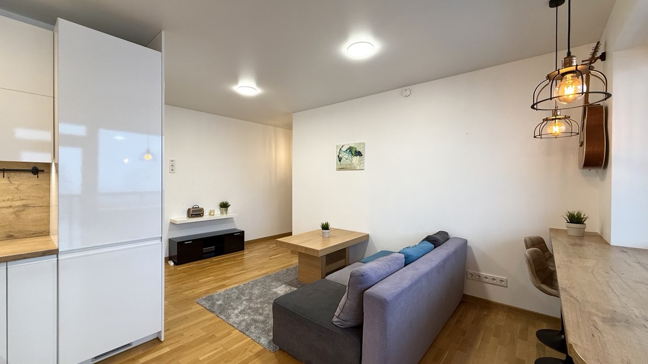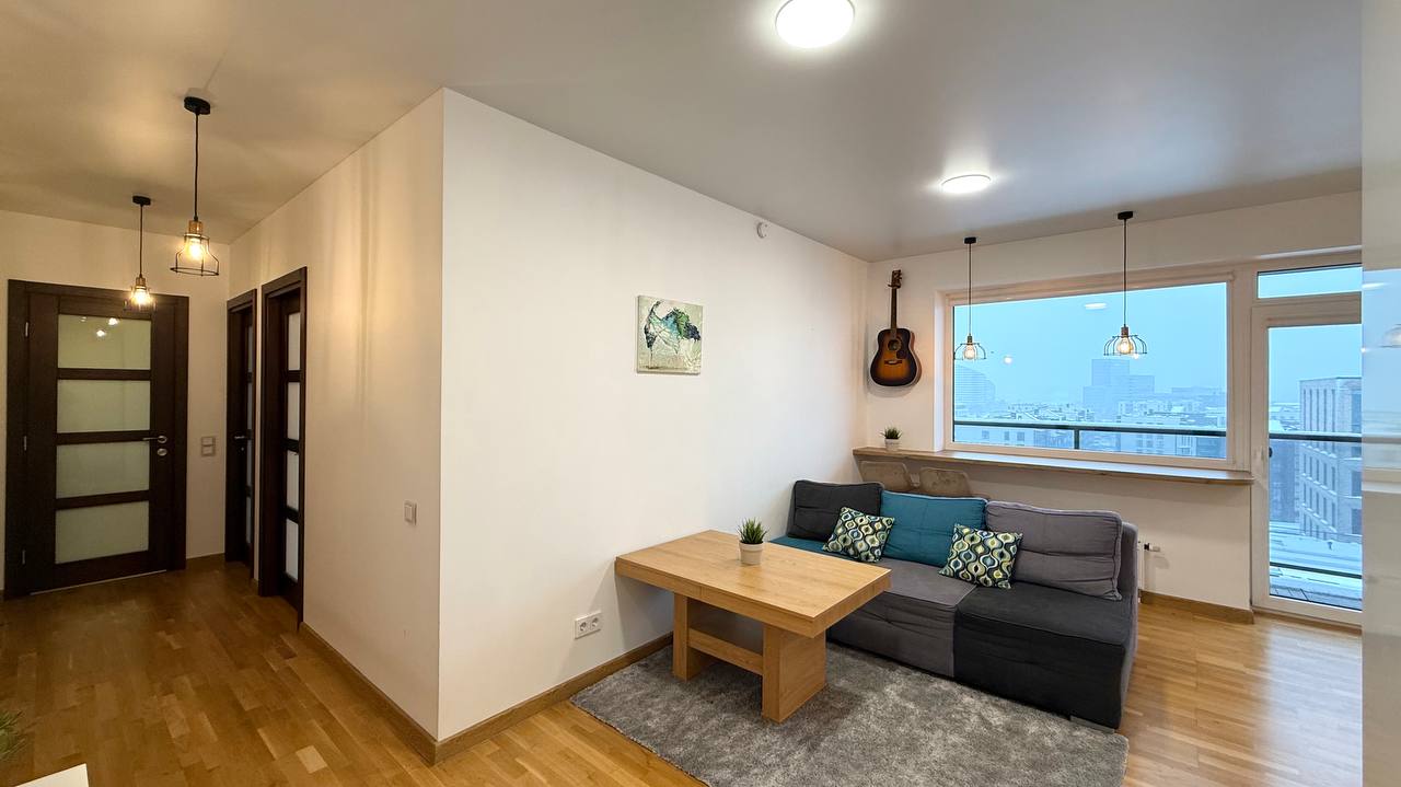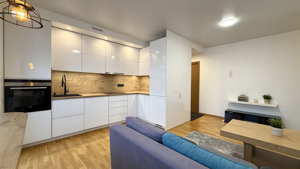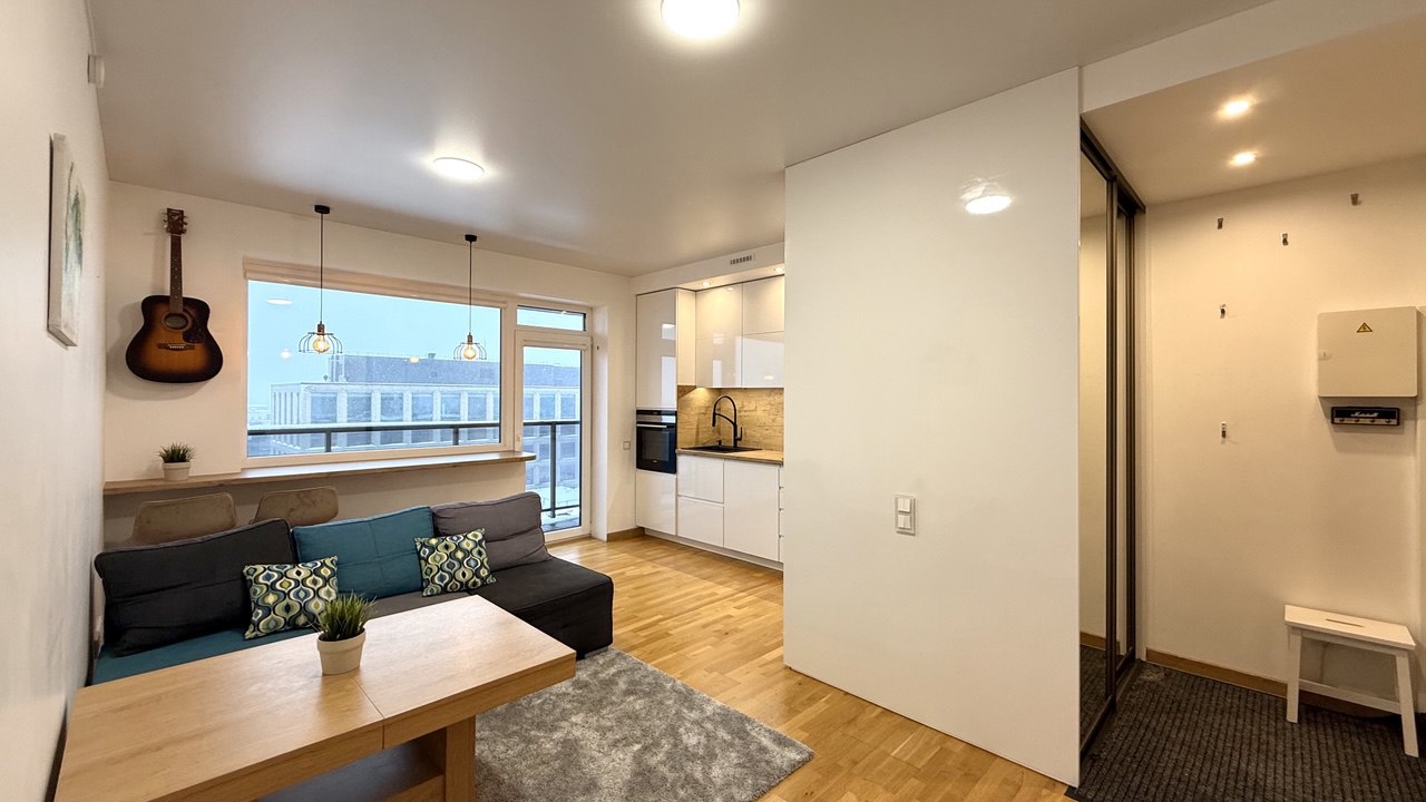 -Virtuvė kartu su svetaine ir erdviu balkonu su nuostabiu vaizdu į Vilniaus centrą