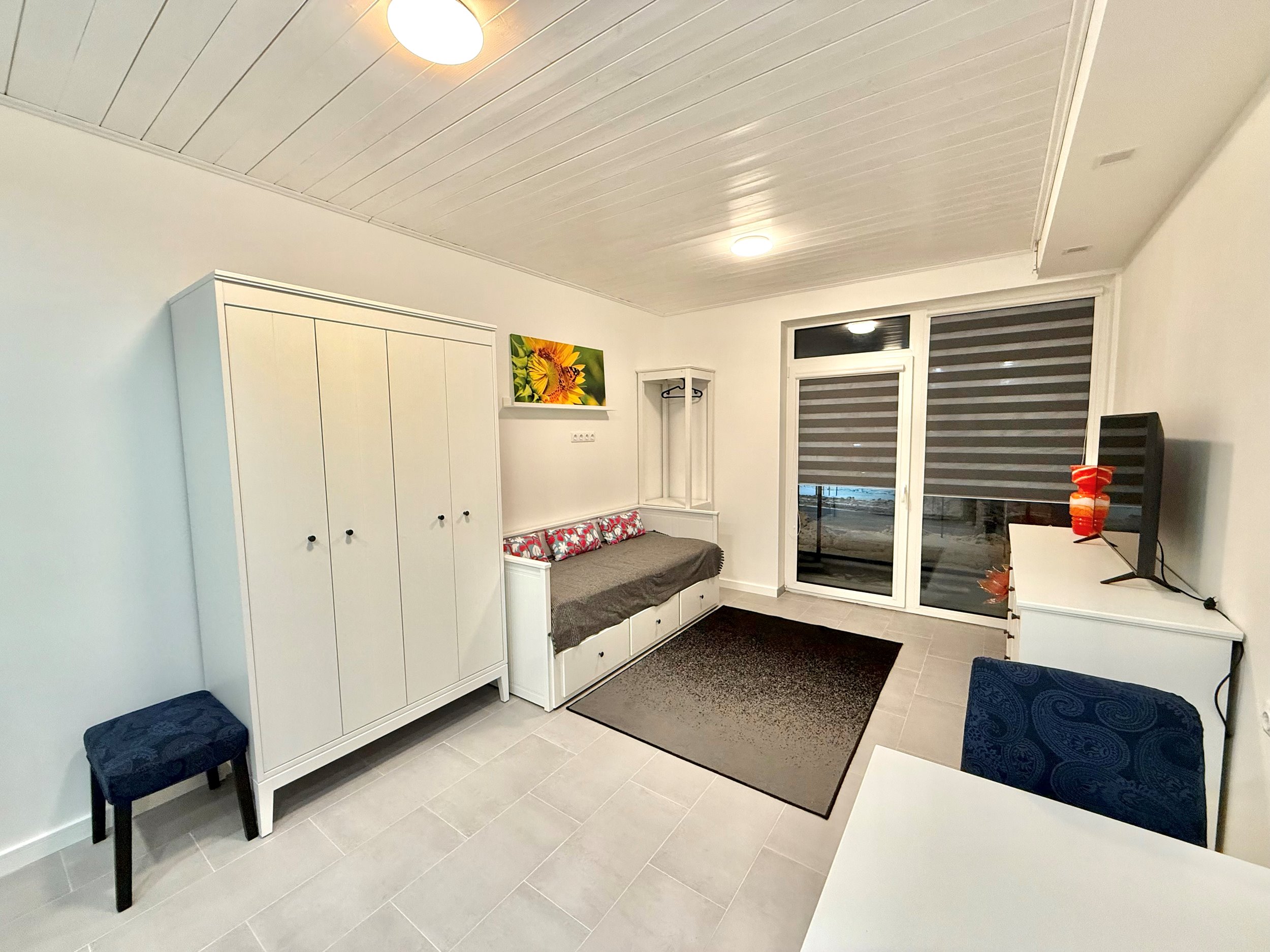 Svetainės–miegamojo erdvė su naujais, kokybiškais baldais