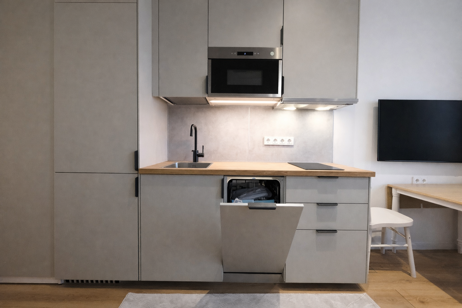 Bute yra visi reikalingiausi baldai, sofa-lova, skalbimo mašina, indaplovė, šaldytuvas su šaldikliu, viryklė ir t.t.