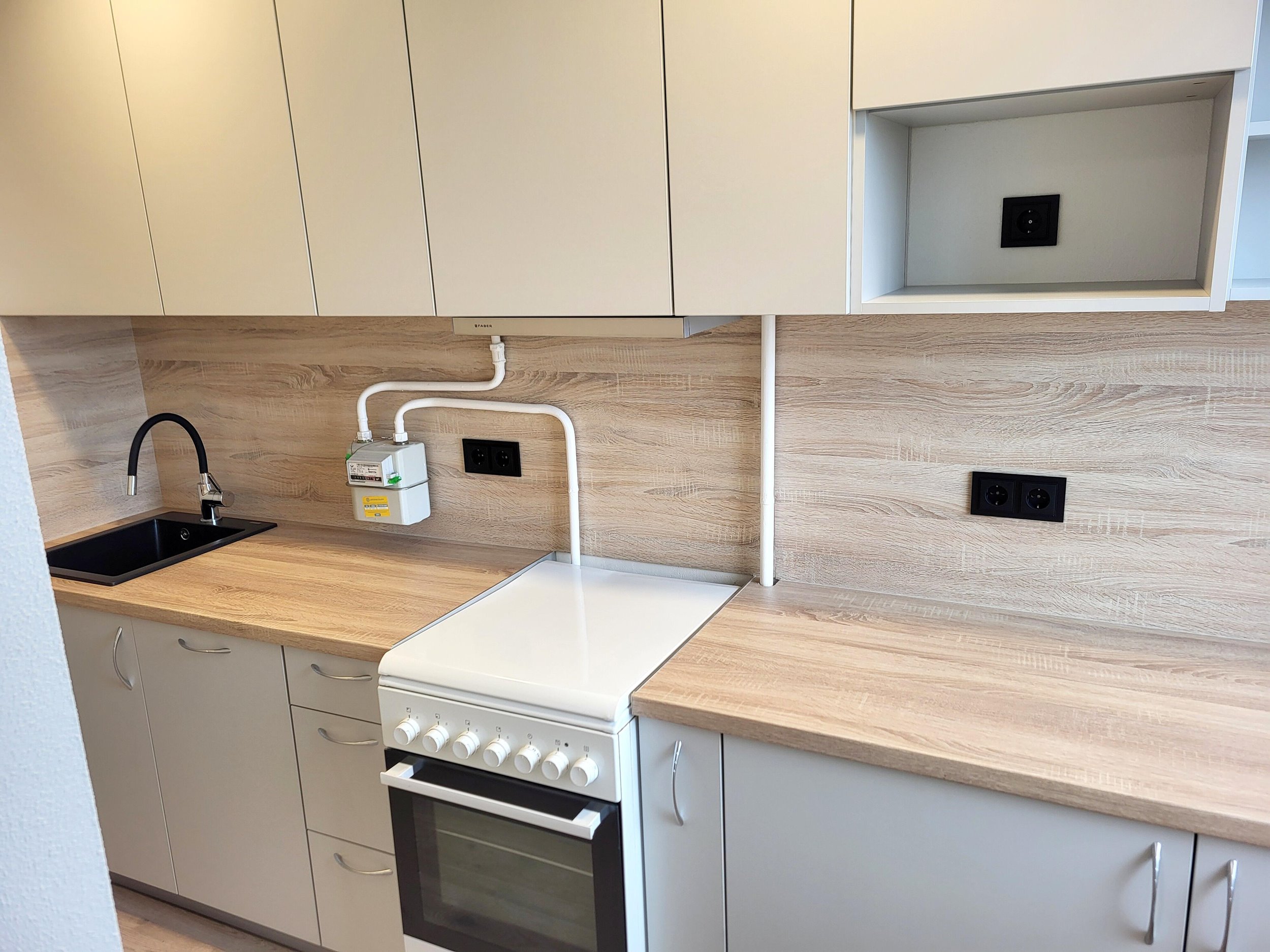 - Miegamasis kambarys (SU SPINTA VEIDRODINĖMIS DURIMIS, MIEGAMOJI LOVA),svetainė, nauji virtuvės baldai.