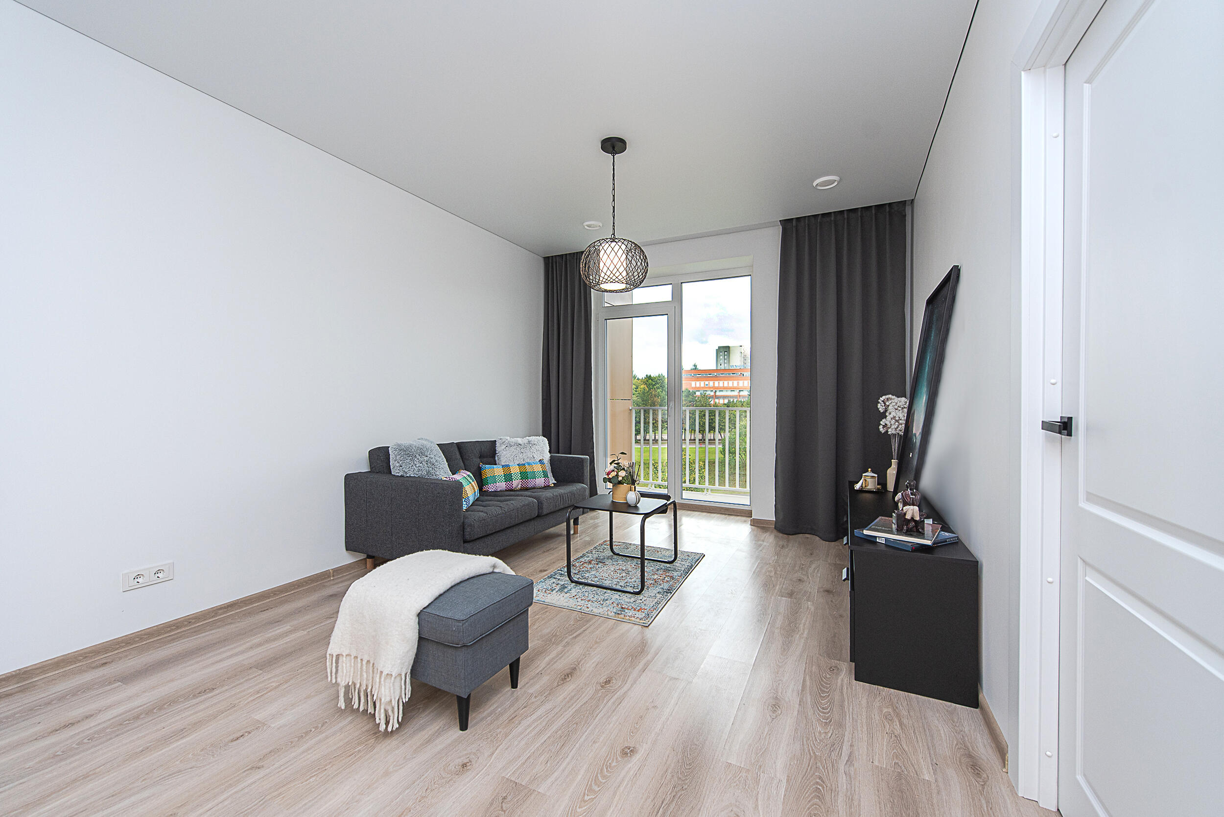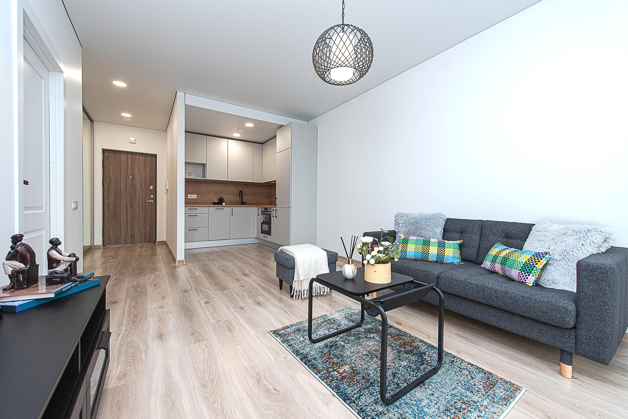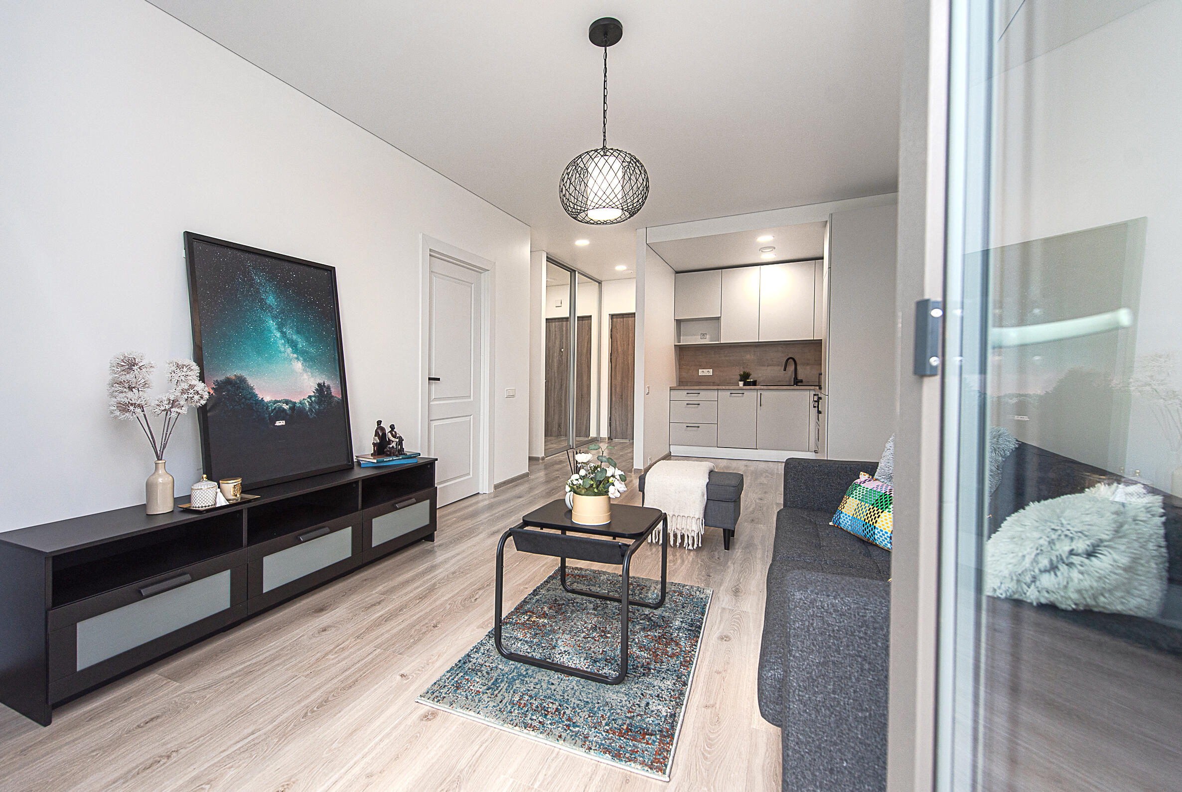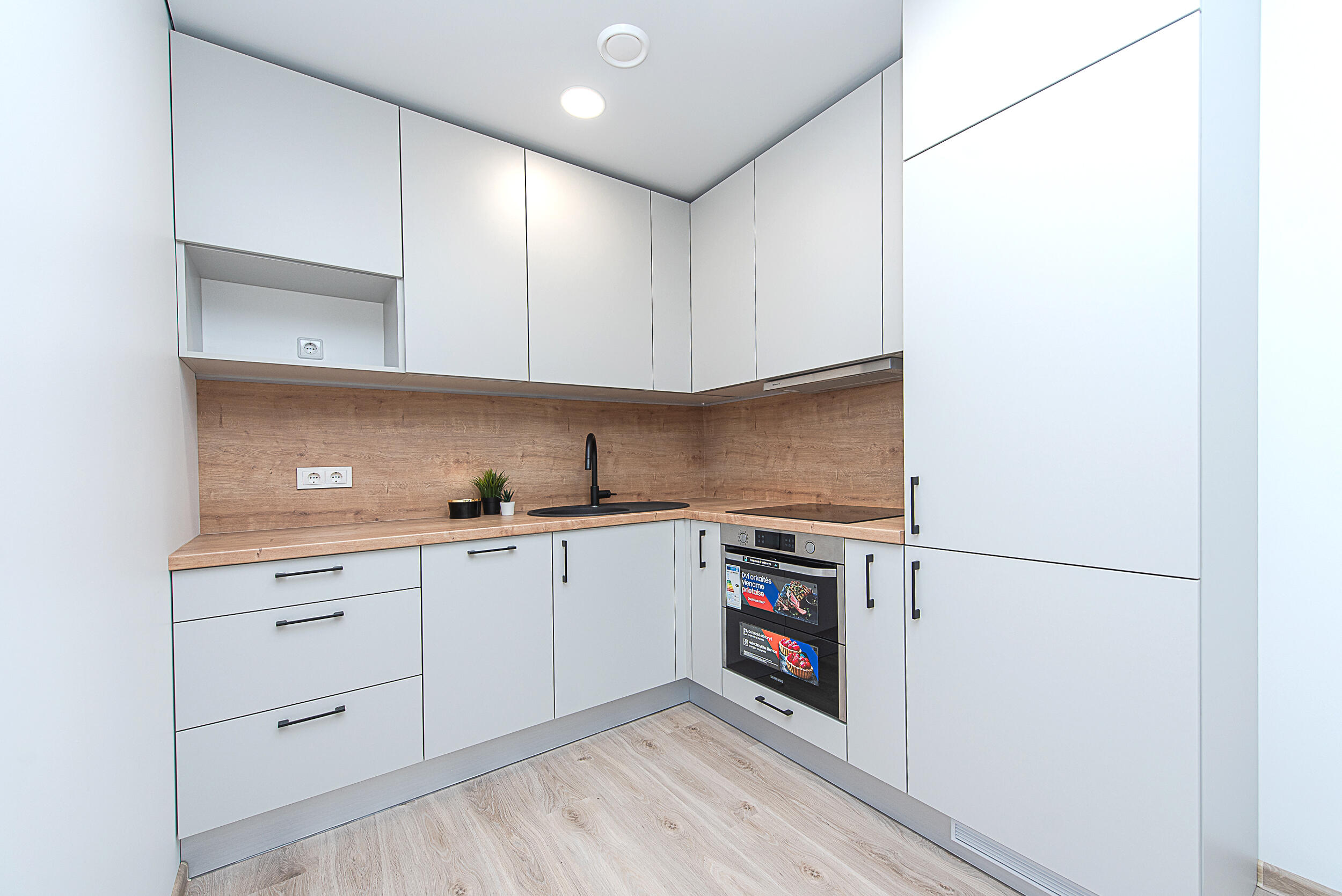 Butas parduodamas SU VIRTUVĖS KOMPLEKTU SU INTEGRUOTA BUITINE TECHNIKA, ŠALDYTUVU, SKALBIMO-DŽIOVINIMO MAŠINA, BALDAIS.
