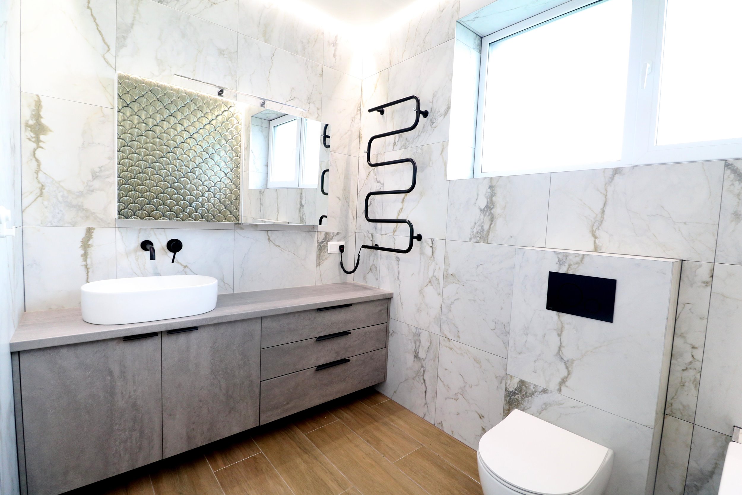 - Šildymas: sistema oras-vanduo. Šildomos grindys vardas.