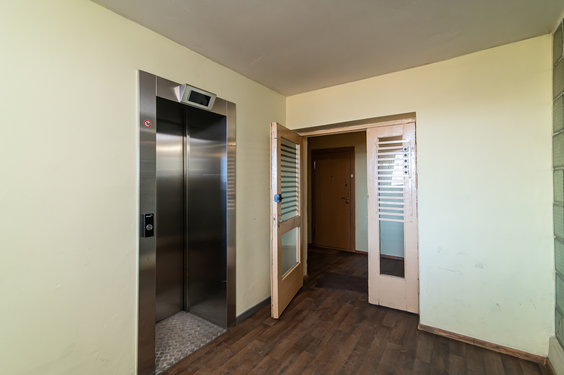 Labai tvarkinga, erdvi laiptinė, liftas, kodinės laiptinės durys.