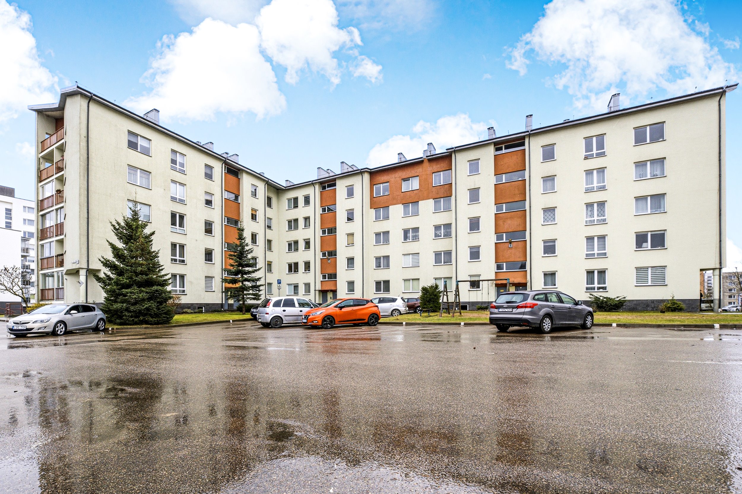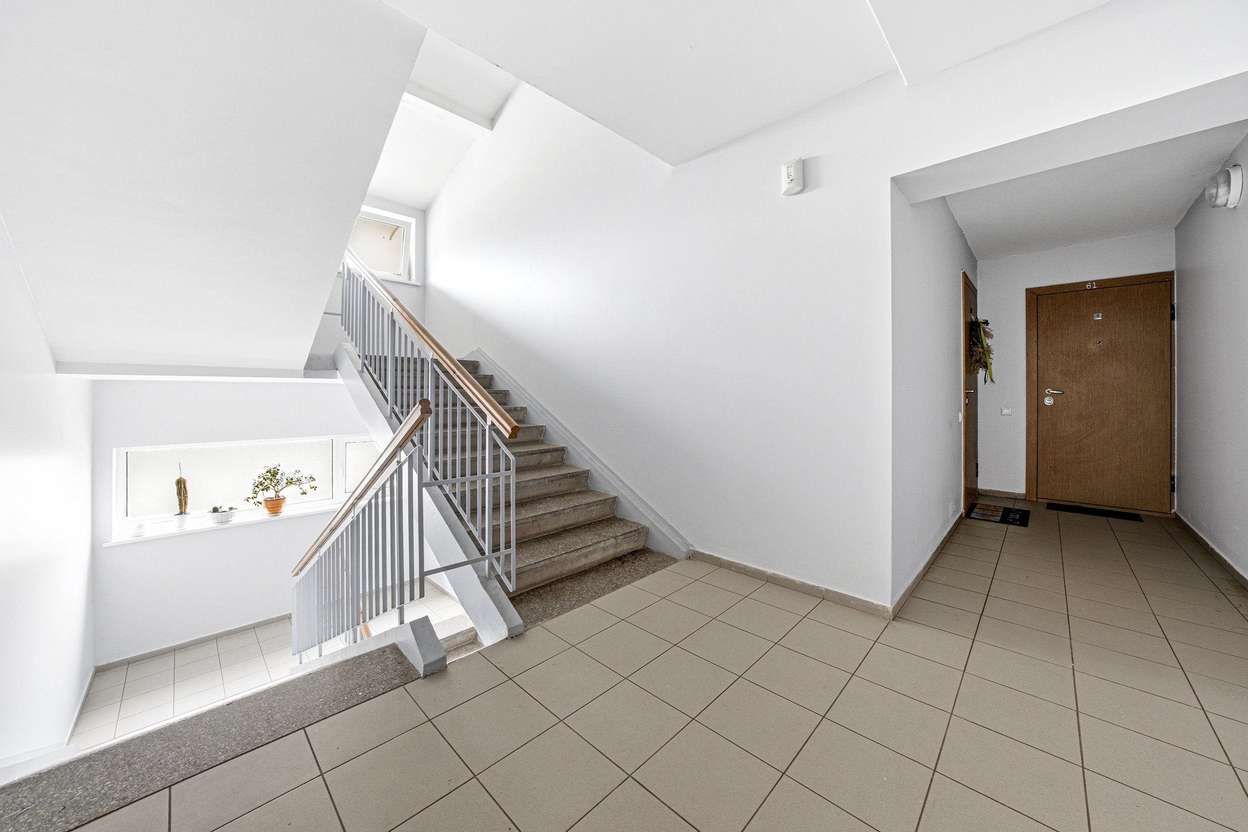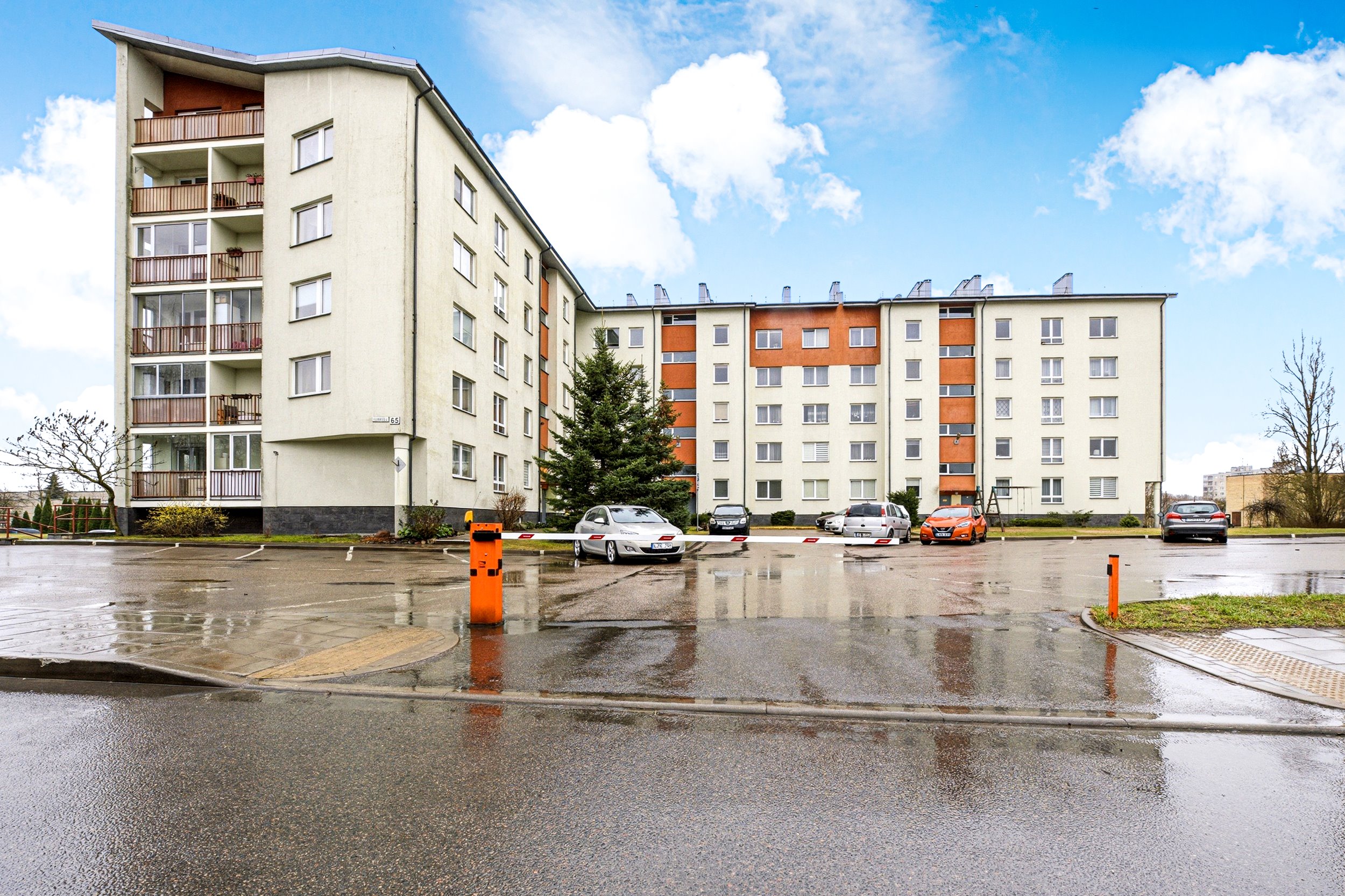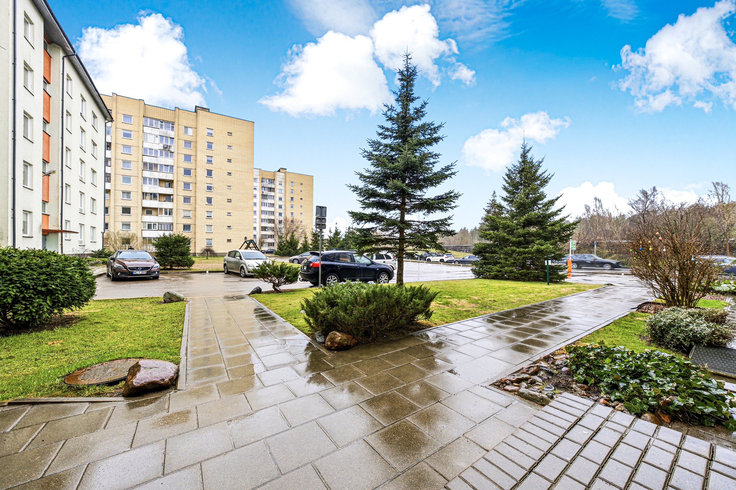 Tvarkinga kaimynystė, prižiūrima laiptinė, privati parkavimo aikštelė su užtvaru.