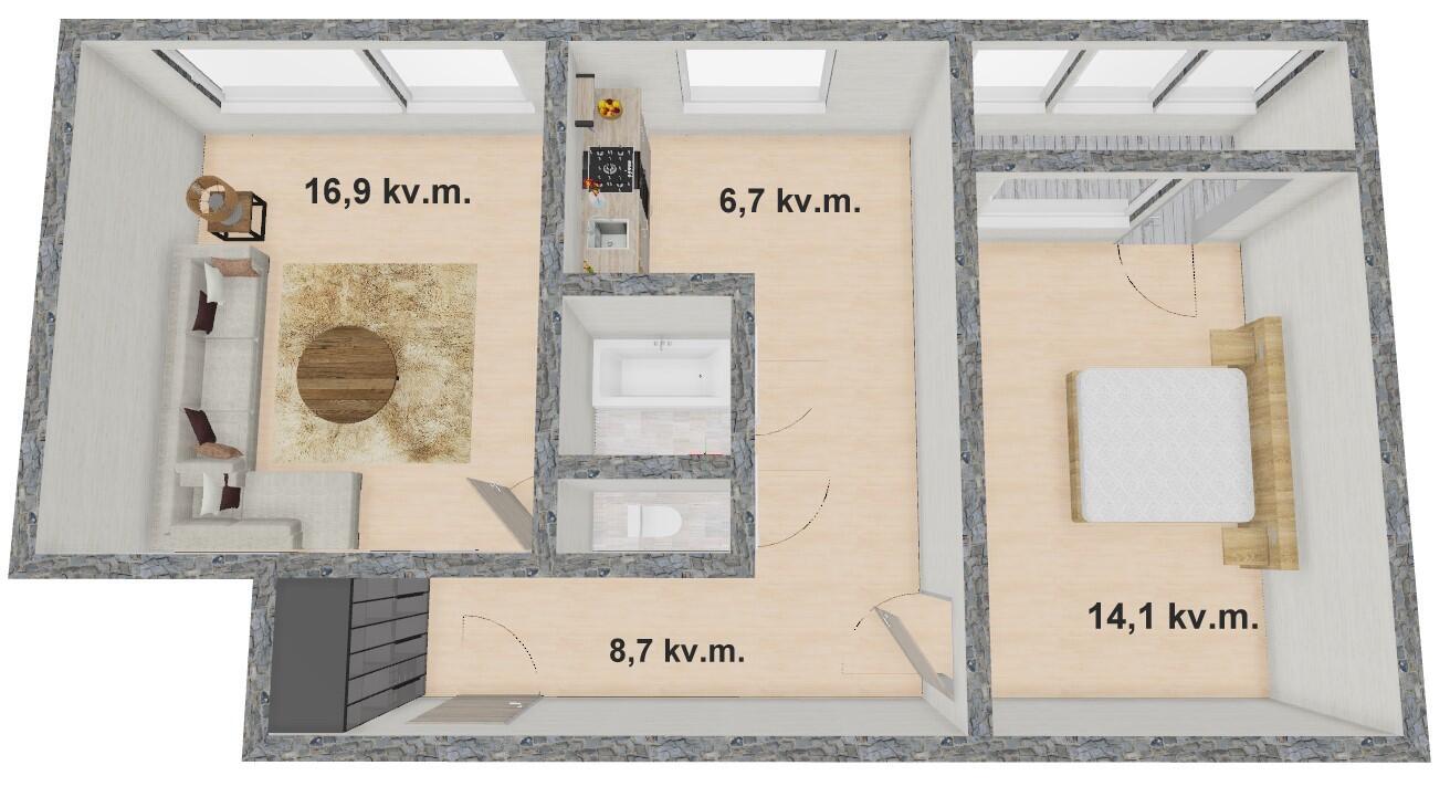 Buto vidus tvarkingas, tačiau reikalingas remontas, todėl tai puiki galimybė įsirengti namus pagal savo skonį. Vienas iš privalumų – didelis įstiklintas balkonas, iš kurio atsiveria vaizdas į ramų vidinį kiemą, apsuptą žalumos. Kaimynai ramūs ir draugiški, o namo laiptinė bei aplinka prižiūrėtos.