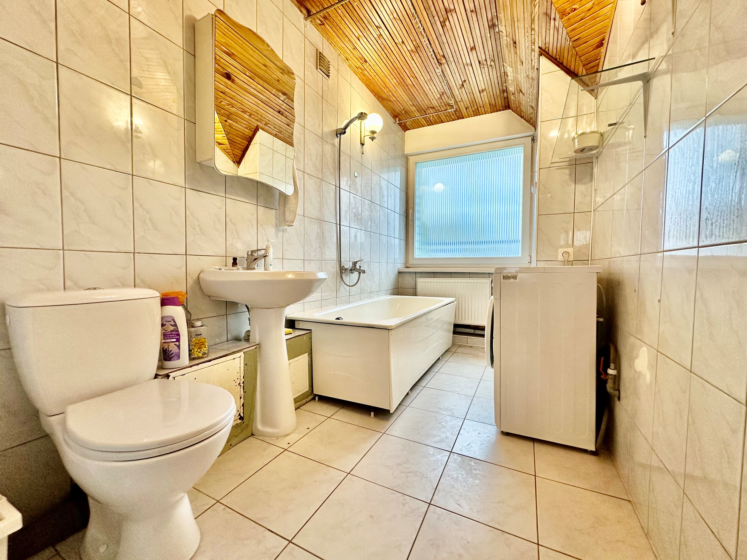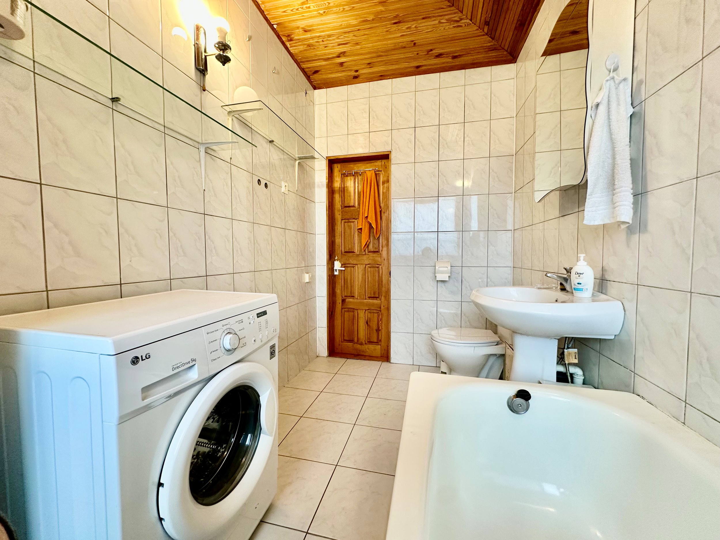 Bute yra visi reikalingiausi baldai: skalbimo mašina, šaldytuvas su šaldikliu, kaitlentė ir t.t.