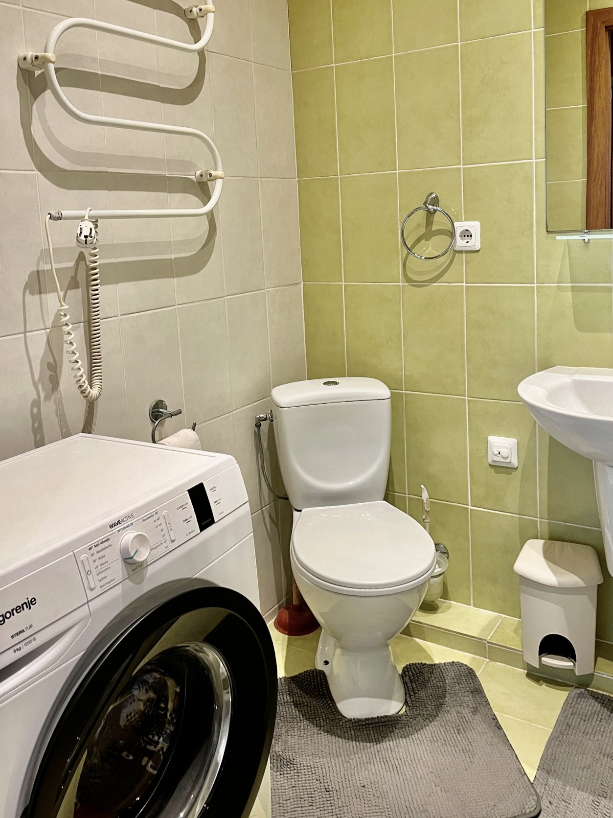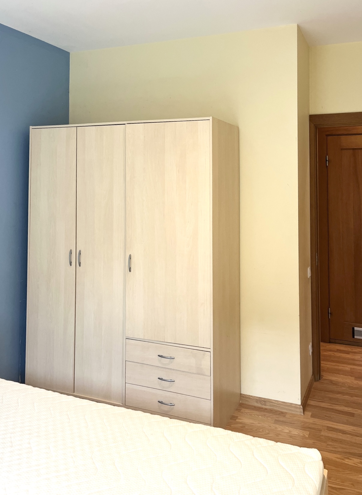 Bute yra visi reikalingiausi baldai: skalbimo mašina, šaldytuvas su šaldikliu, kaitlentė ir t.t.