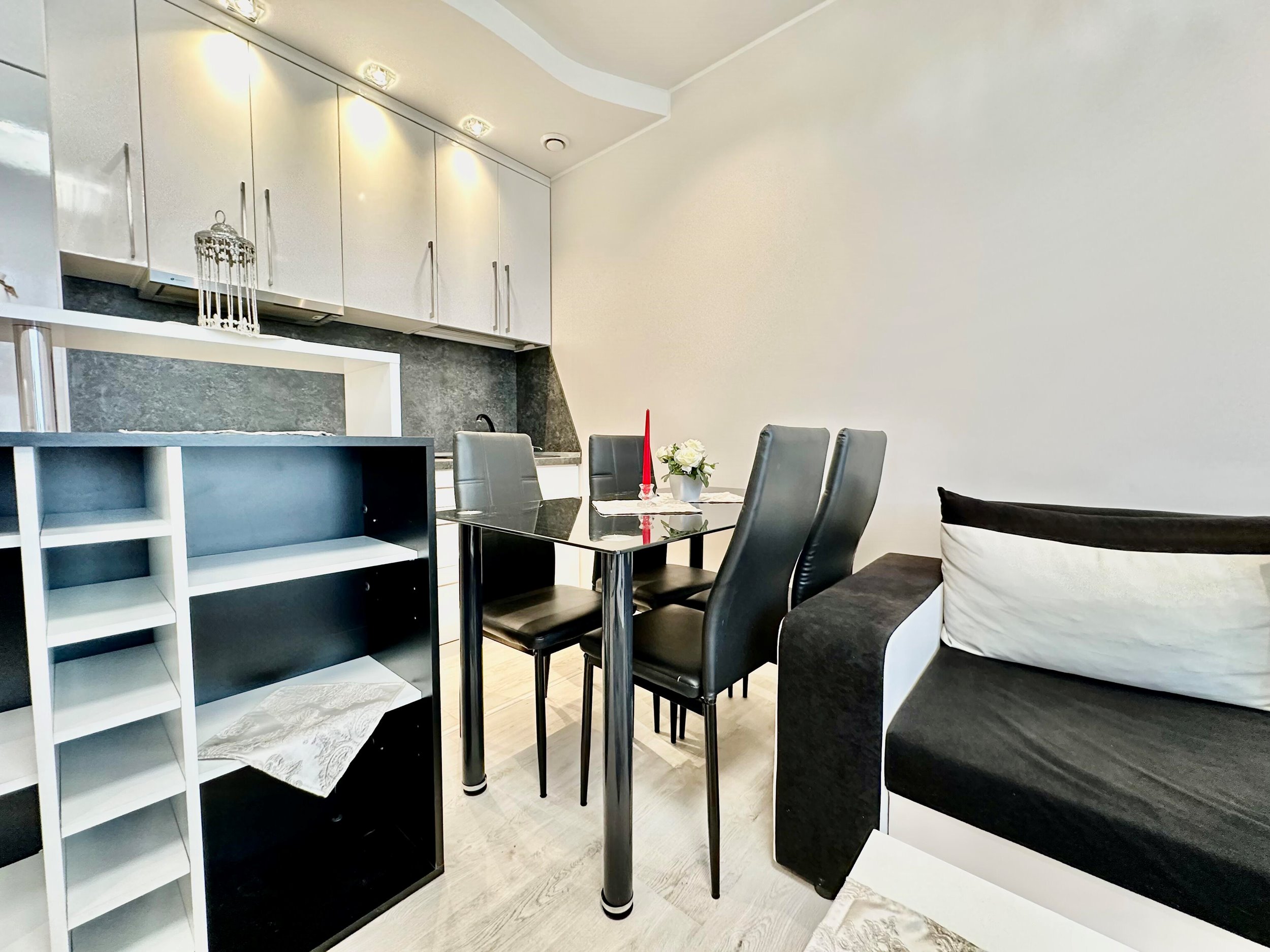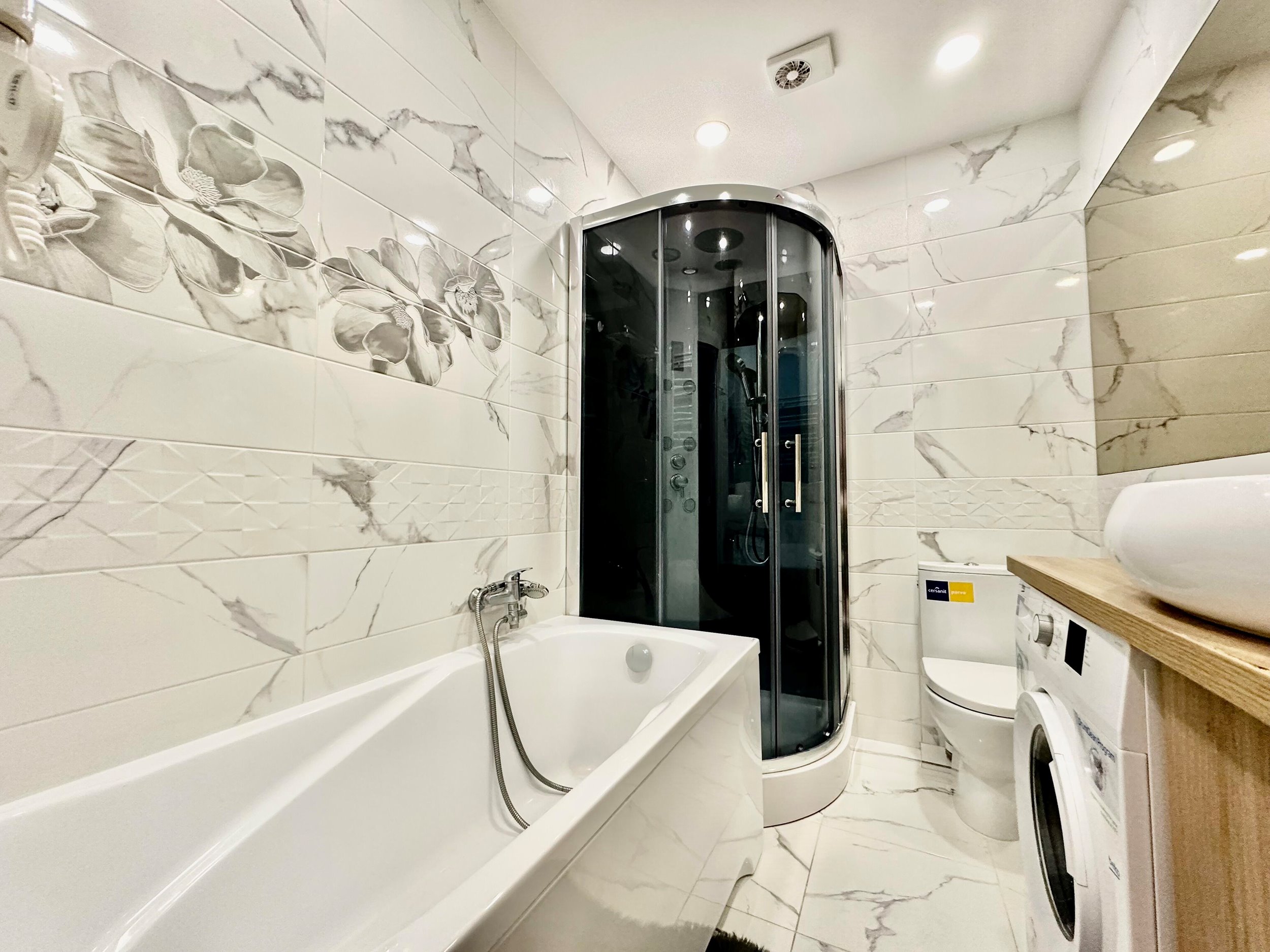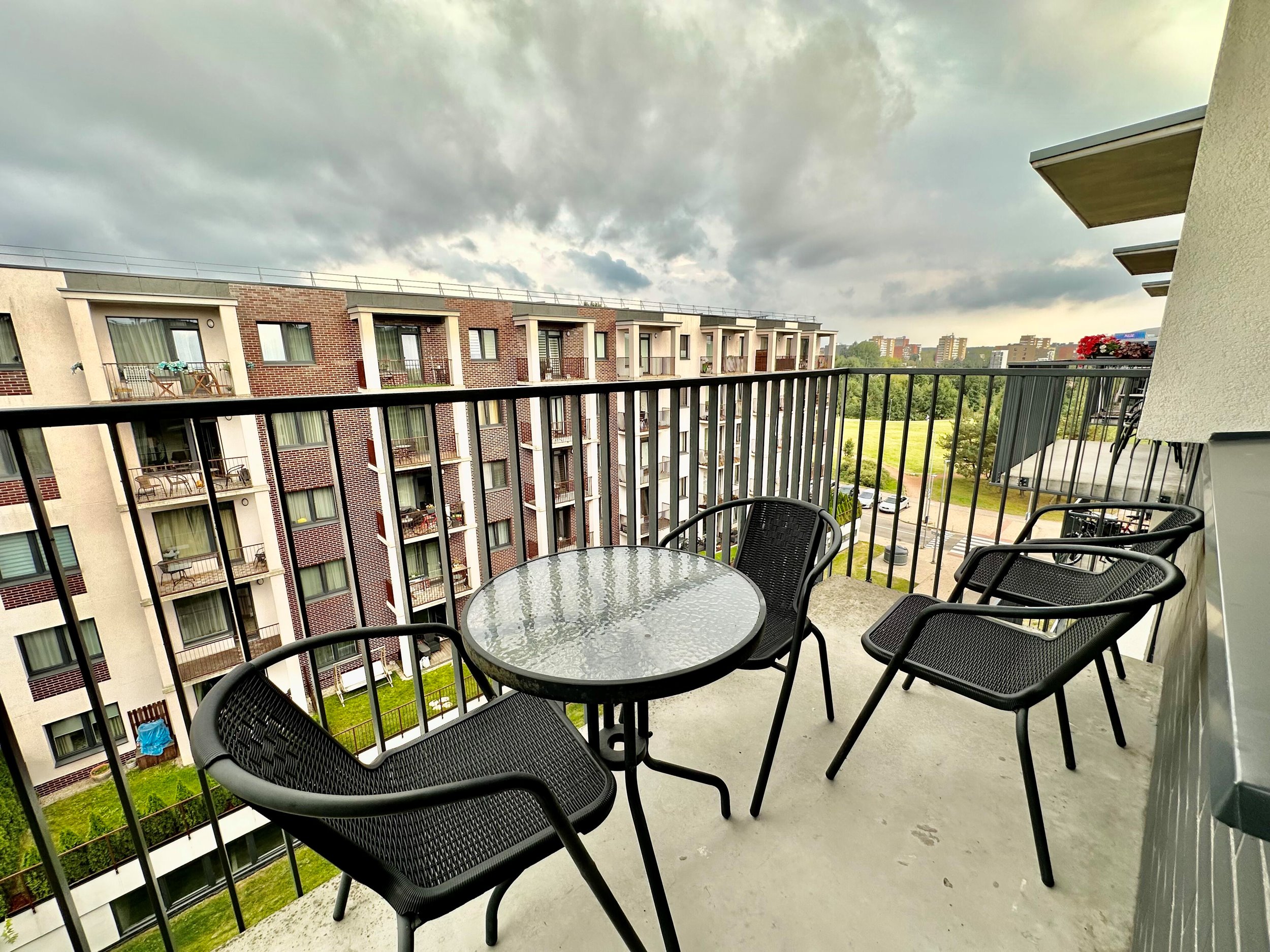 Išplanavimas: svetainė, virtuvė, balkonas, miegamasis, tualetas su vonia ir dušu.