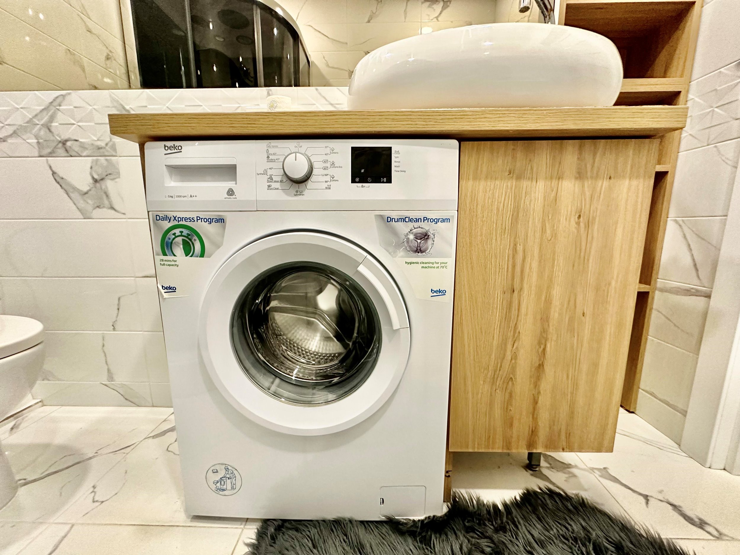 Bute yra visi reikalingiausi baldai: skalbimo mašina, šaldytuvas su šaldikliu, kaitlentė ir t.t.