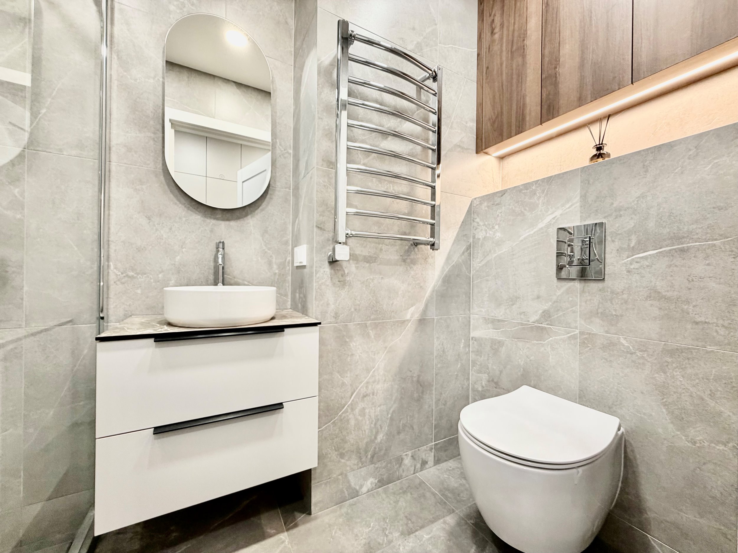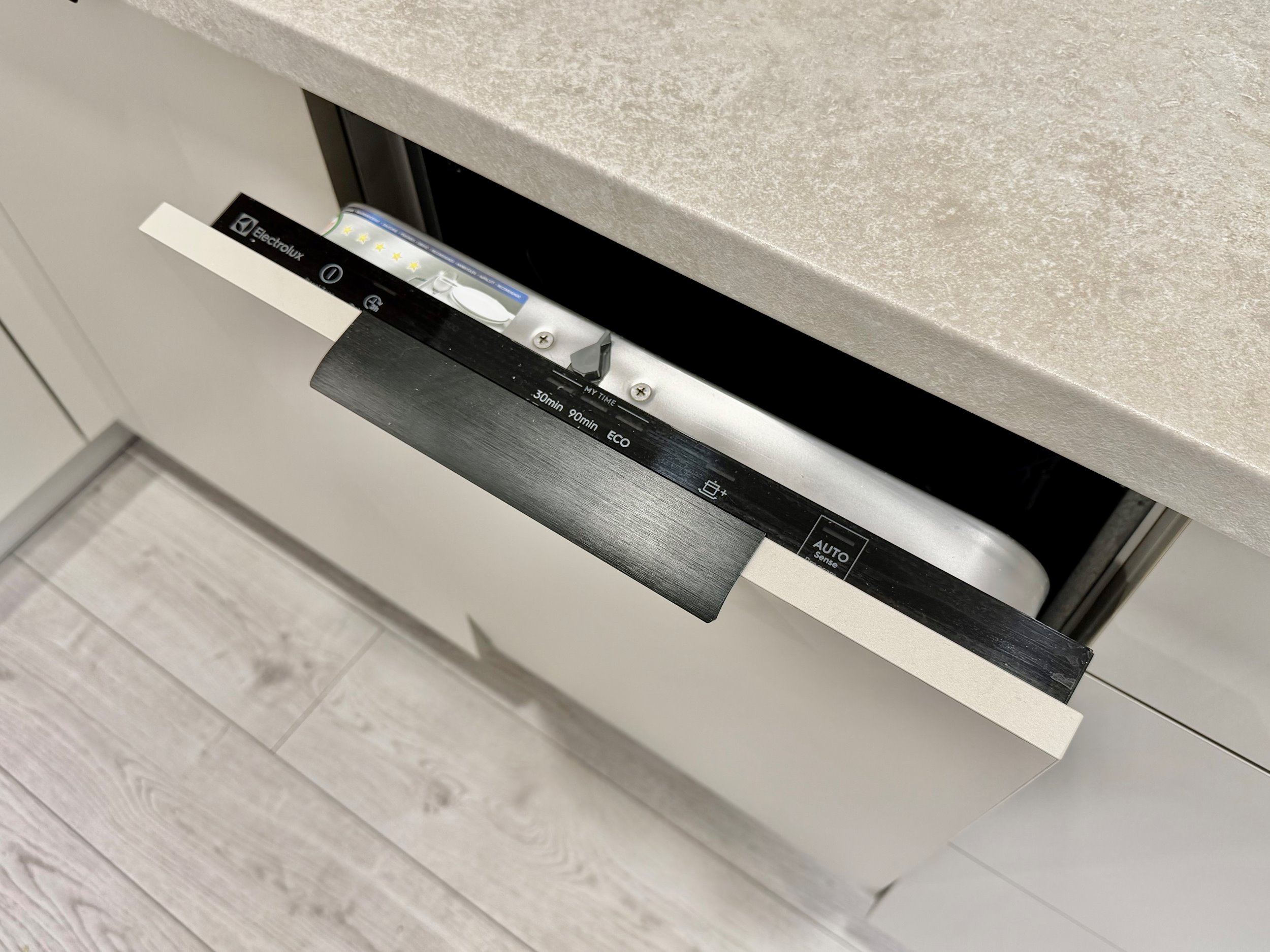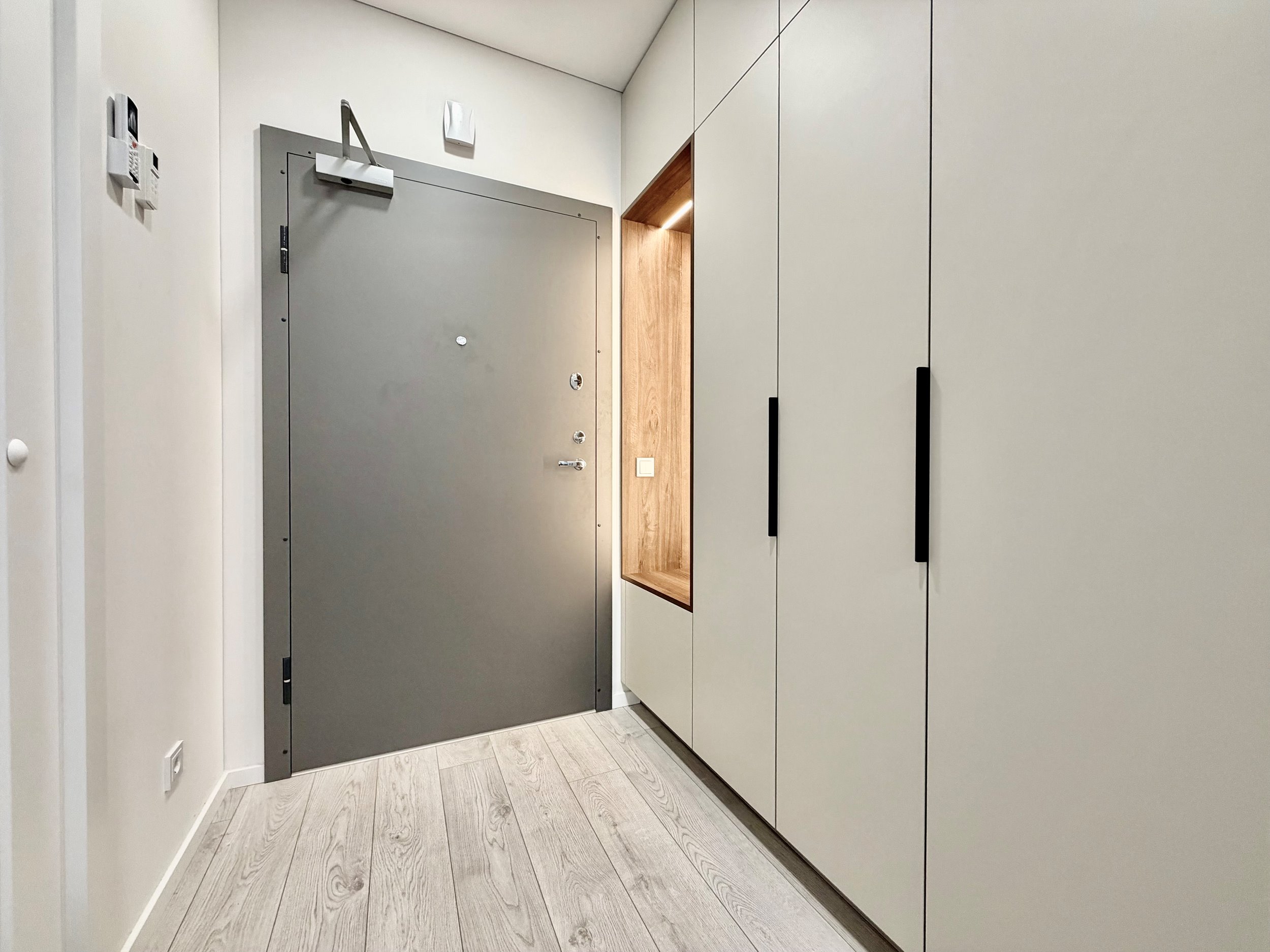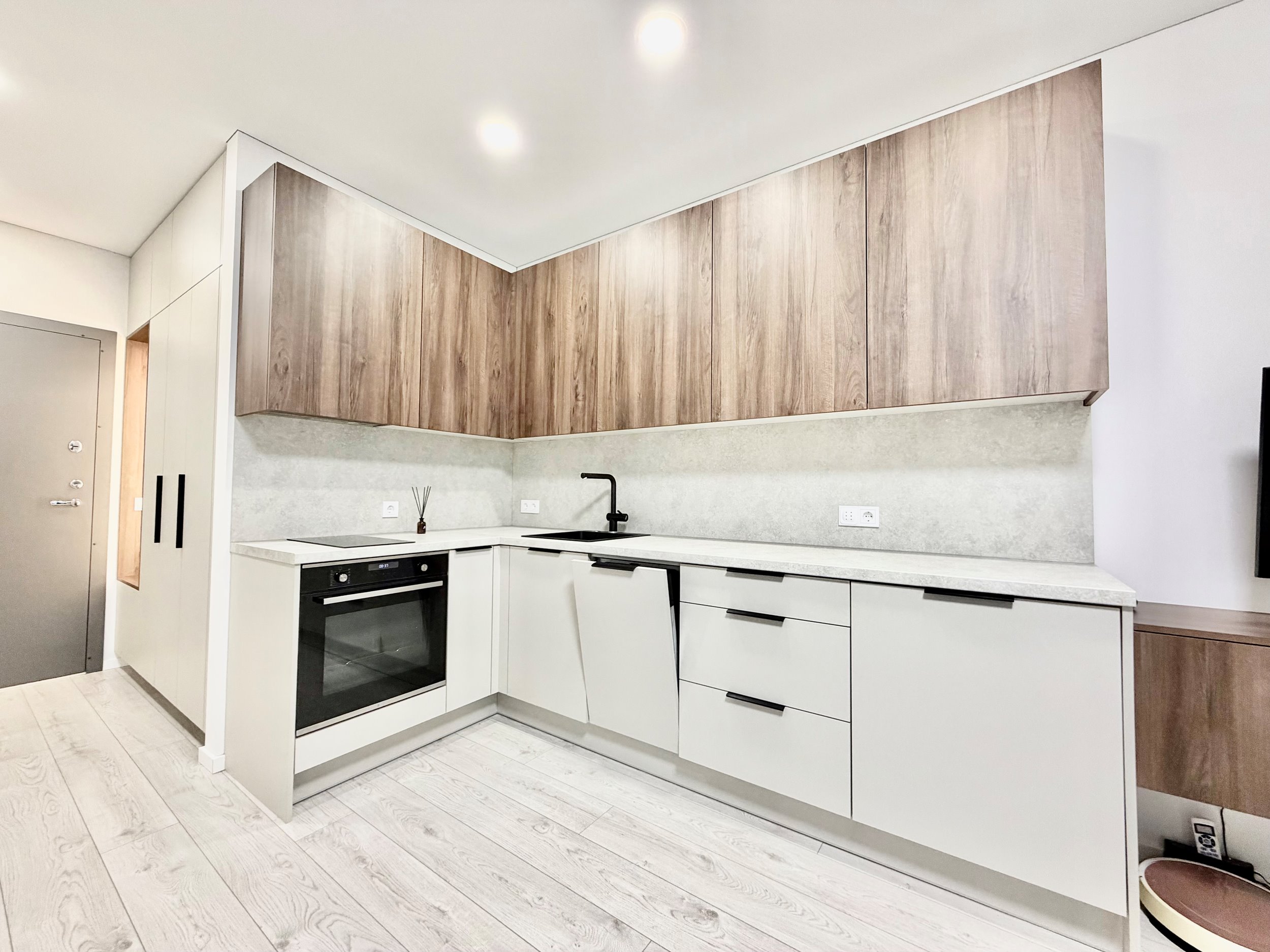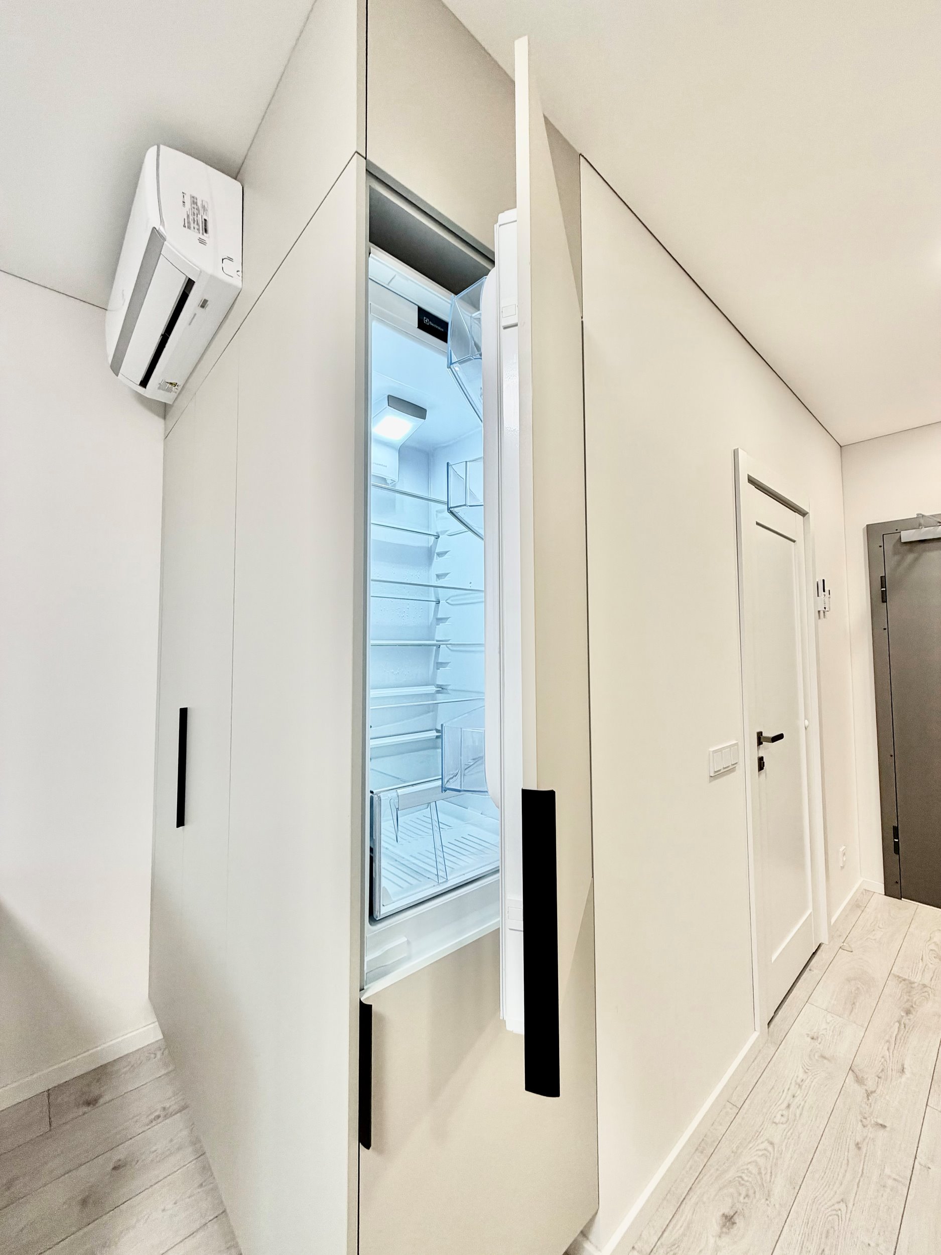 Bute yra visi reikalingiausi baldai: skalbimo mašina su džiovykle, indaplovė, šaldytuvas su šaldikliu, kaitlentė ir t.t.