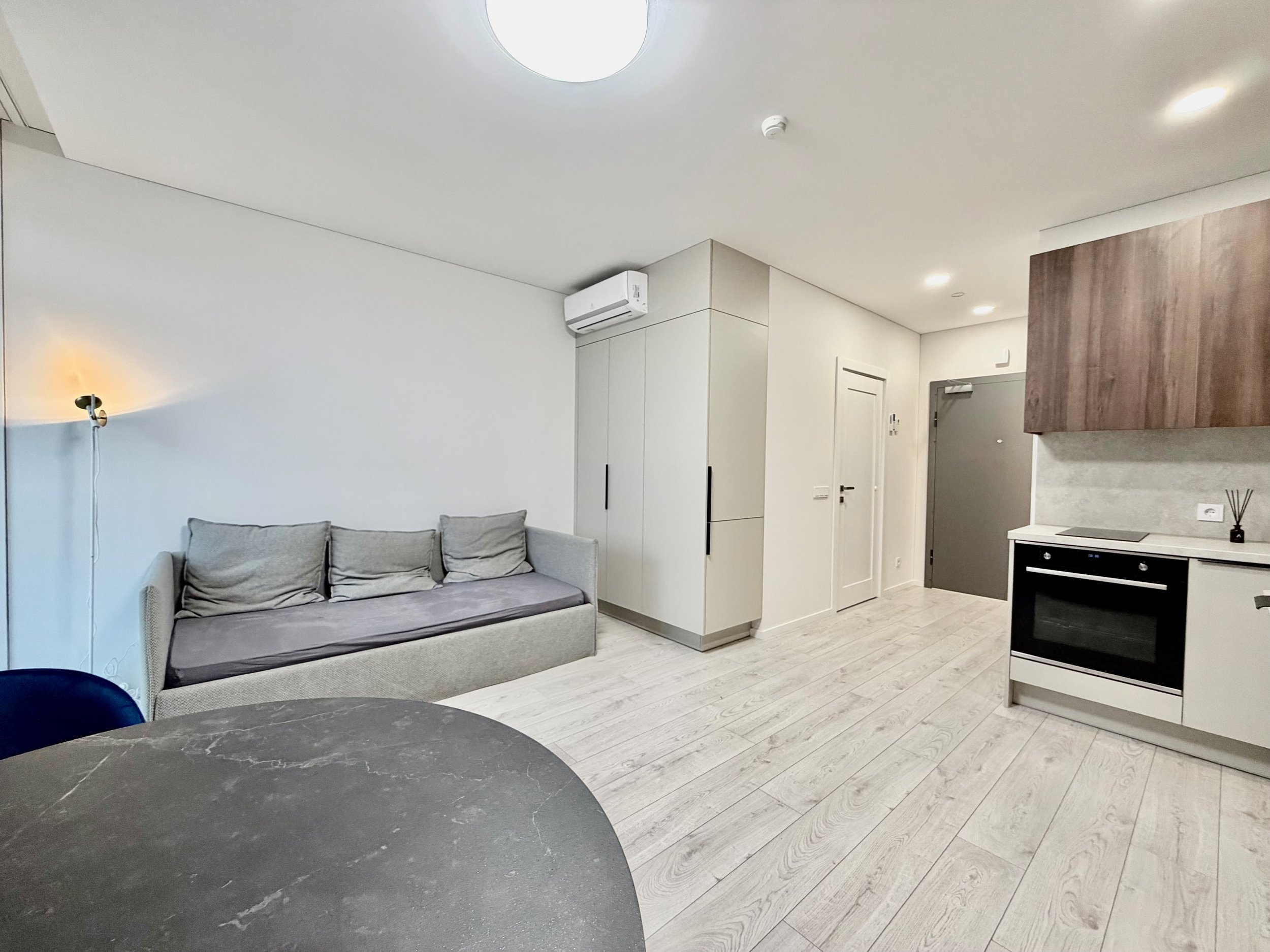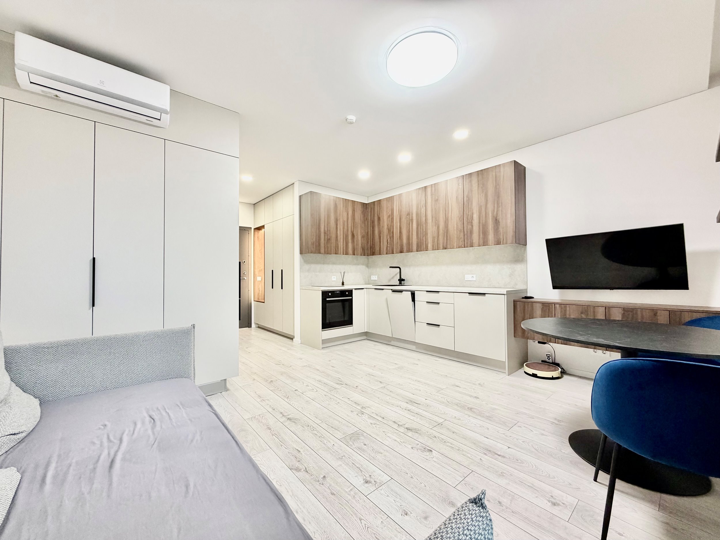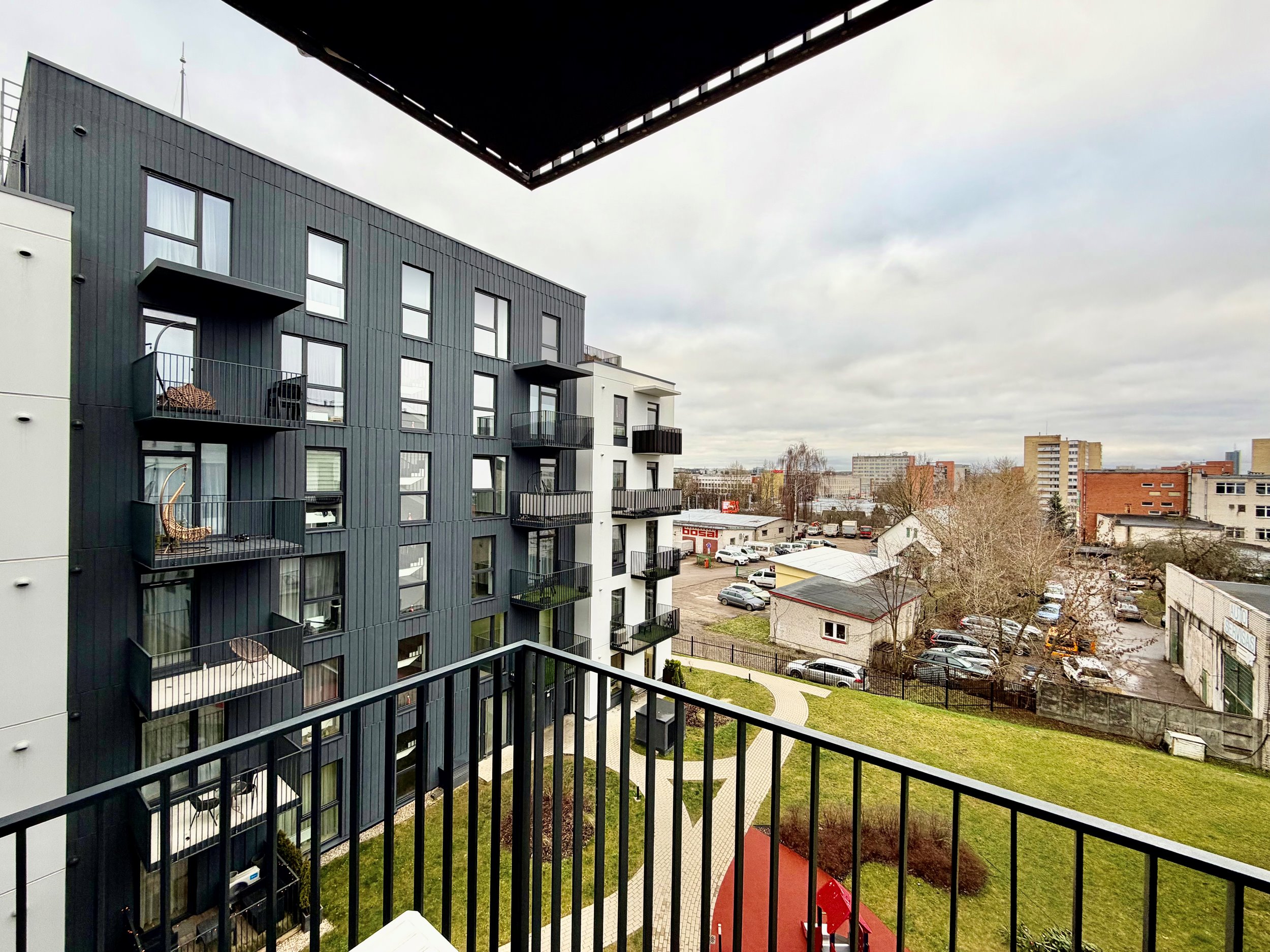 Išplanavimas: svetainė su miegamuoju, virtuve ir valgomuoju, tualetas ir dušas, erdvus balkonas - terasa.