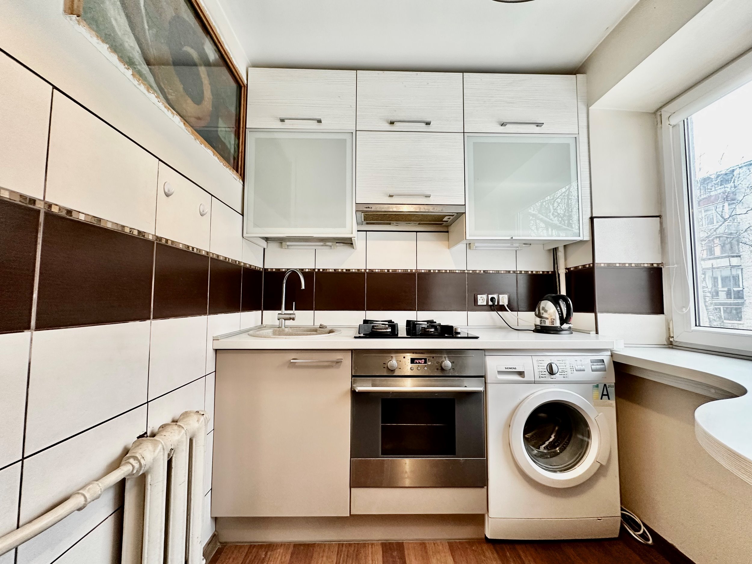 - Bute yra visi reikalingiausi baldai (sofa-lova, skalbimo mašina, dujinė viryklė, orkaitė, šaldytuvas).