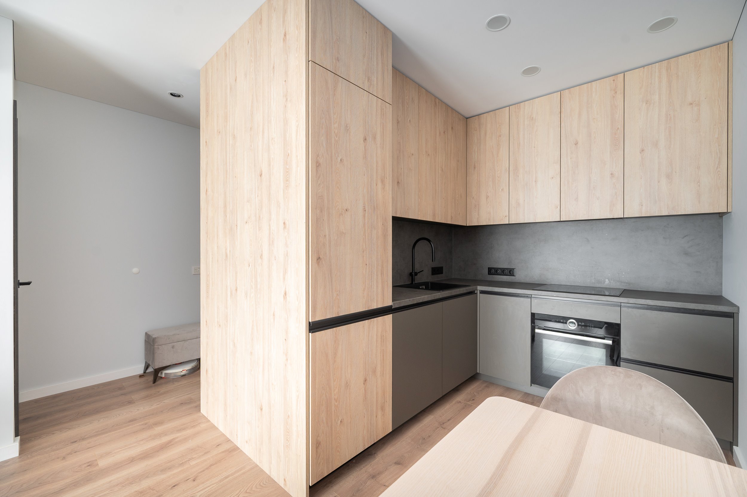 Modernus ir funkcionalus išplanavimas: svetainė su virtuve, atskiras miegamasis, vonios kambarys.