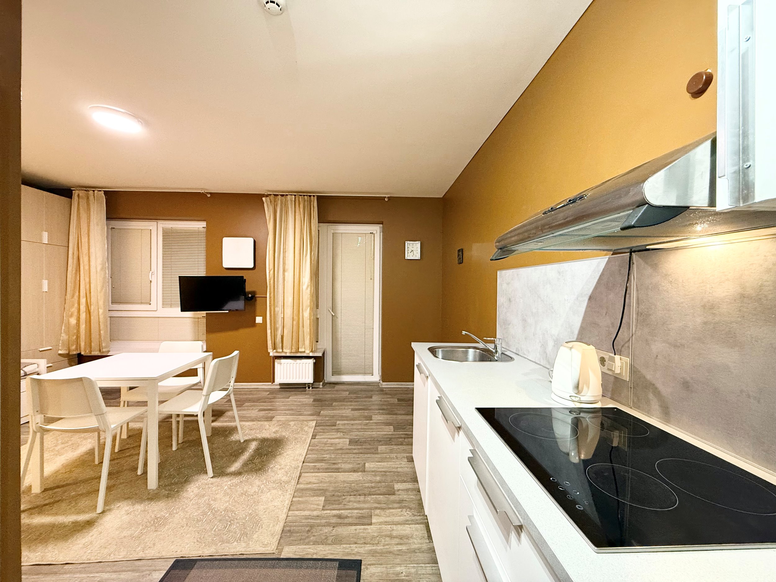Išplanavimas: svetainė/virtuvė/miegamasis, vonios kambarys su dušu,erdvi 14 m2. terasa.