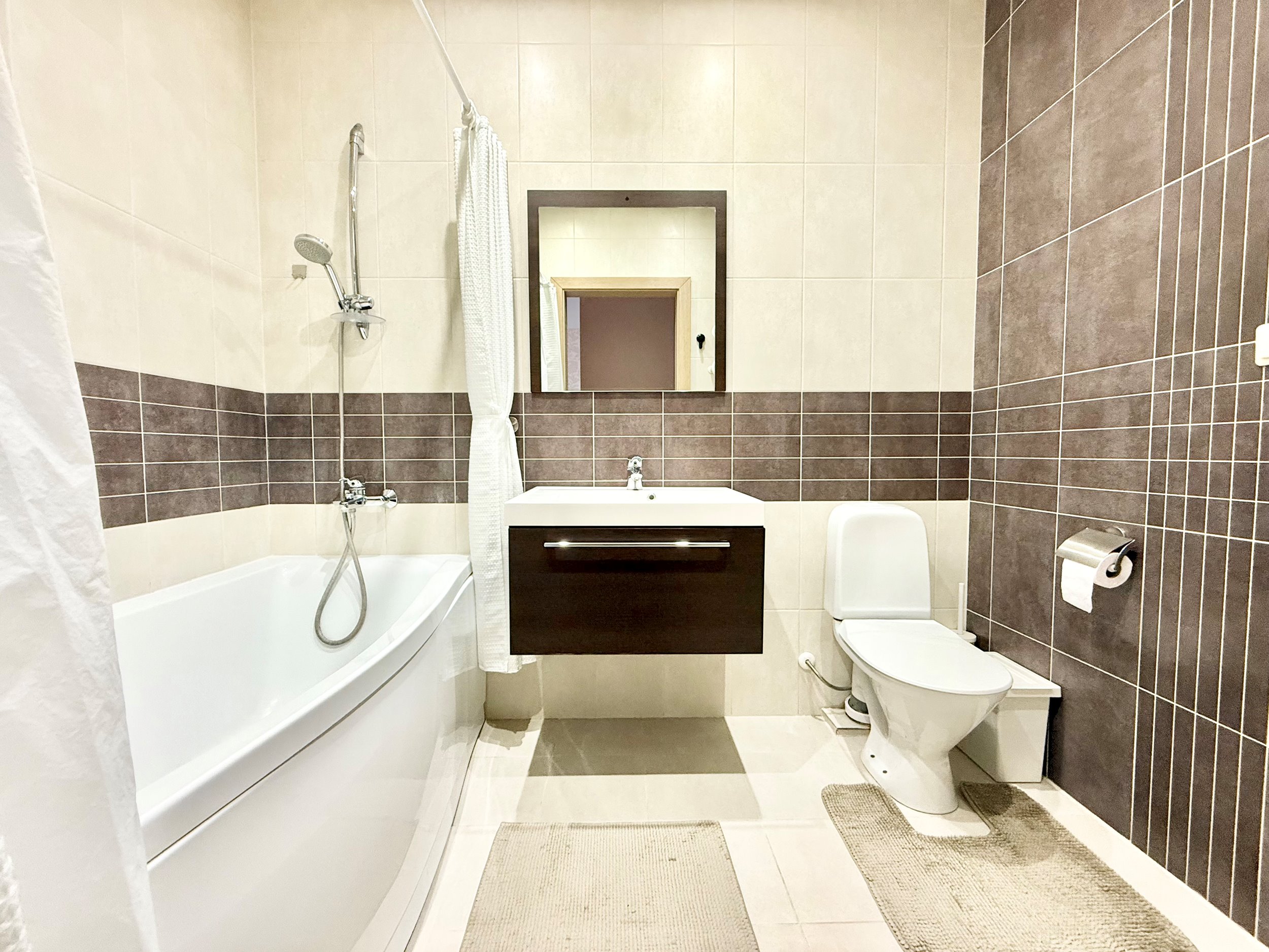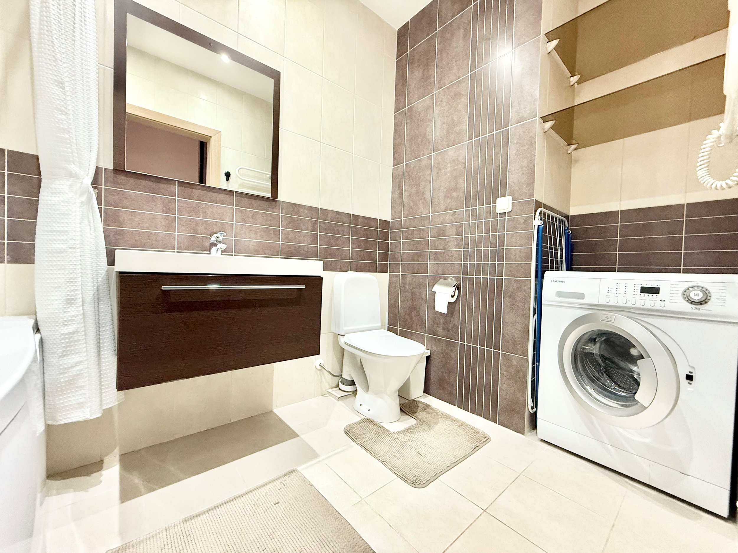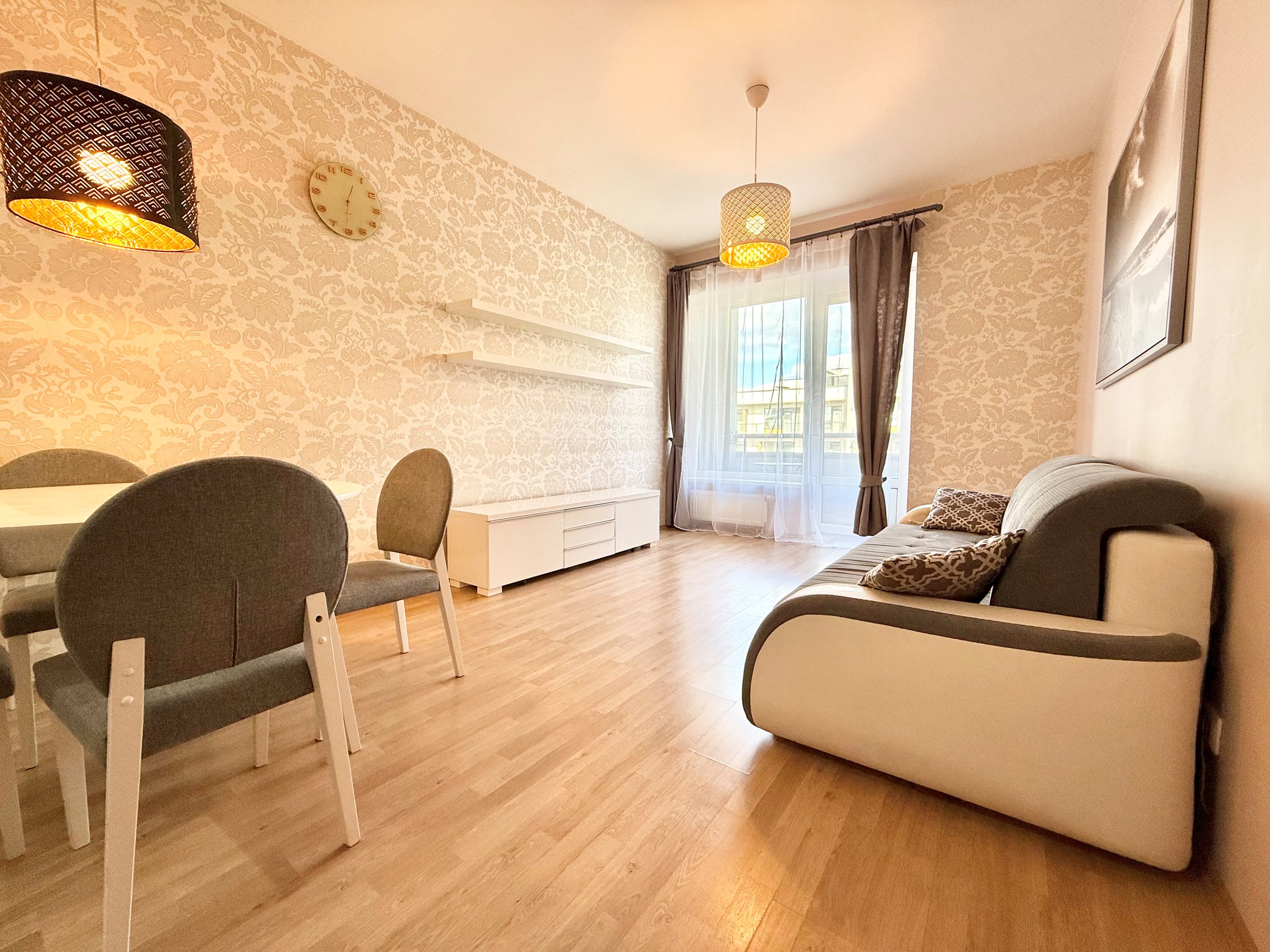 Bute yra visi reikalingi baldai, sofa-lova, dvigulė lova miegamajame, drabužių spinta, šaldytuvas su šaldikliu, viryklė, skalbimo mašina, indaplovė.