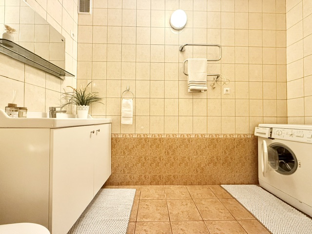 Šildymas: dujinis, reguliuojamas. Maži šildymo kaštai. Vonioje šildomos grindys.