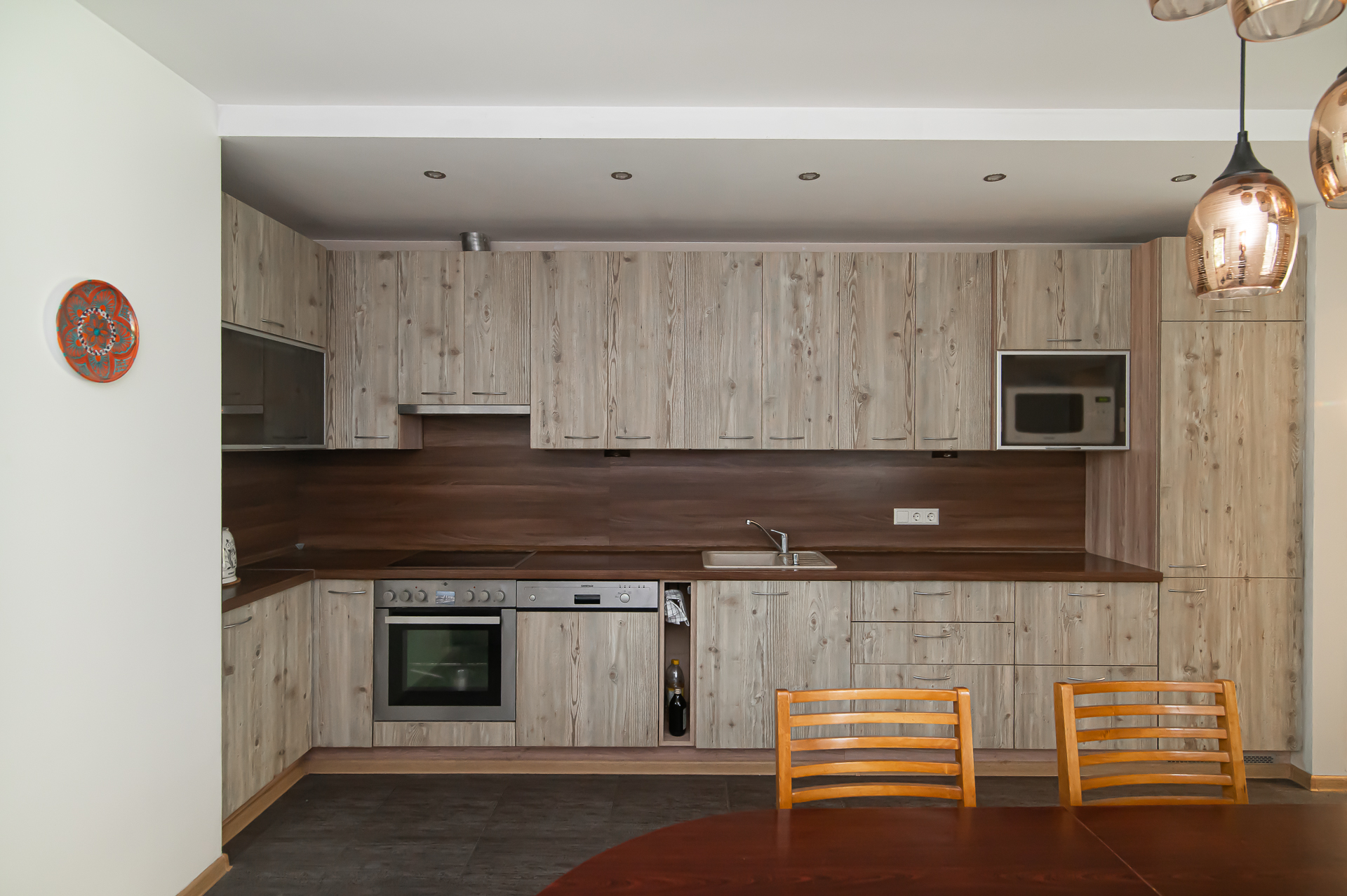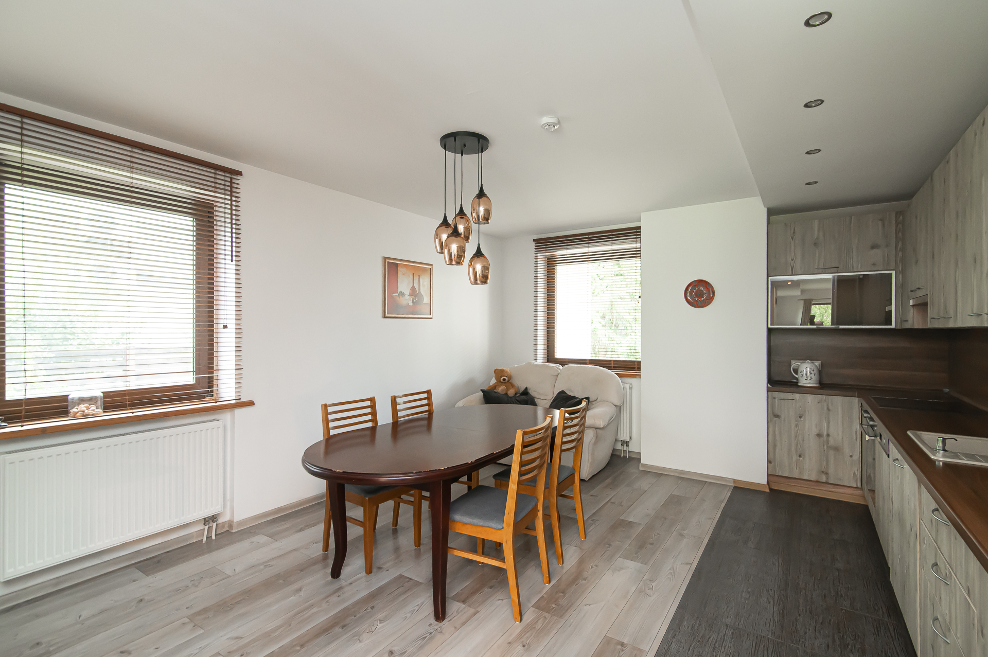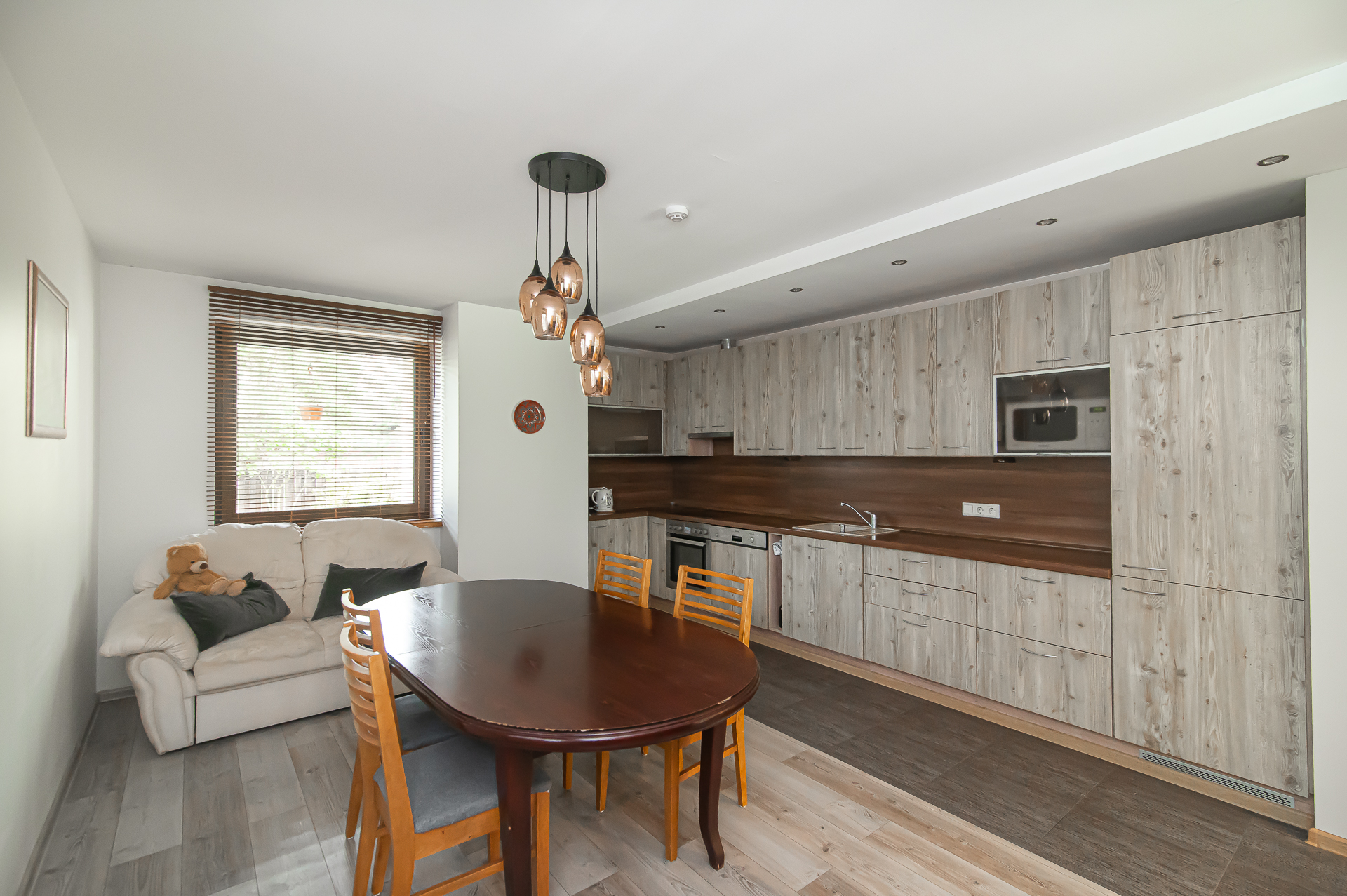 Name yra visi reikalingiausi baldai, sofa-lova, skalbimo mašina, indaplovė, šaldytuvas su šaldikliu, viryklė ir t.t.
