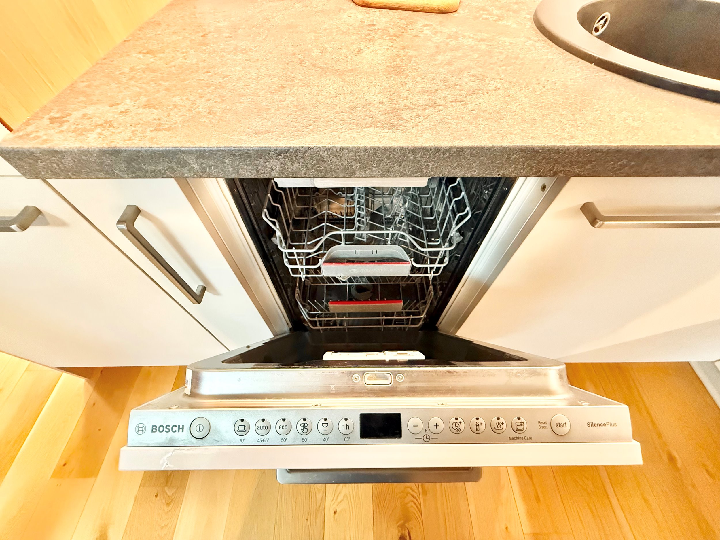 Bute yra visi reikalingiausi baldai, sofa-lova , skalbimo mašina su džiovinimo funkcija, indaplovė, šaldytuvas su šaldikliu, viryklė, ir t.t.