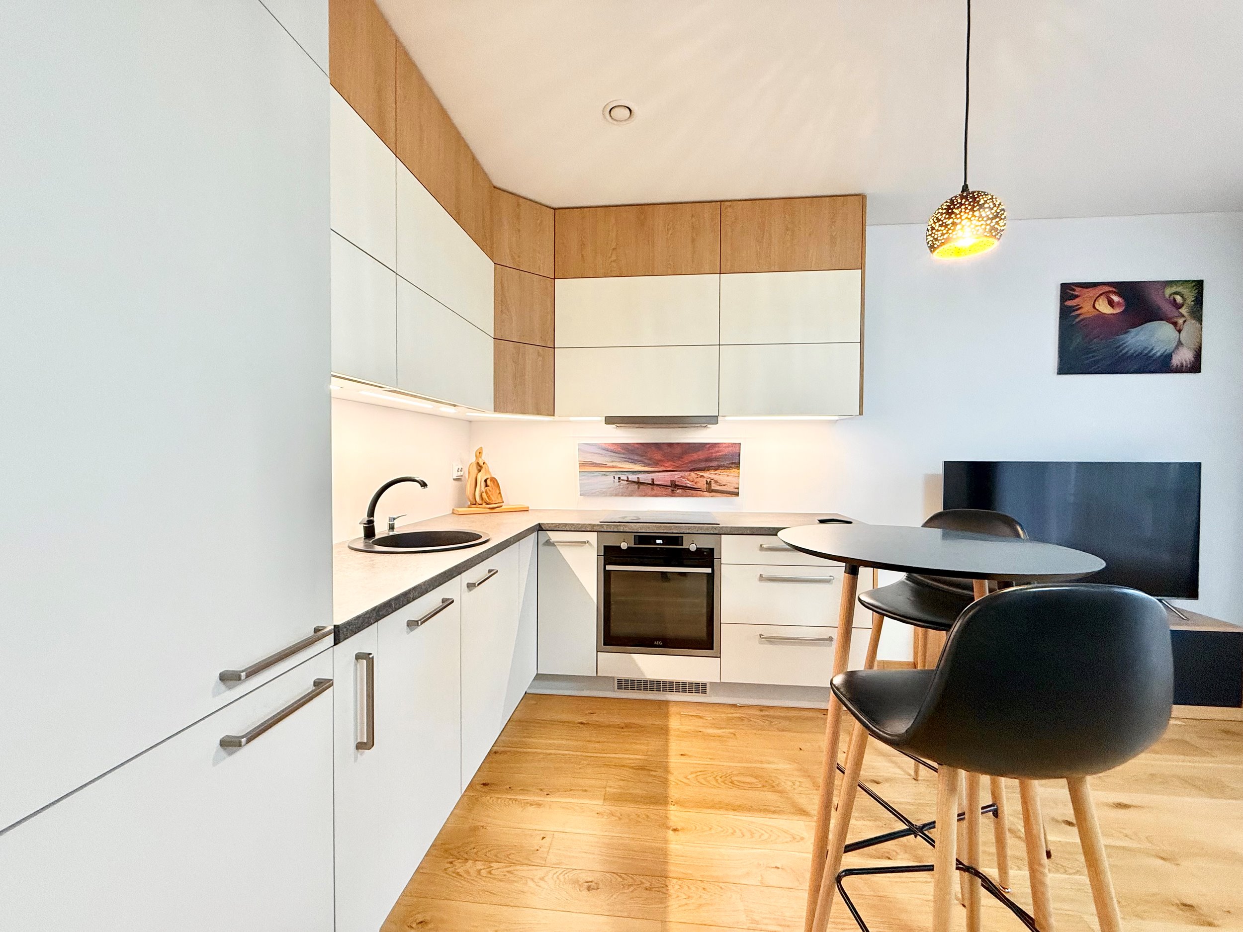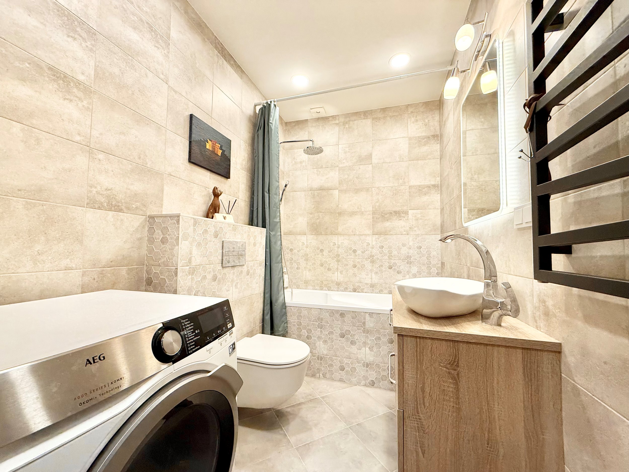 Bute yra visi reikalingiausi baldai, sofa-lova , skalbimo mašina su džiovinimo funkcija, indaplovė, šaldytuvas su šaldikliu, viryklė, ir t.t.