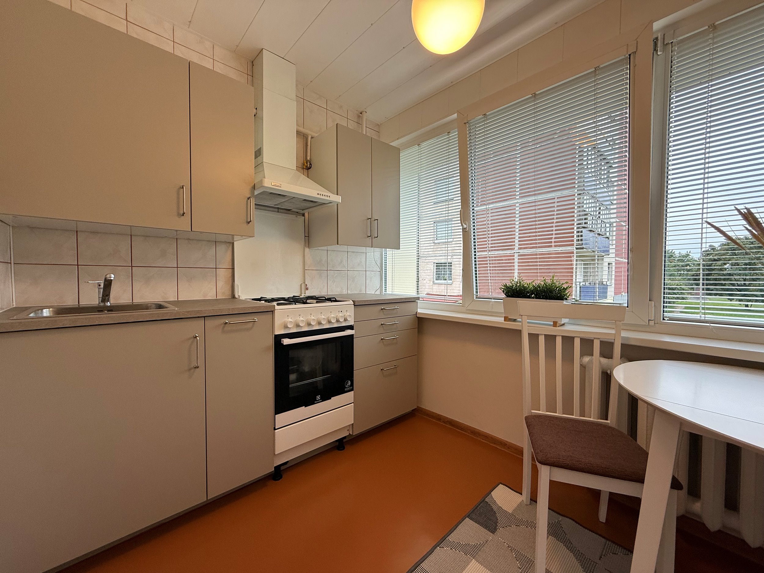 Išplanavimas: svetainė/miegamasis, virtuvė, tamsus kambarys, vonios kambarys, vonia.