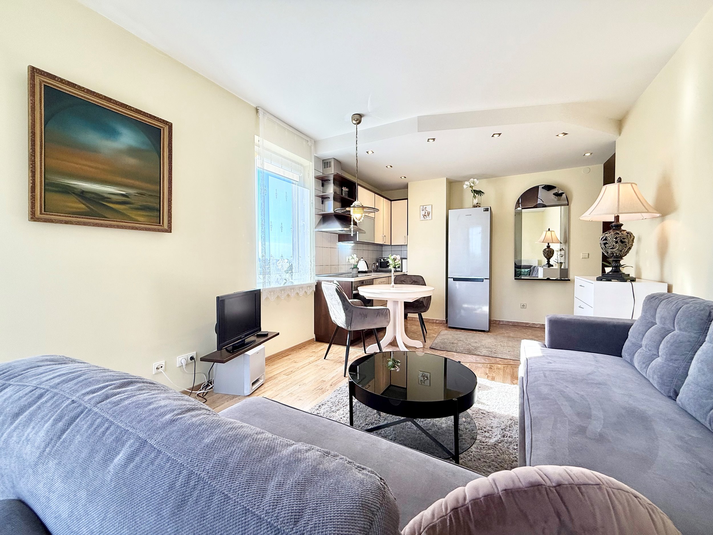 Bute yra visi reikalingiausi baldai, sofa-lova (kampas), skalbimo mašina, šaldytuvas, viryklė ir t.t.