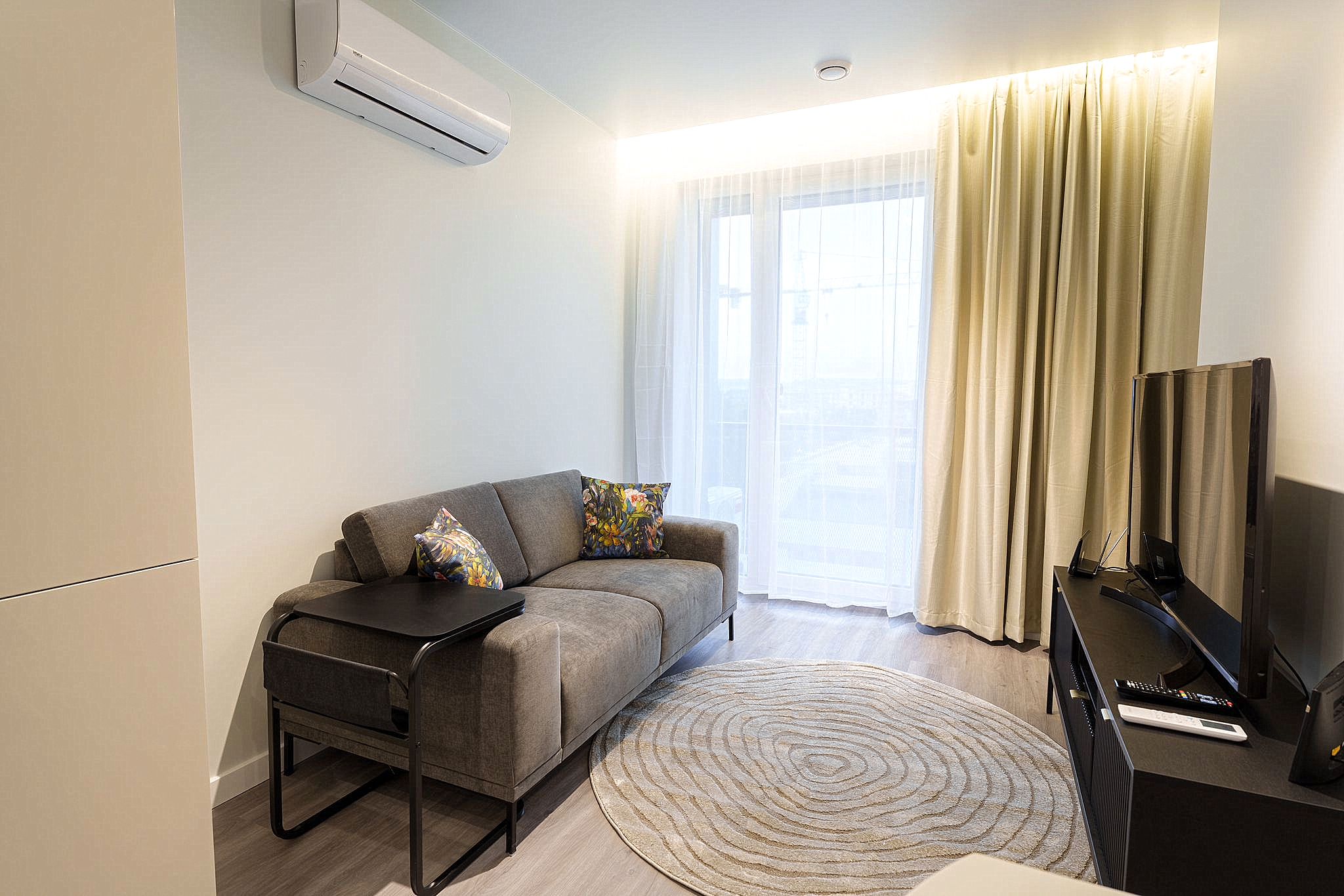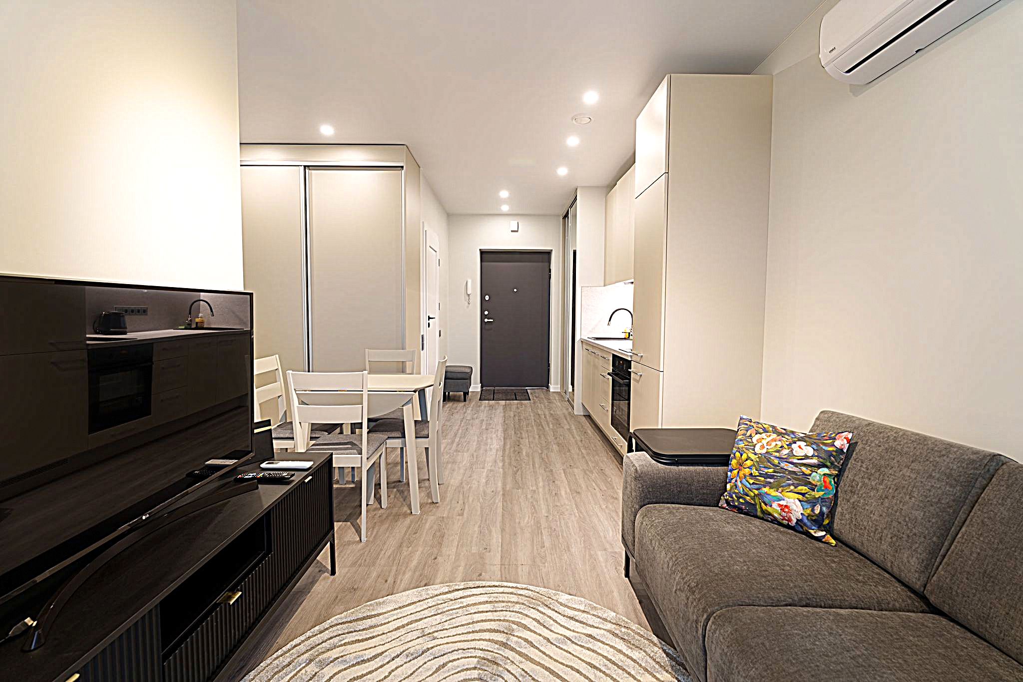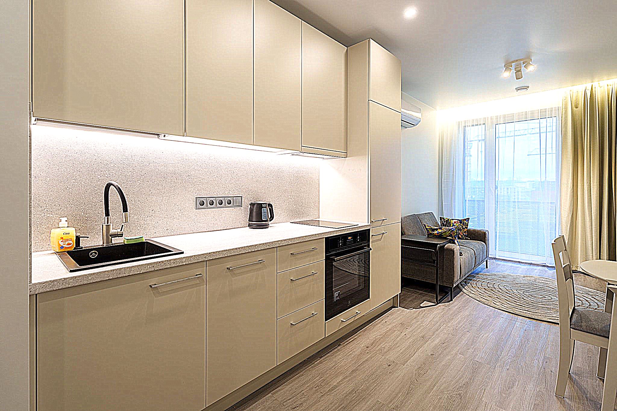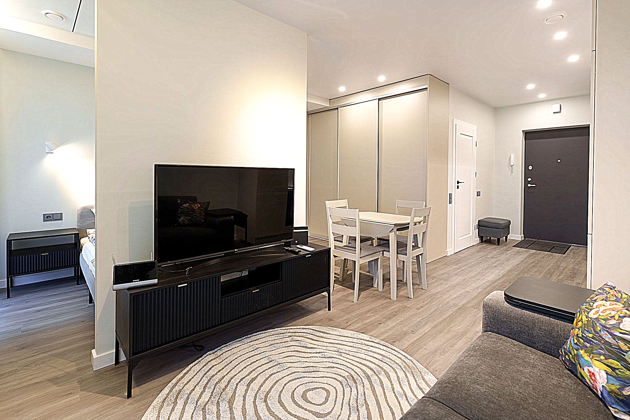 • Butas nuomojamas su visais nuotraukose matomais baldais ir buitine technika (orkaitė, šaldytuvas, mikrobangų krosnelė, skalbimo mašina), minimaliais virtuvės indais (įrankiai, lėkštės, puodeliai).