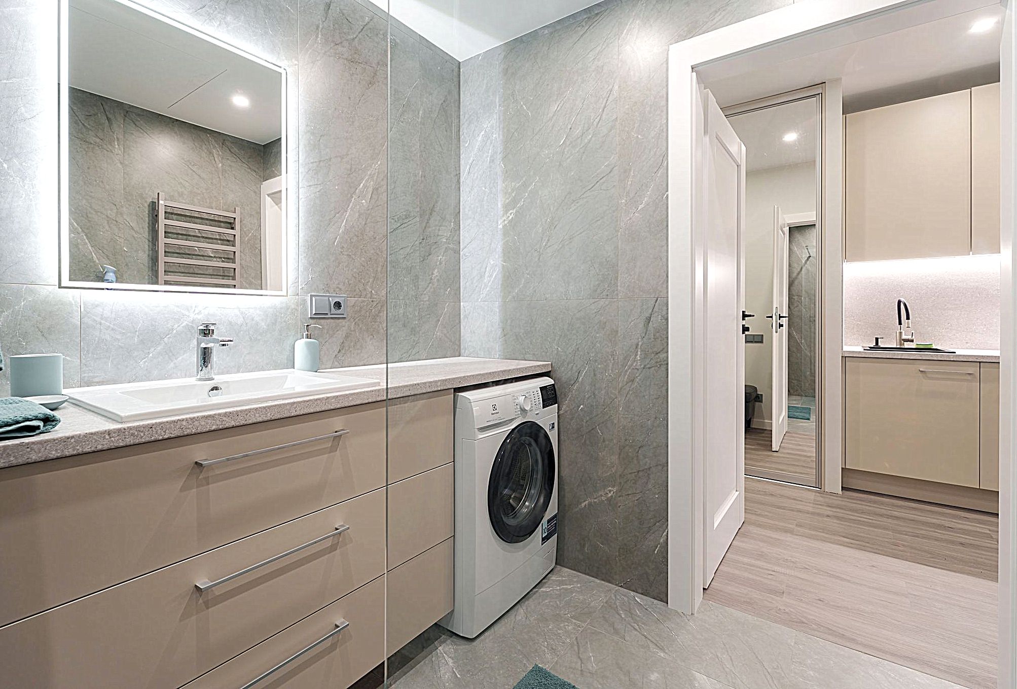 • Vonioje yra skalbimo mašina.
