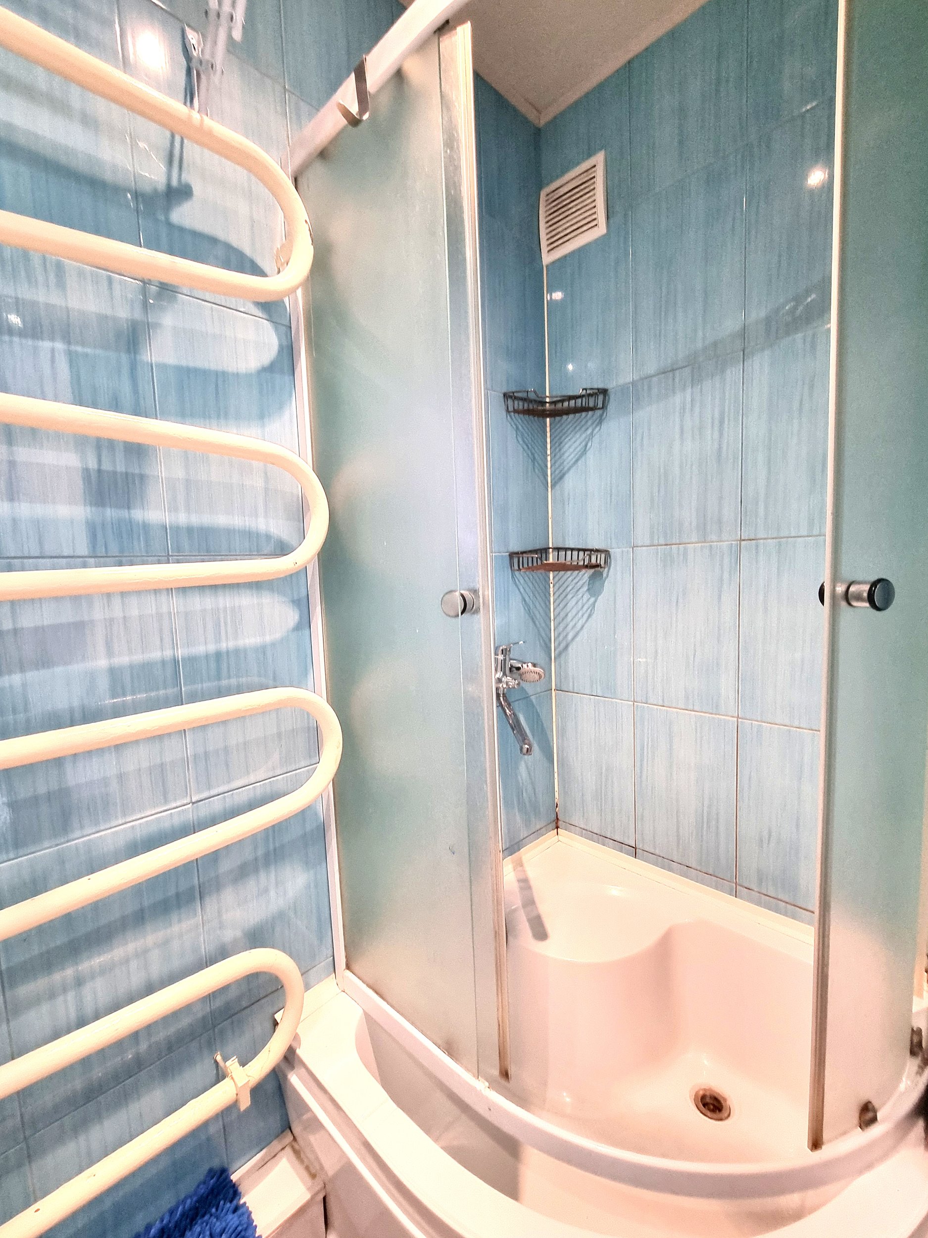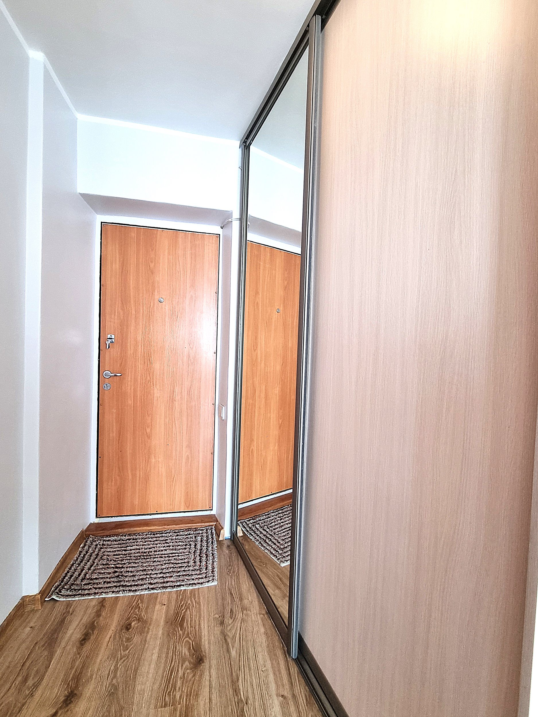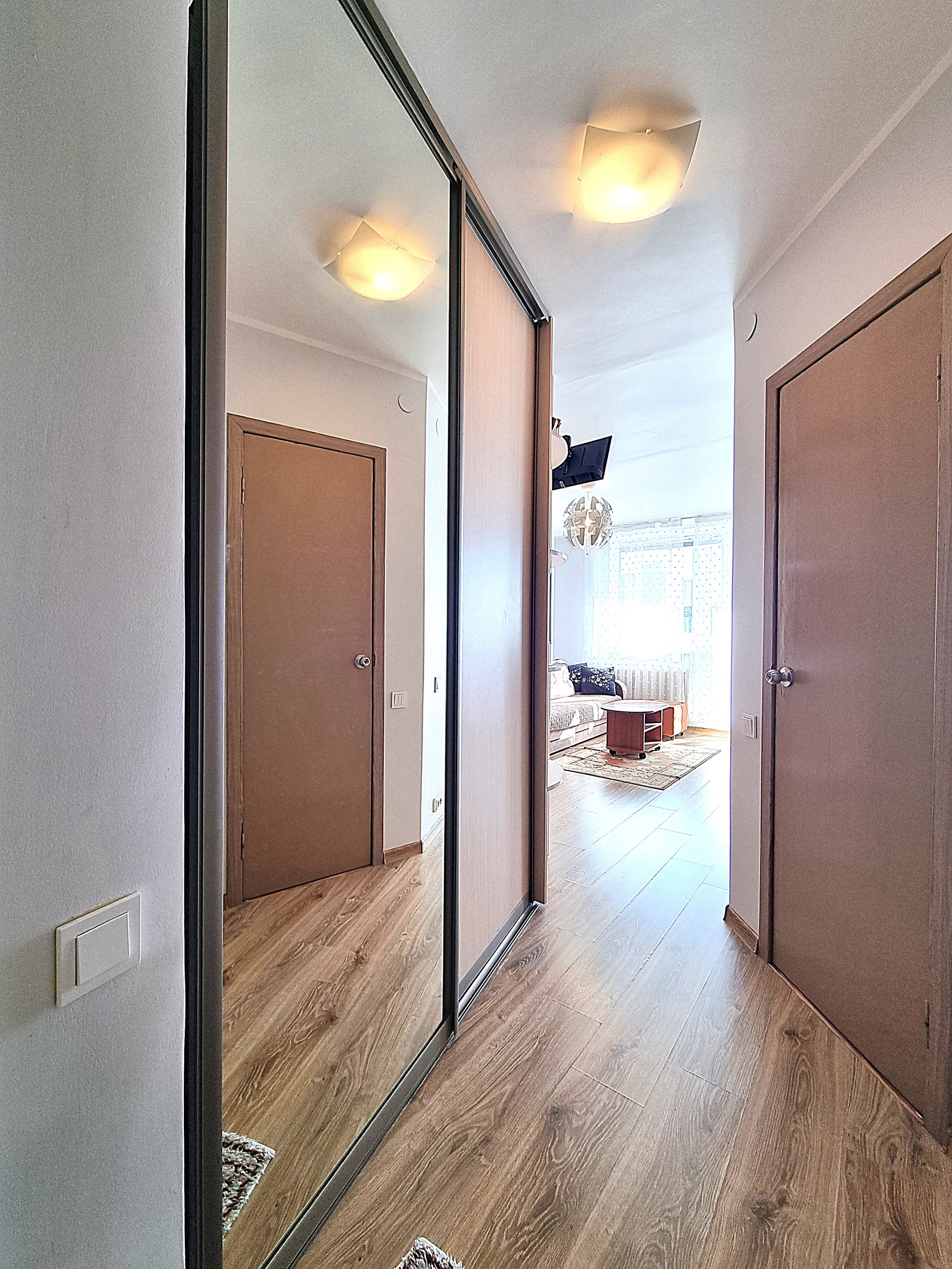 • Prieškambaryje erdvi sieninė spinta iki pat lubų.