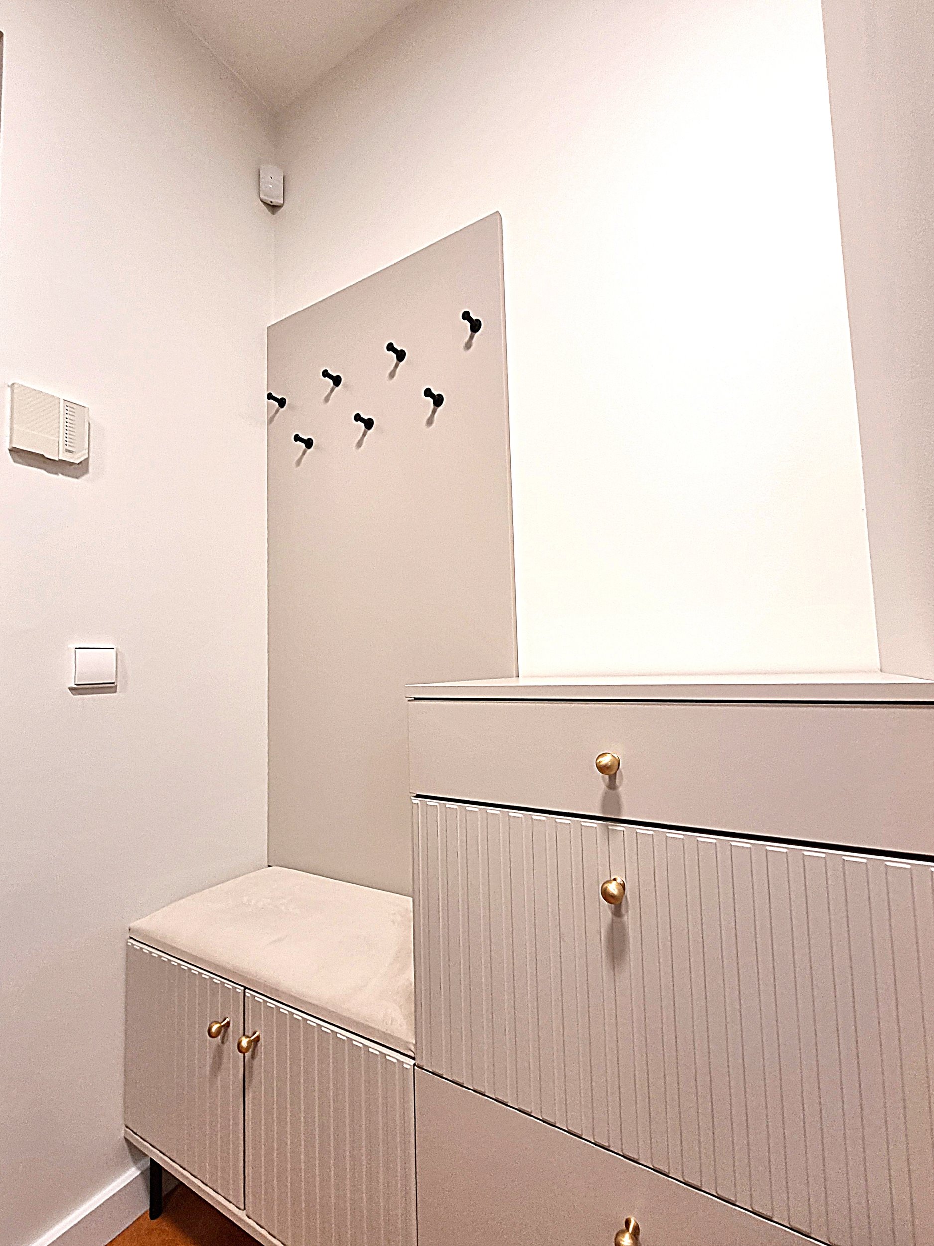 • Prieškambaryje erdvi sieninė spinta iki pat lubų.