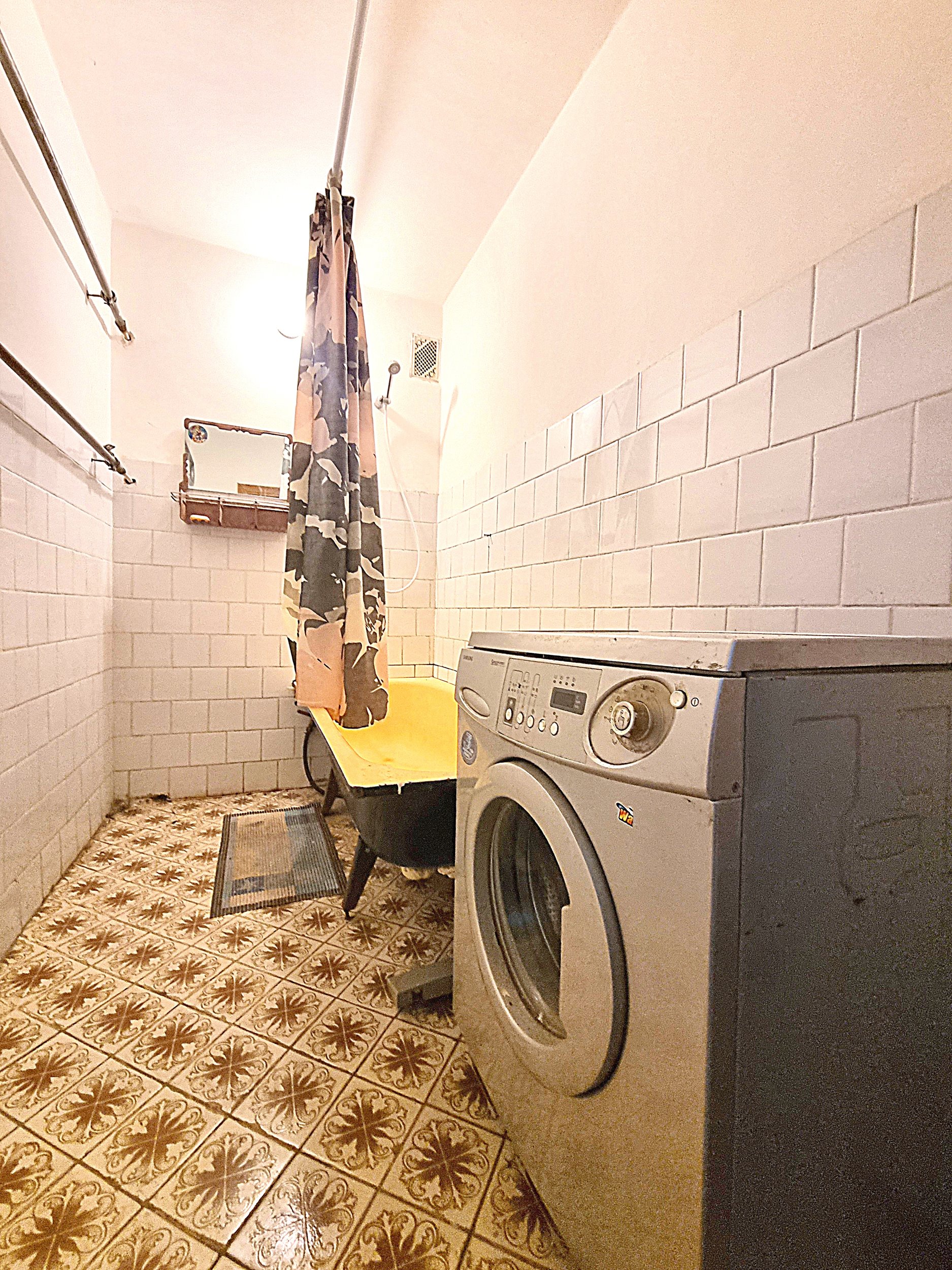 Bute yra visi reikalingiausi baldai: skalbimo mašina, šaldytuvas su šaldikliu.