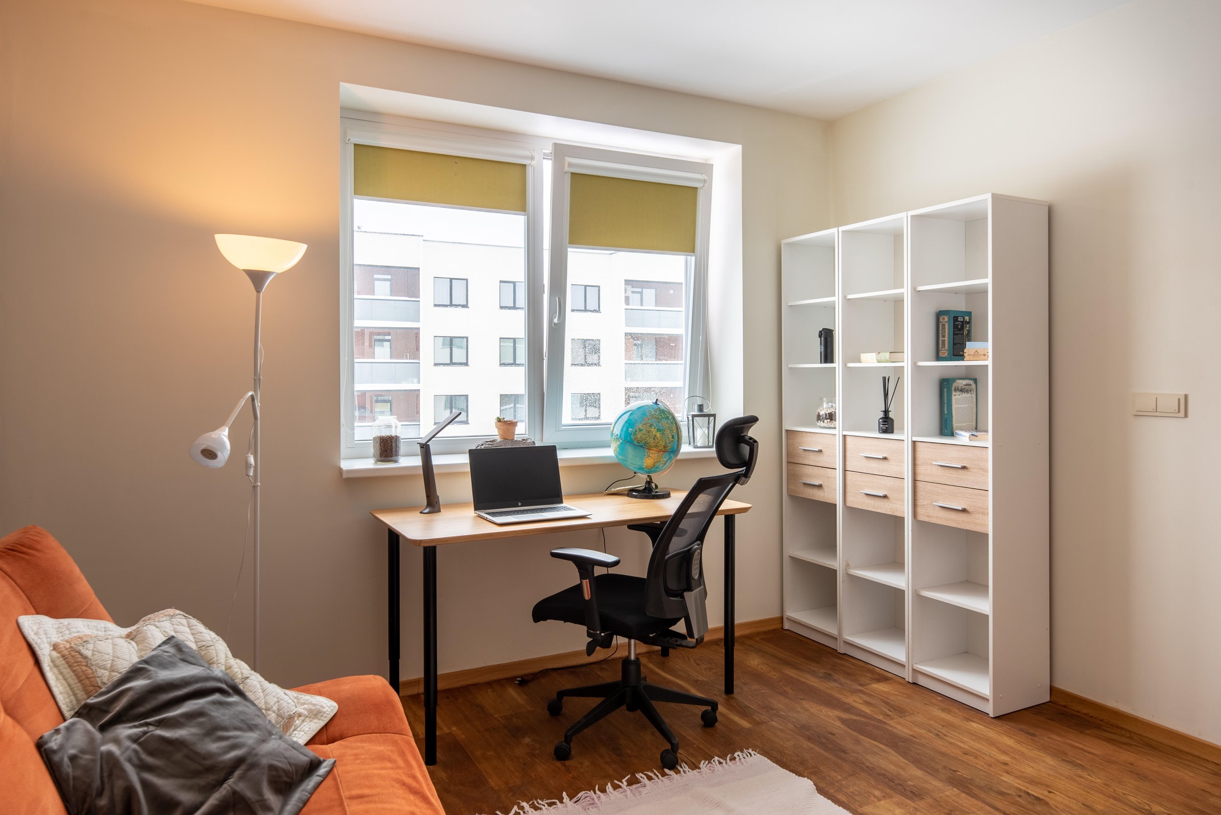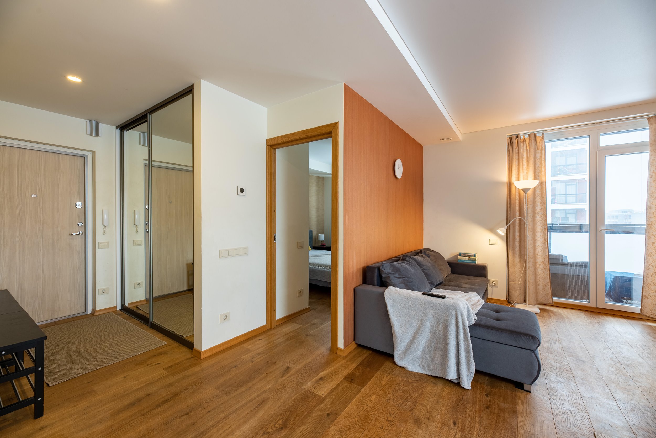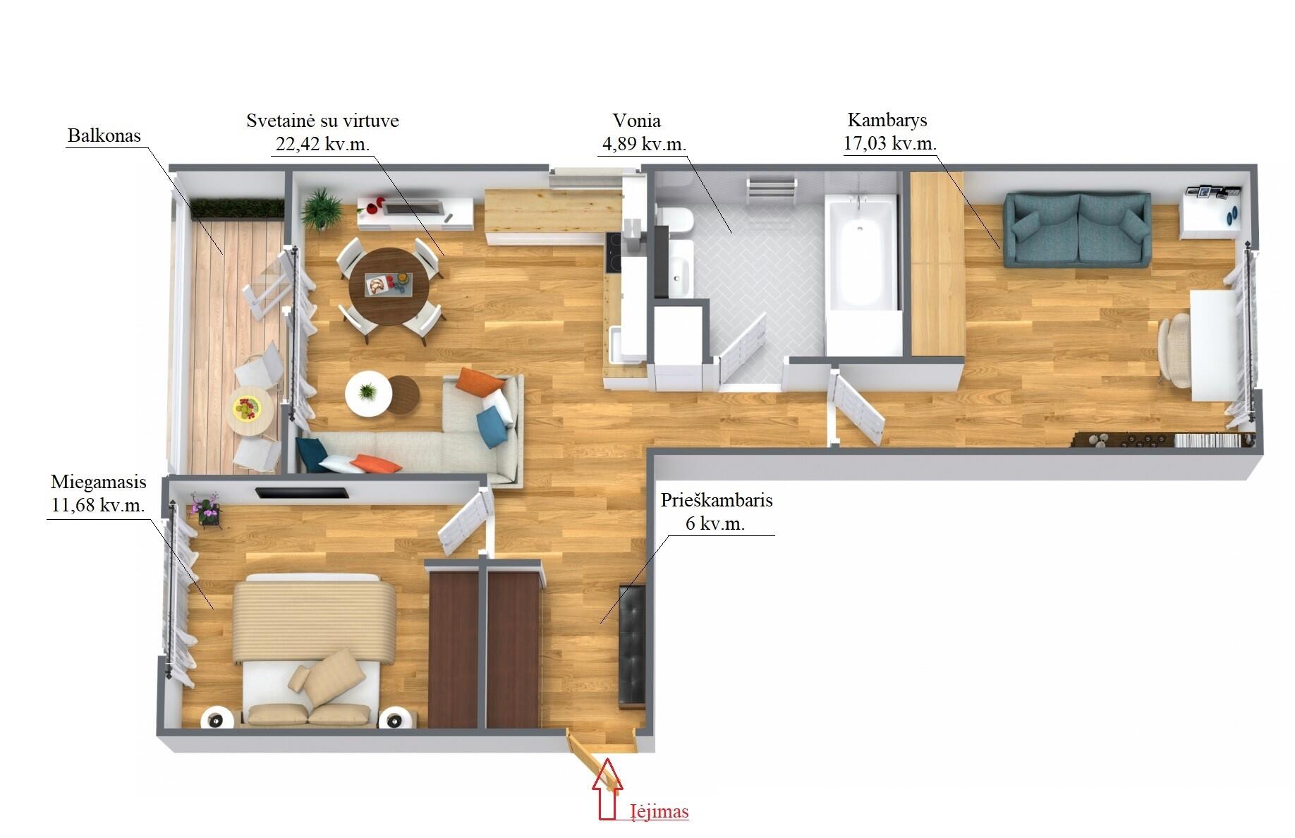 - Butas patogaus išplanavimo: atskiras miegamasis kambarys, virtuvė apjungta su svetaine iš kurios pateksite į jaukią įstiklintą lodžiją su nuostabiu gamtos vaizdu, atskiras universalus darbo/poilsio/studijų kambarys,