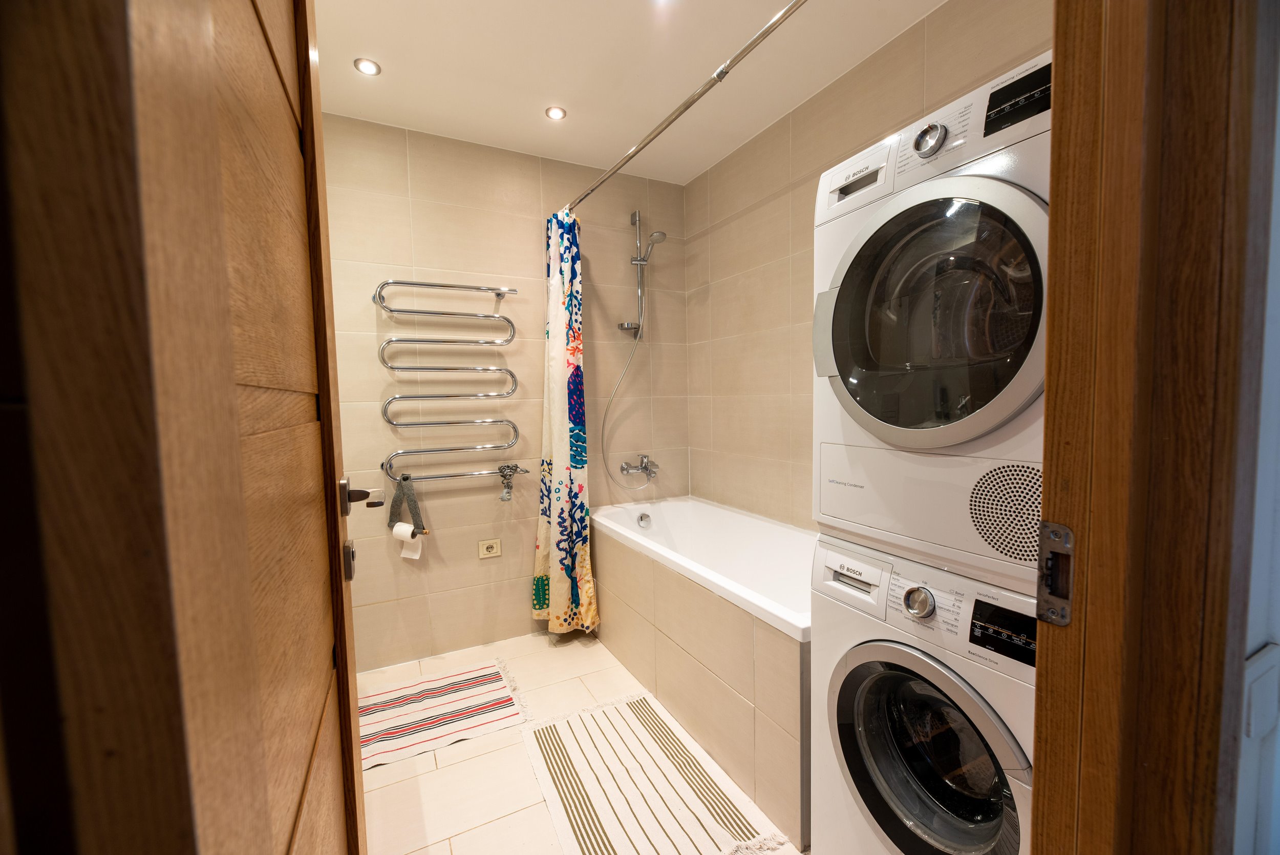 - Vonios kambaryje džiovyklė pajungta į bendrą nutekėjimo sistemą (nereikia išpylinėti vandens), įrengtos šildomos grindys pajungtos į centrinę šildymo sistemą, taip pat yra sumontuotas jų elektrinis šildymas, kurį galima pasijungti rudenį arba pavasarį;