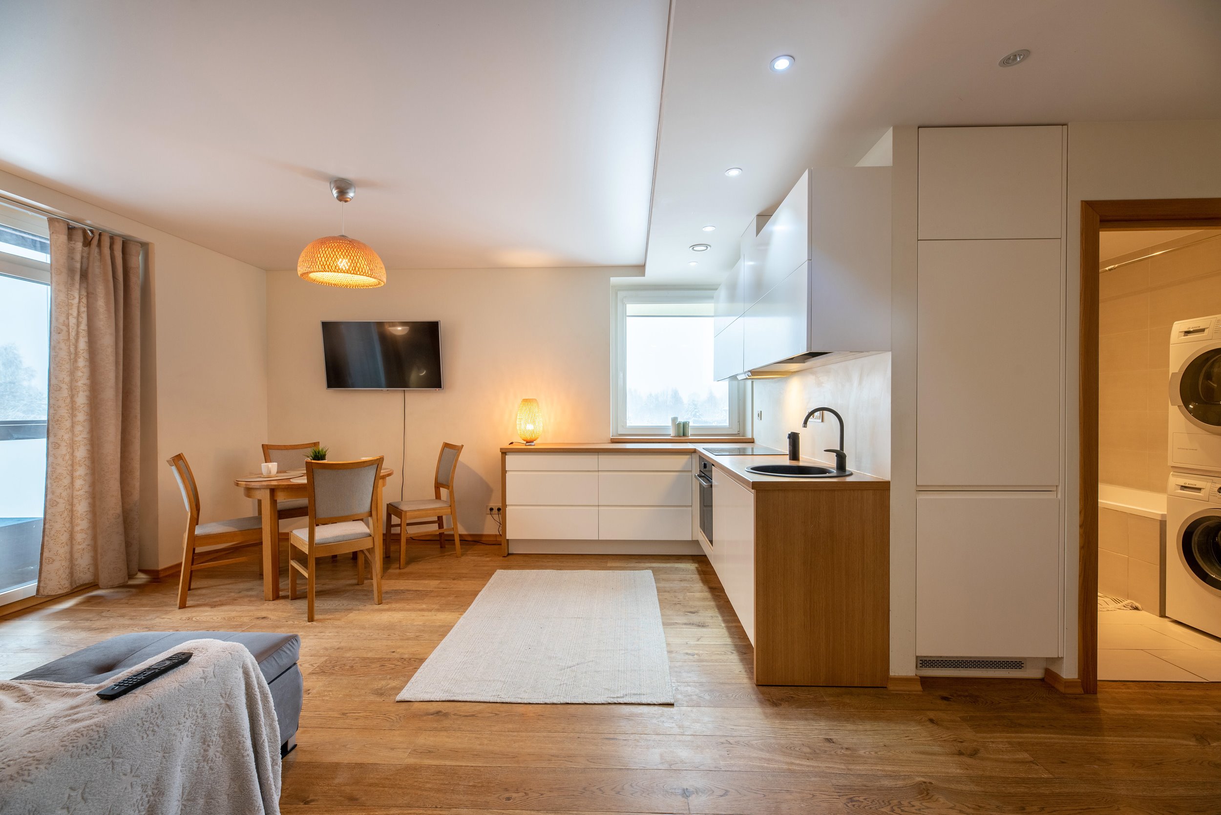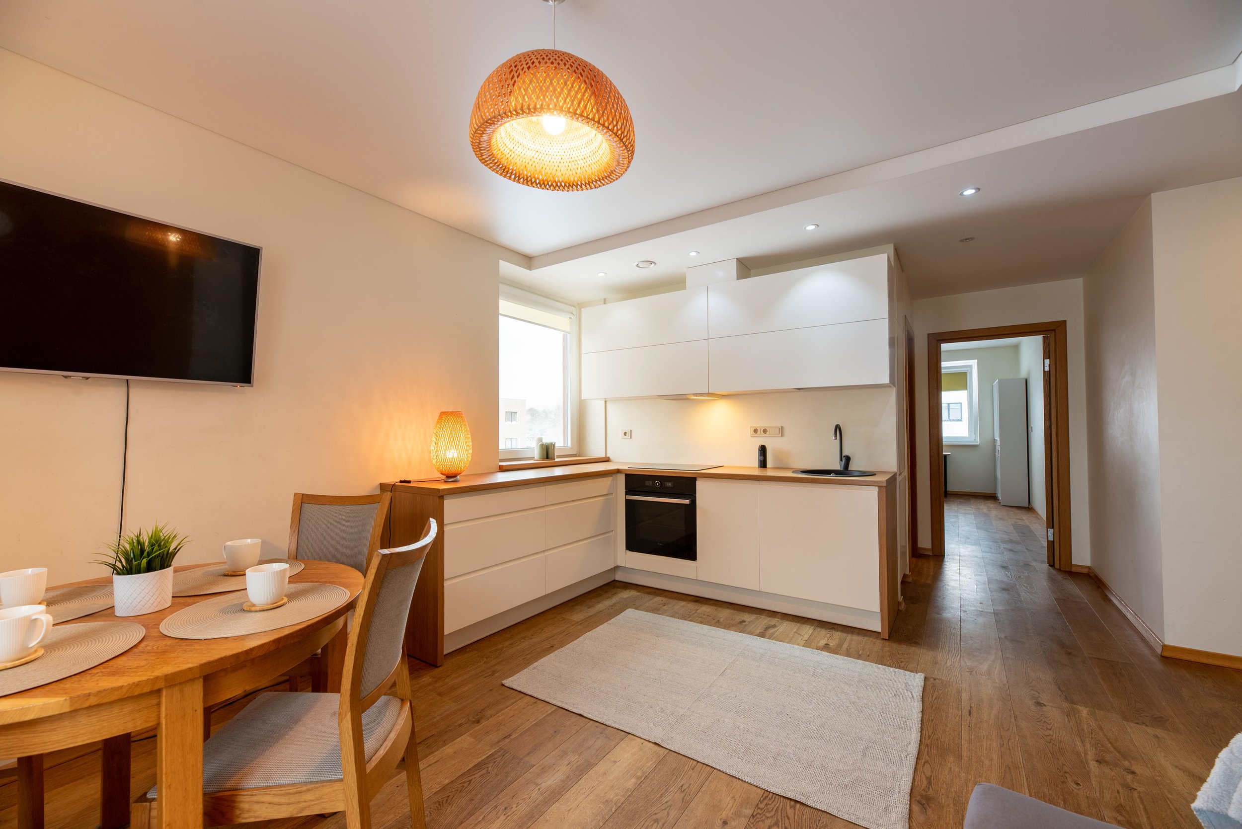 - Vyrauja estetika, ergonomika, funkcionalumas (virtuvės komplektas su automatine Blum sistema, universalaus kambario stalas bambuko stalviršiu reguliuojamo aukščio)